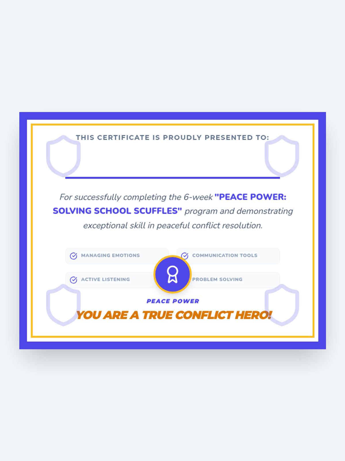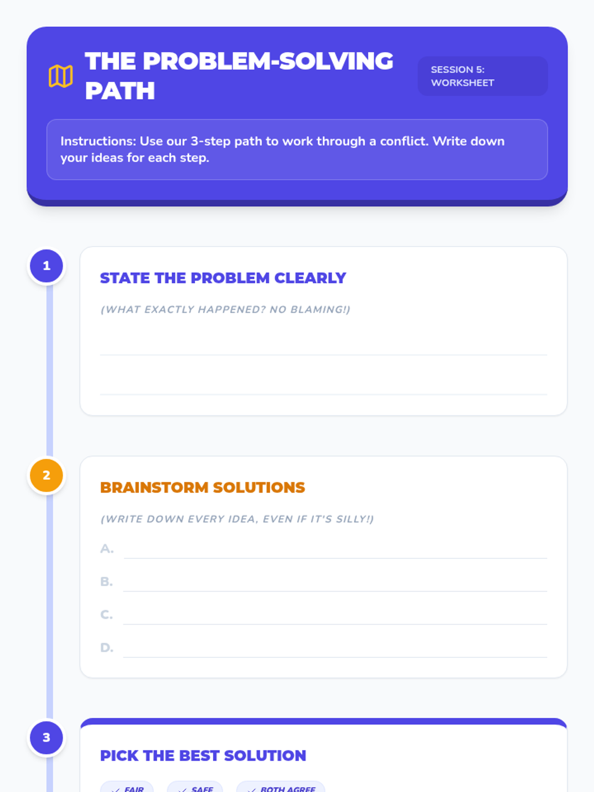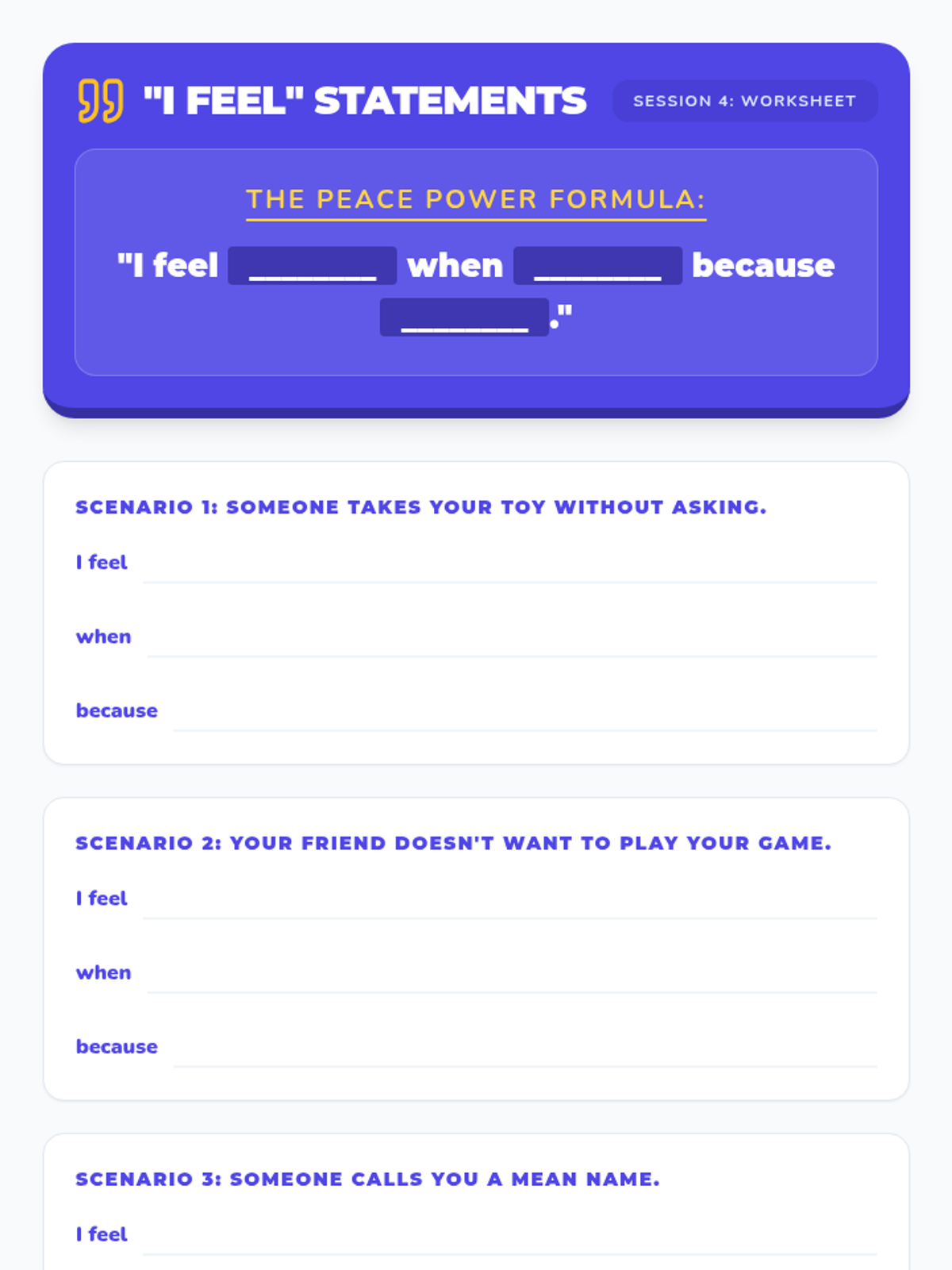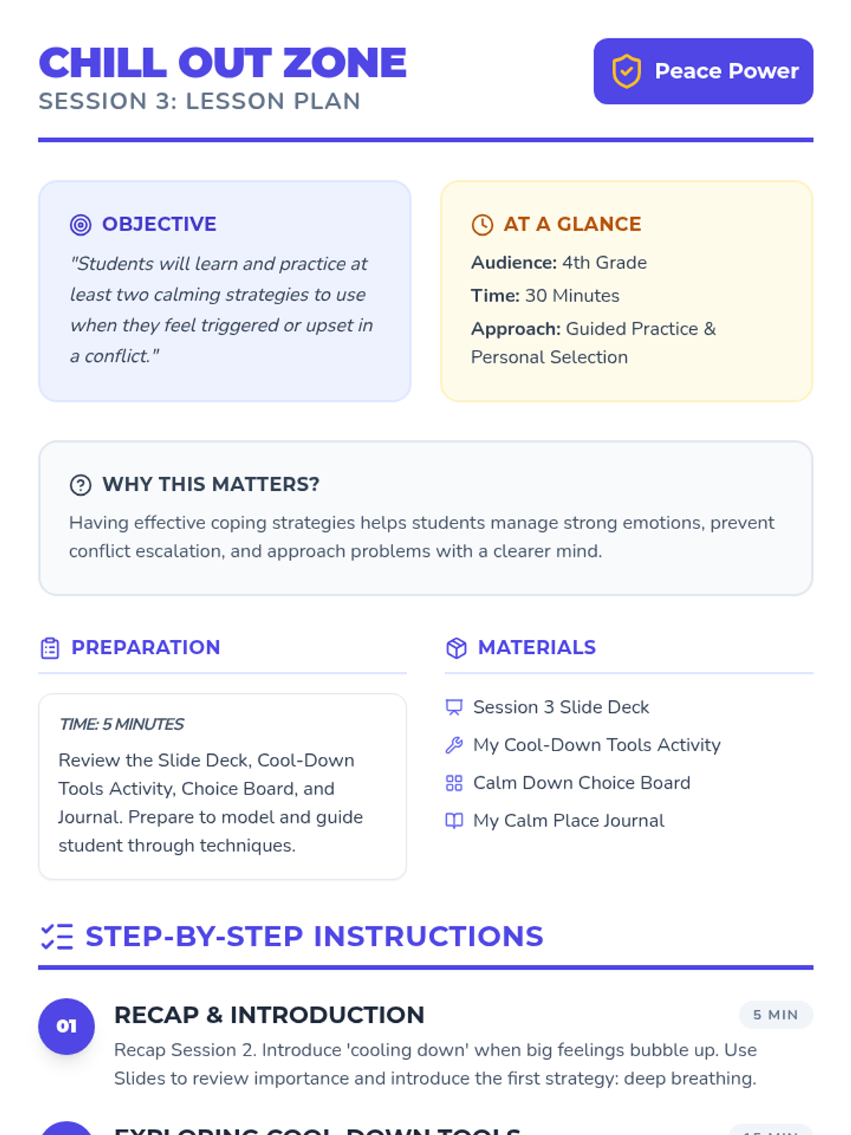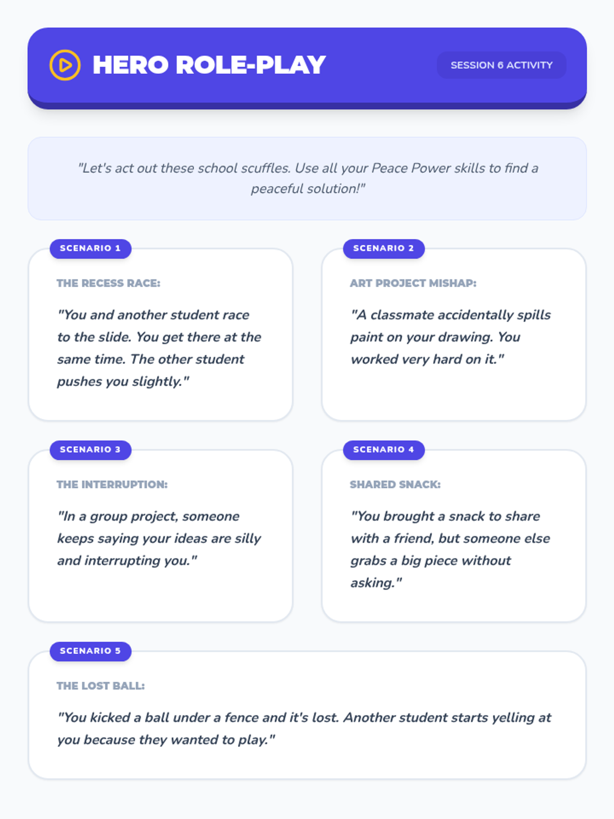 A 6-week individual counseling program for 4th-grade students to develop conflict resolution skills, moving from understanding conflict to demonstrating peaceful solutions in real-world scenarios.