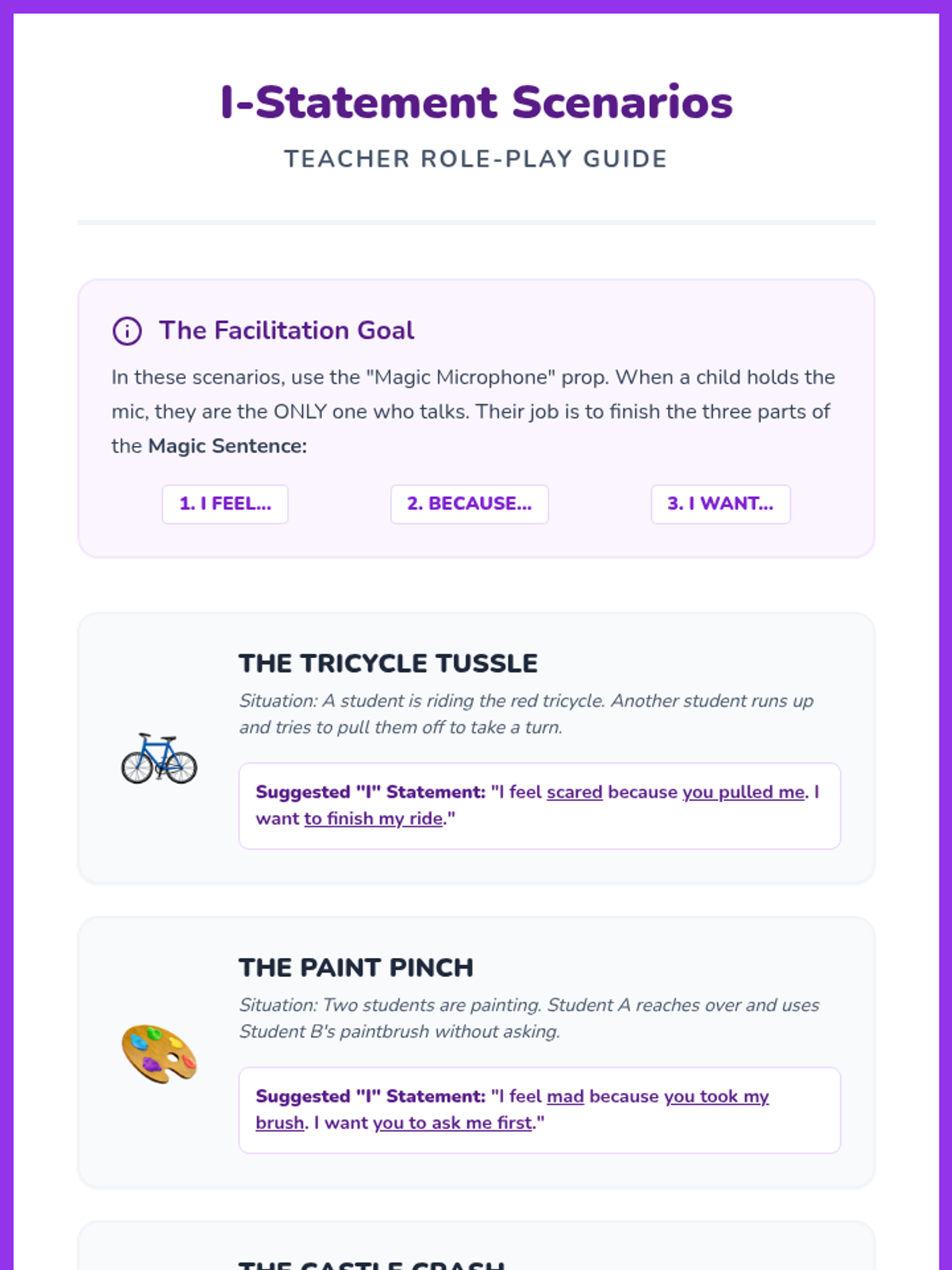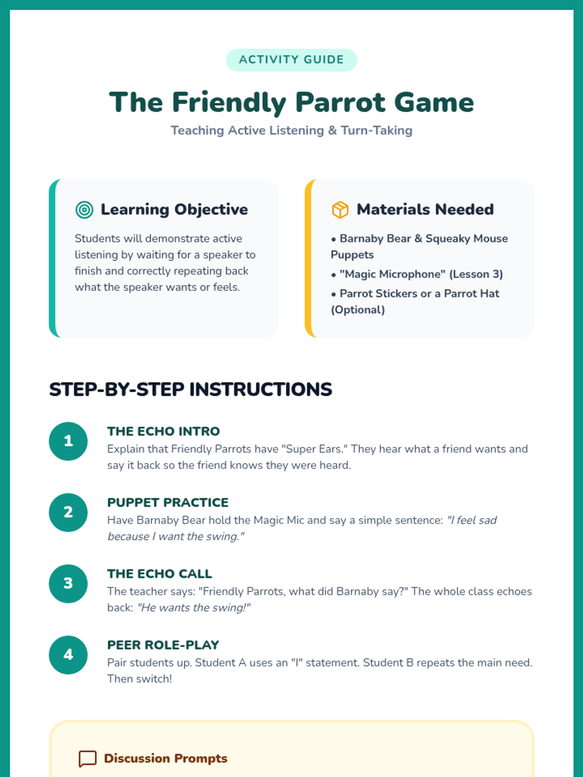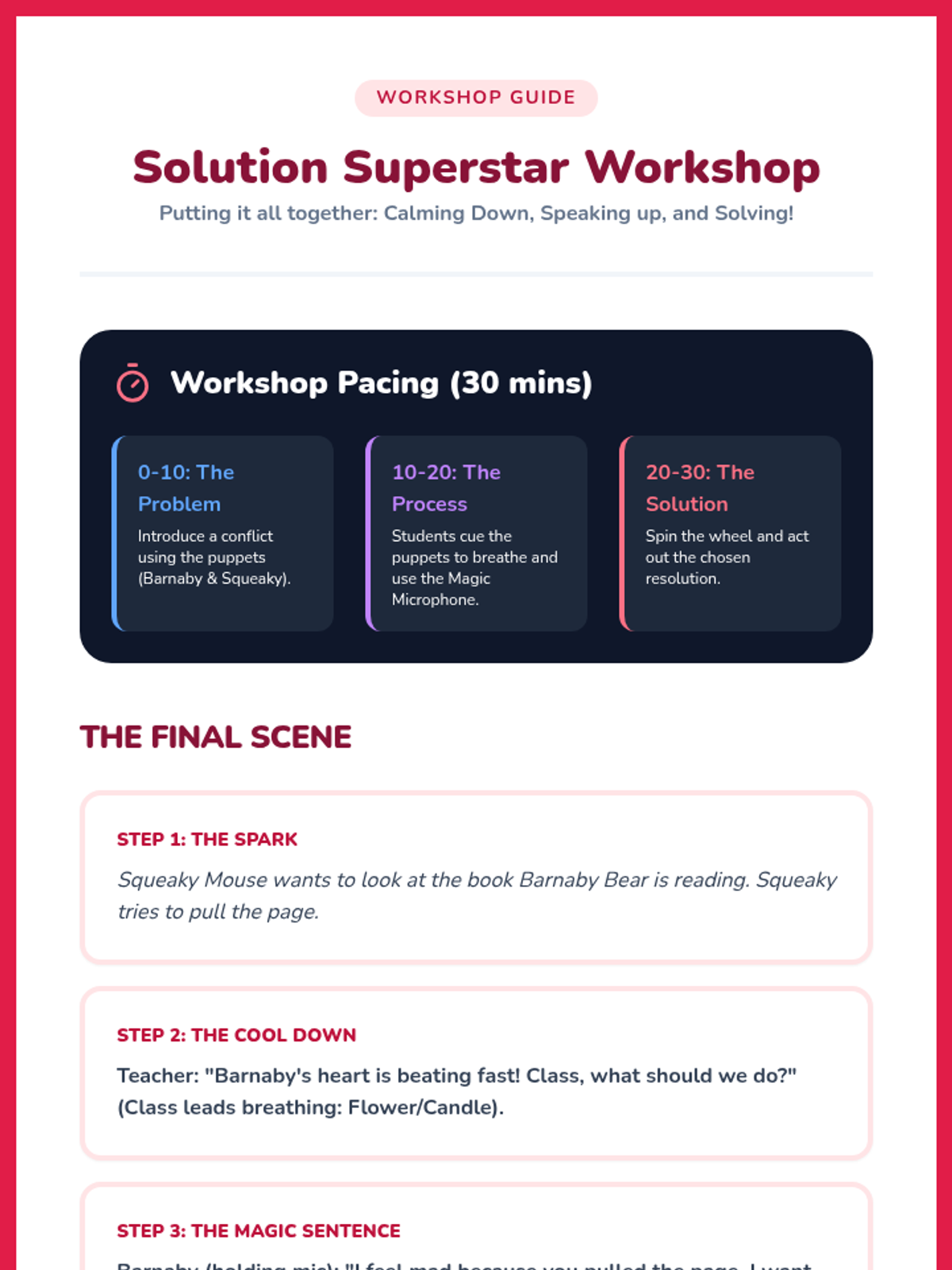 A Pre-K sequence focused on teaching foundational conflict resolution skills through puppetry, role-play, and visual tools like the Solution Wheel. Students move from identifying emotions to practicing de-escalation, assertive communication, and collaborative problem-solving.