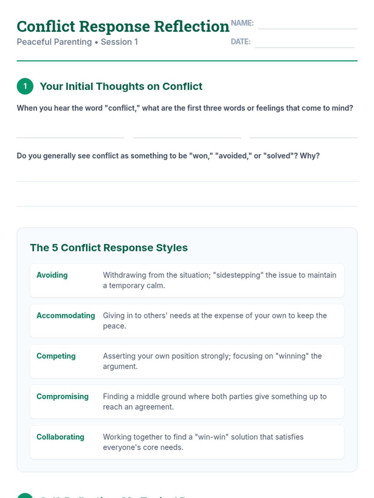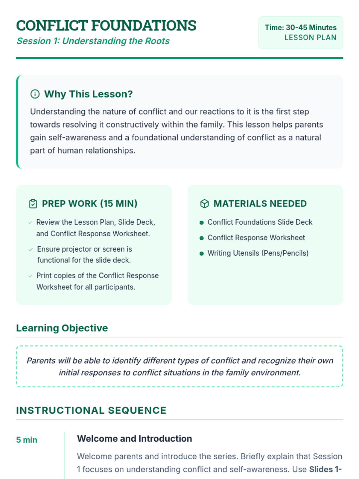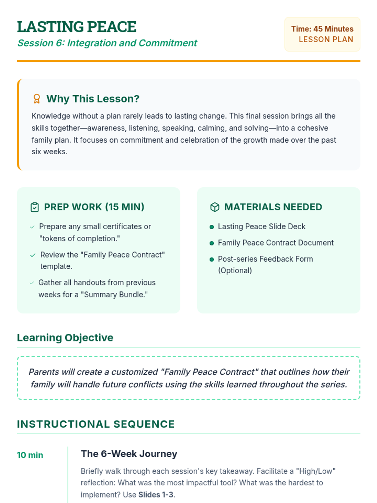 A comprehensive six-session series designed for parents to master conflict resolution strategies, fostering a more peaceful and empathetic family environment through practical skills and self-reflection.