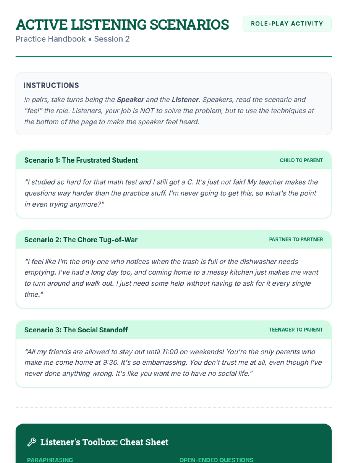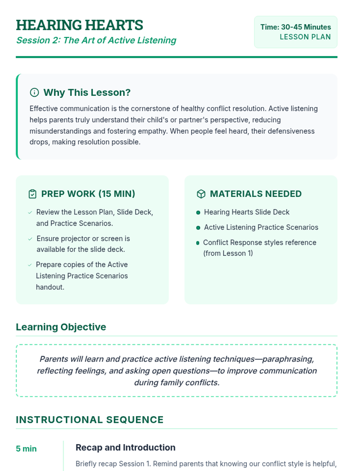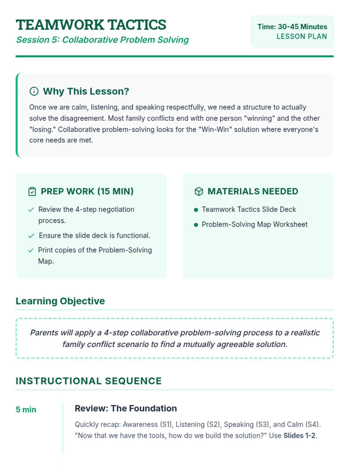 A comprehensive six-session series designed for parents to master conflict resolution strategies, fostering a more peaceful and empathetic family environment through practical skills and self-reflection.