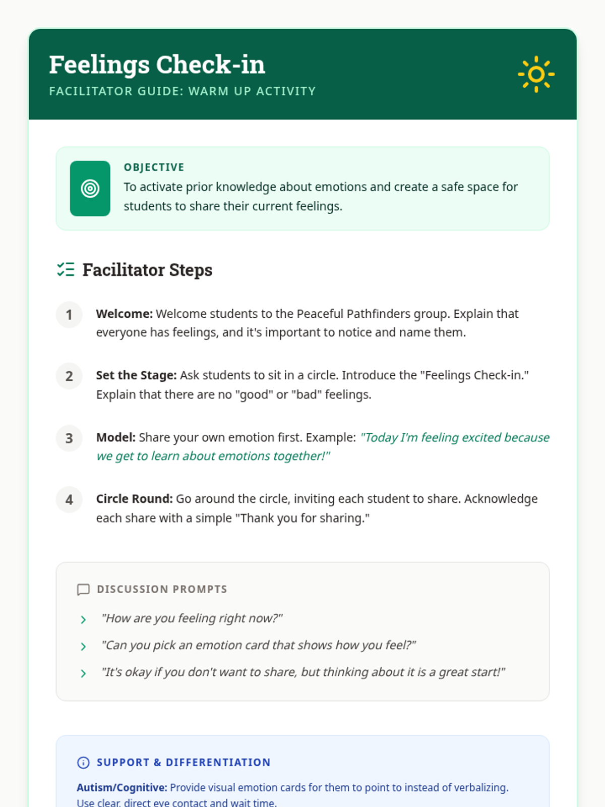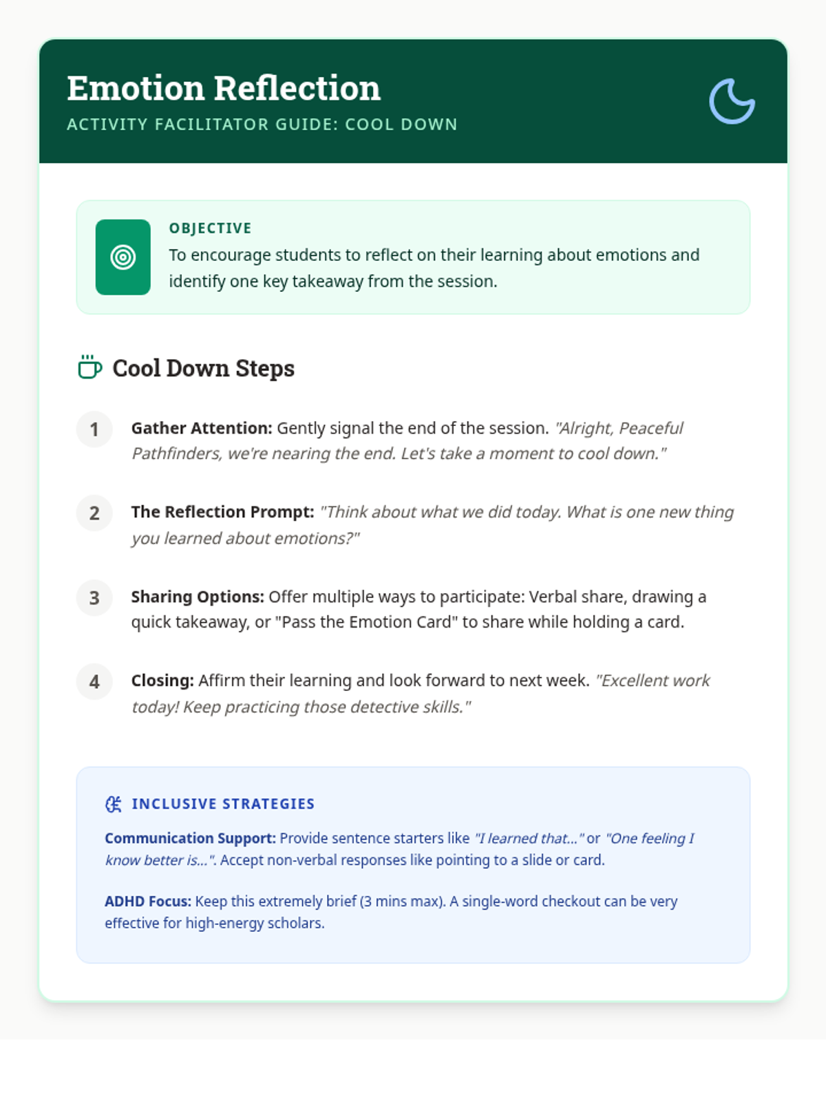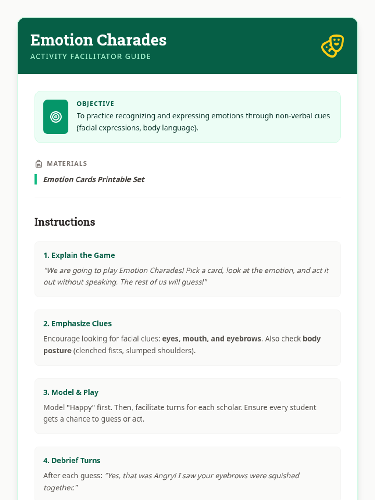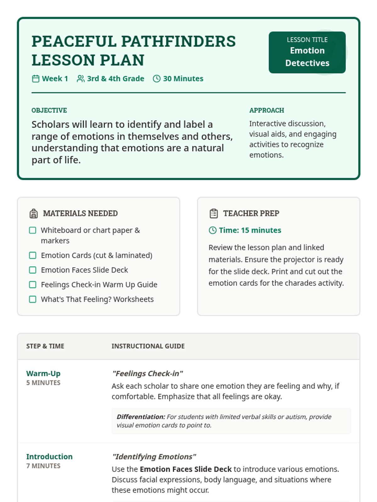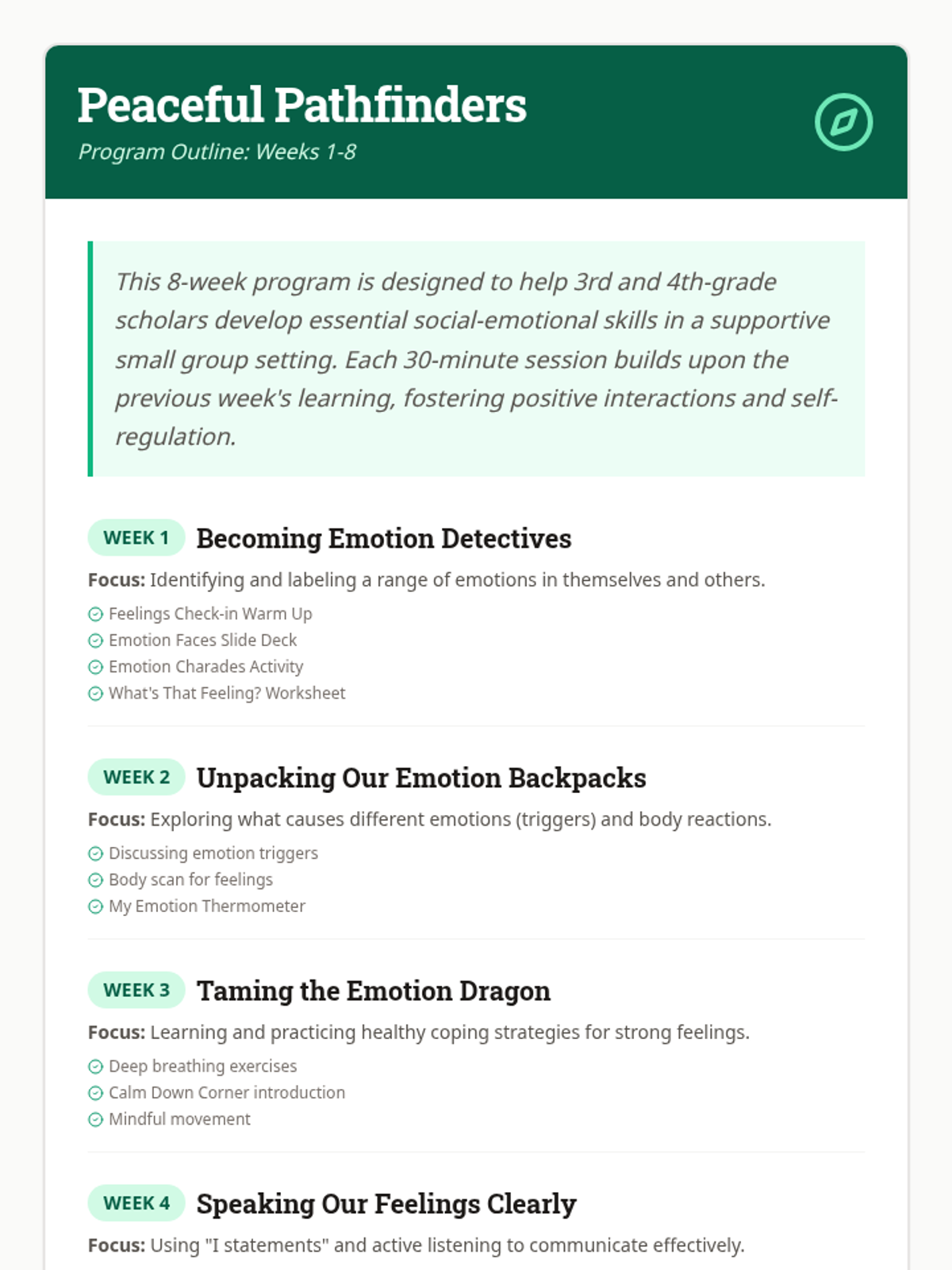 An 8-week Tier 2 social-emotional learning program for 3rd and 4th grade scholars, focusing on conflict resolution, emotion management, and effective communication.