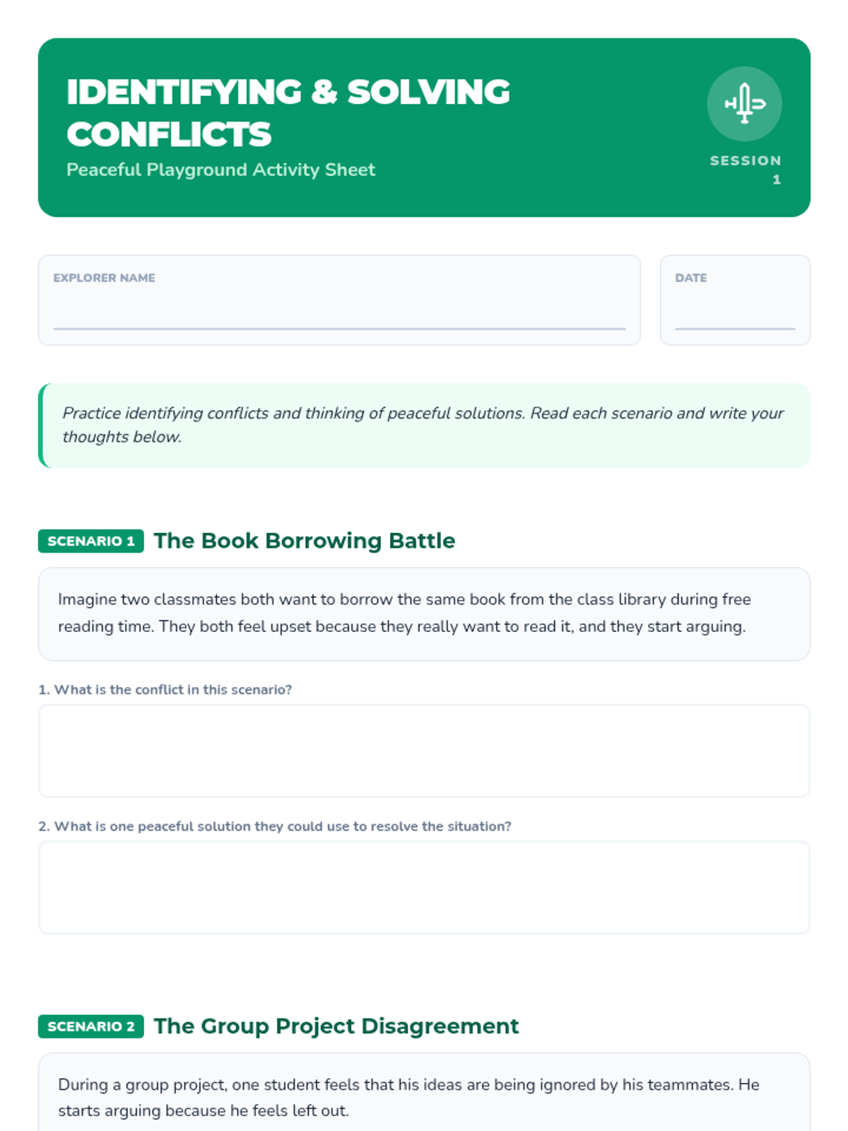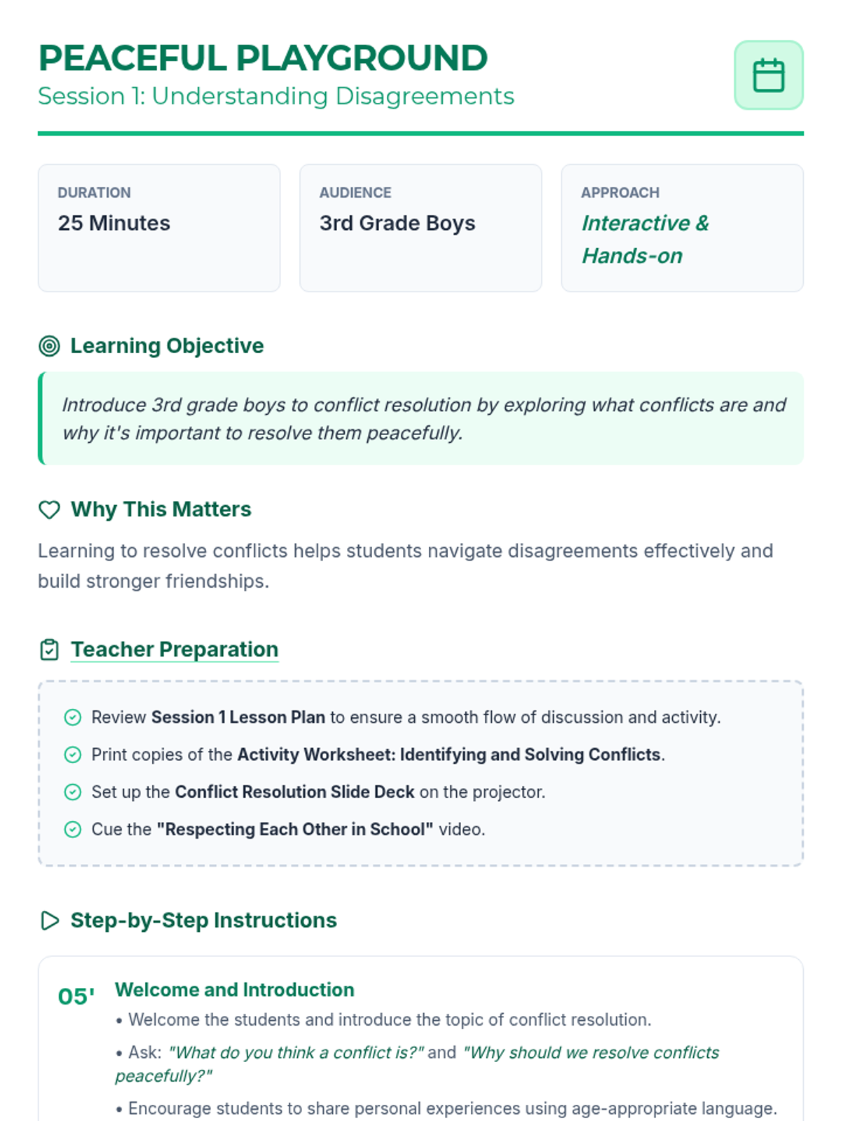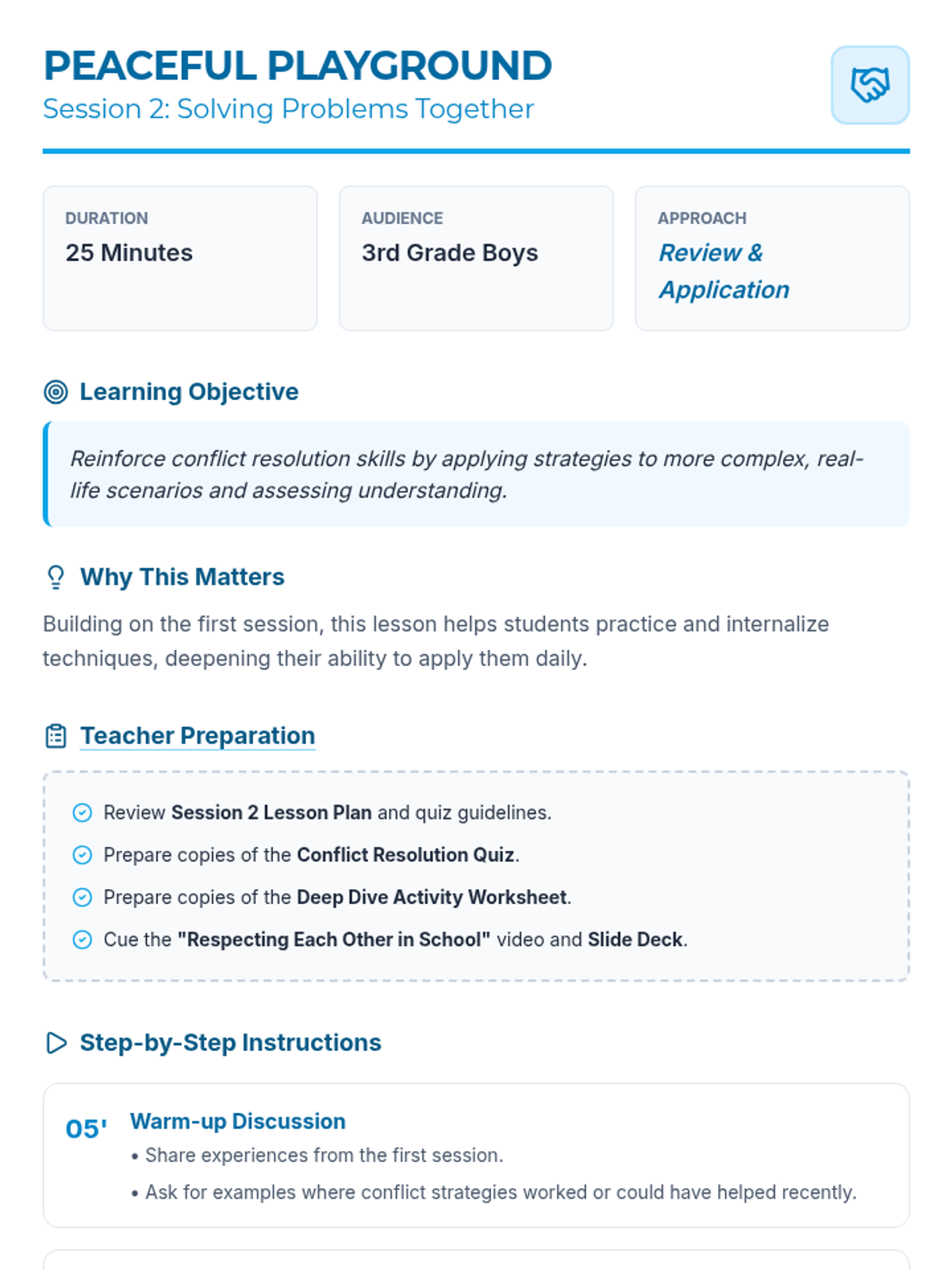 A two-session sequence for 3rd-grade boys focusing on identifying, understanding, and resolving conflicts through playground-themed activities and discussions.