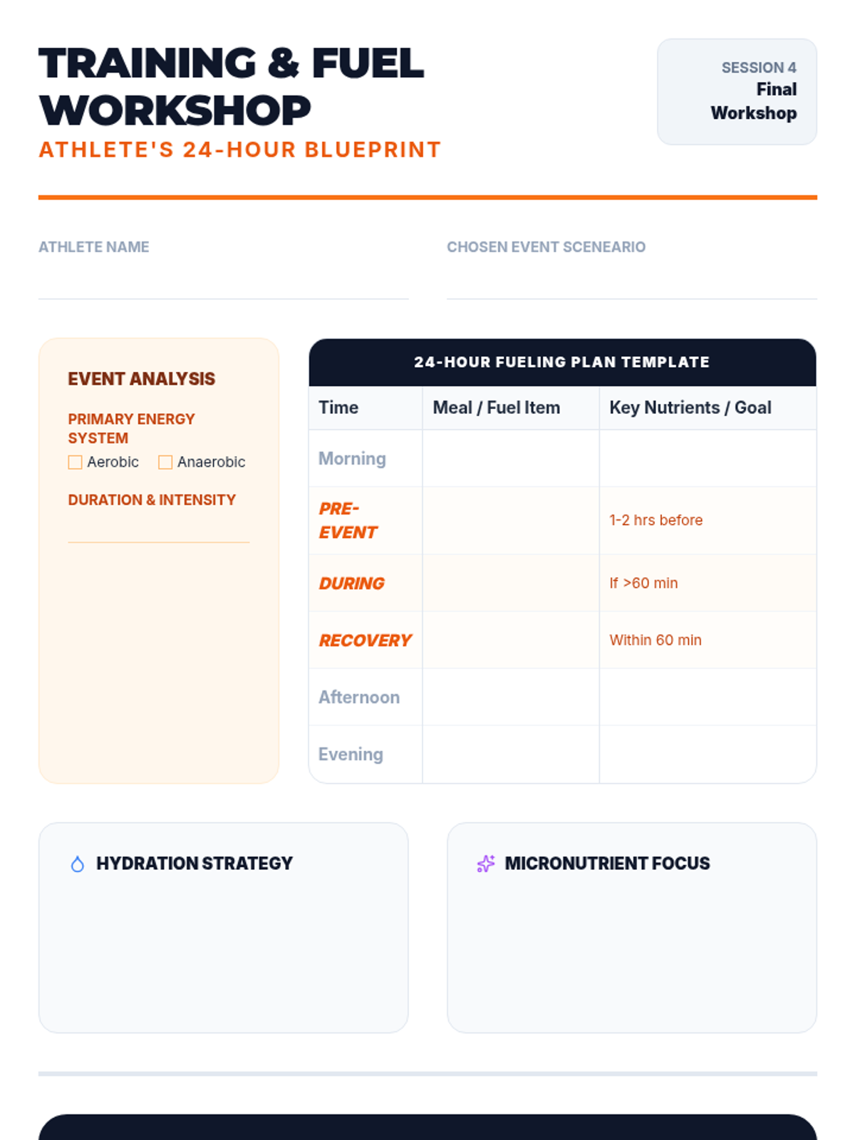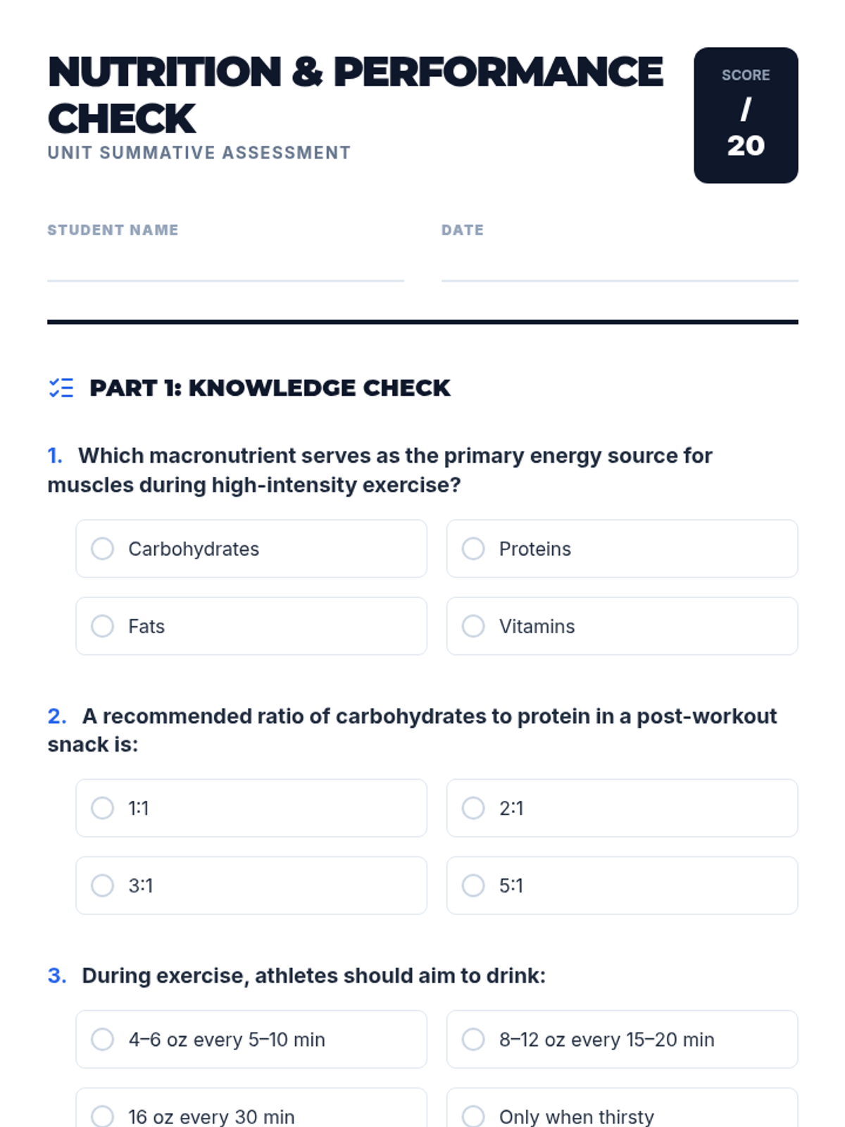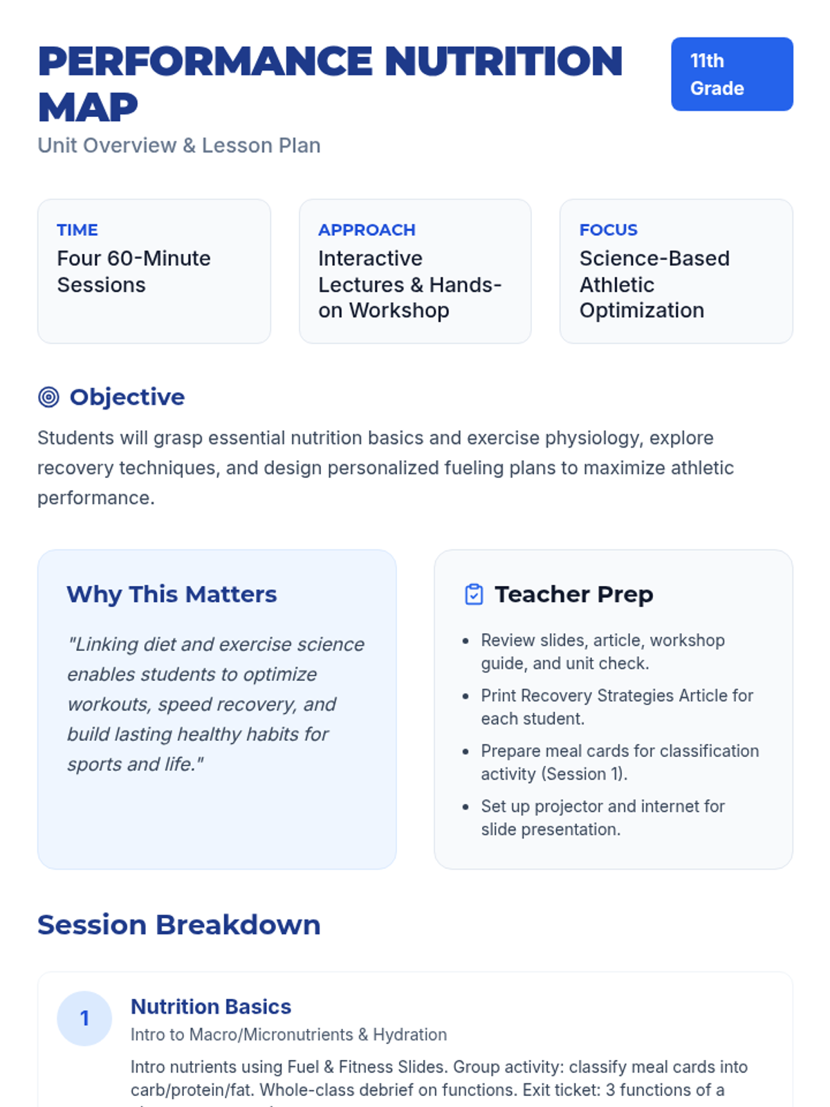 A comprehensive four-session unit for 11th graders exploring the intersection of nutrition science and exercise physiology to optimize athletic performance and recovery.