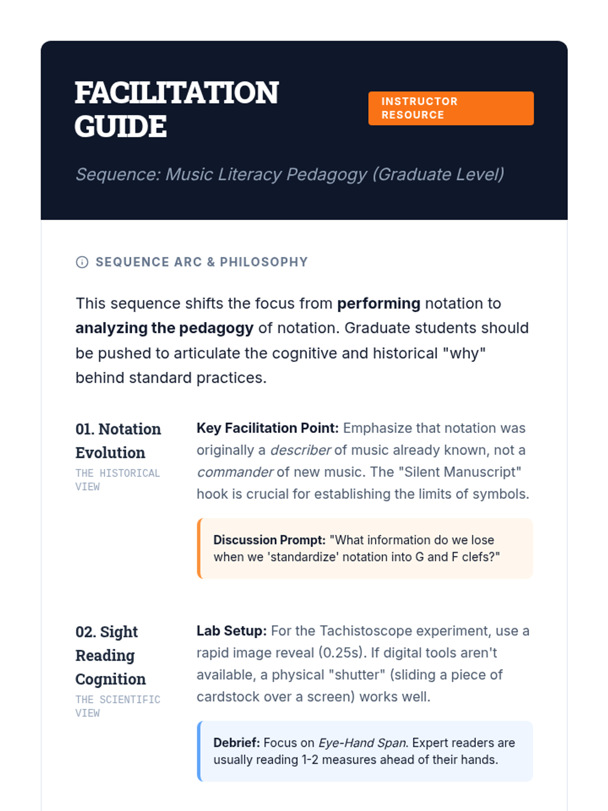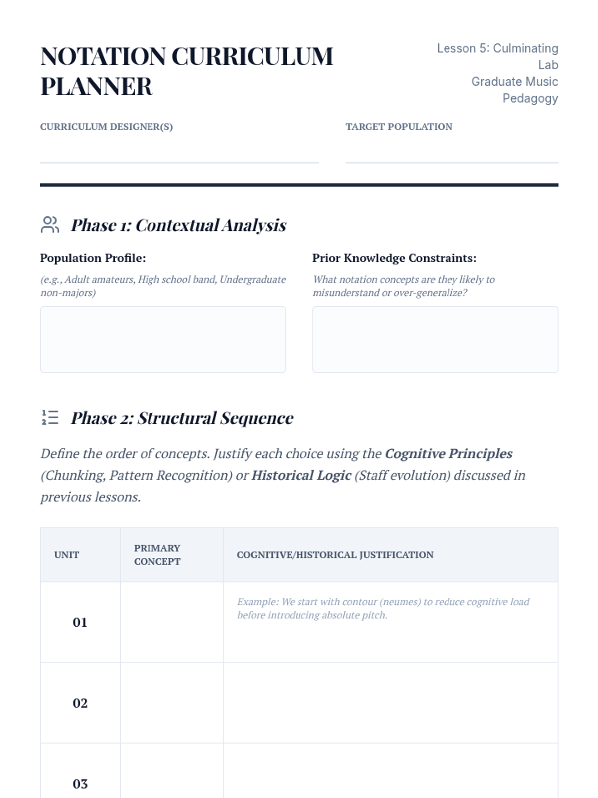 This sequence examines the evolution and cognitive mechanics of Western musical notation, designed for graduate students focusing on music education or musicology. Students will analyze the historical development of the staff, clefs, and accidentals, while simultaneously evaluating various pedagogical methodologies used to teach music literacy.