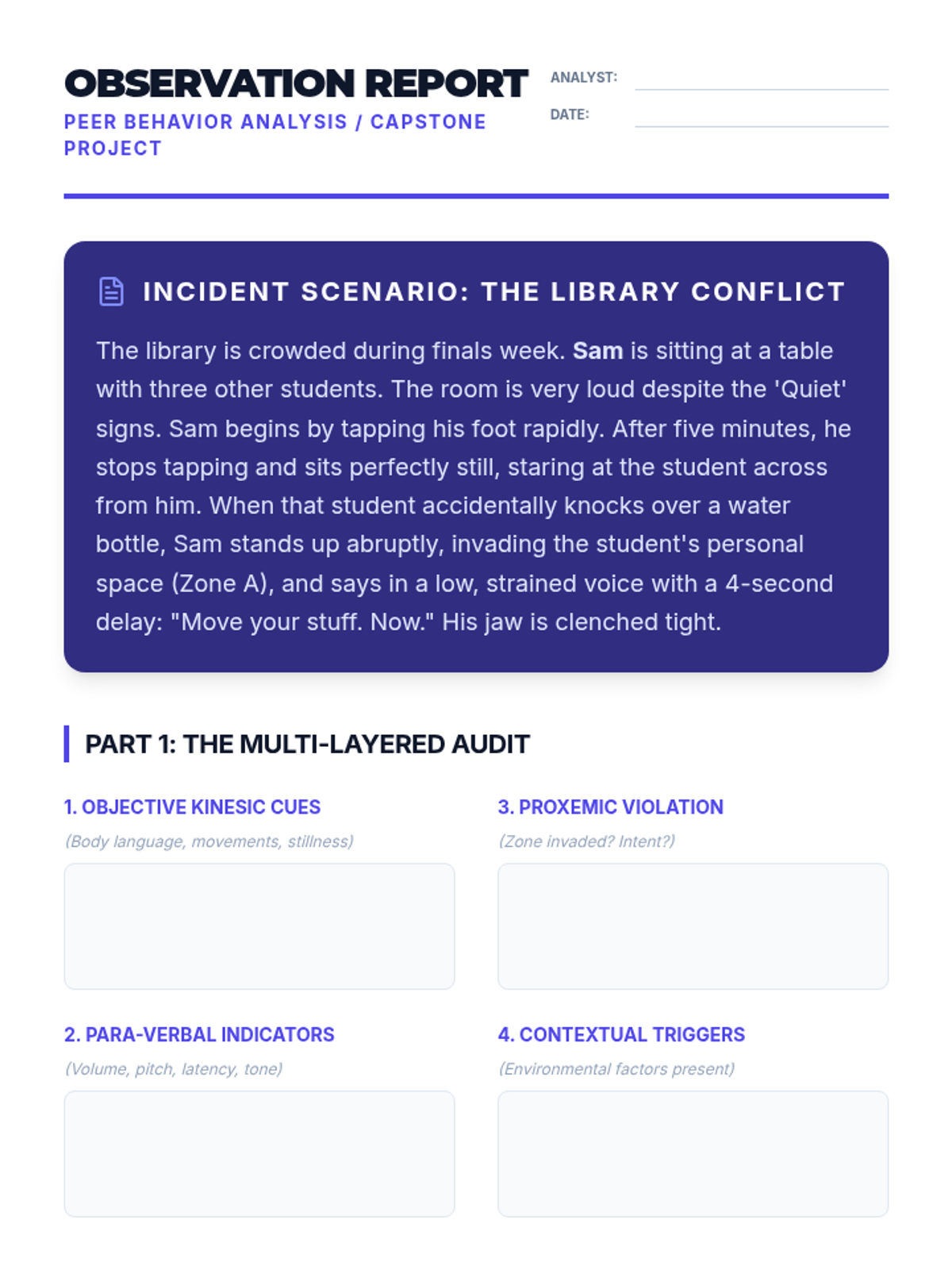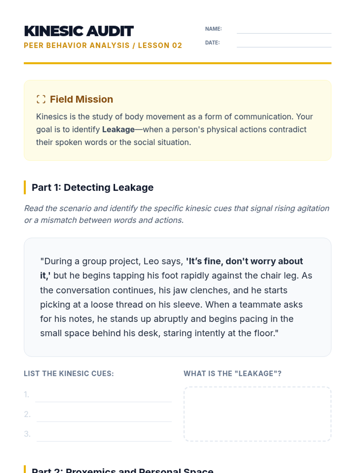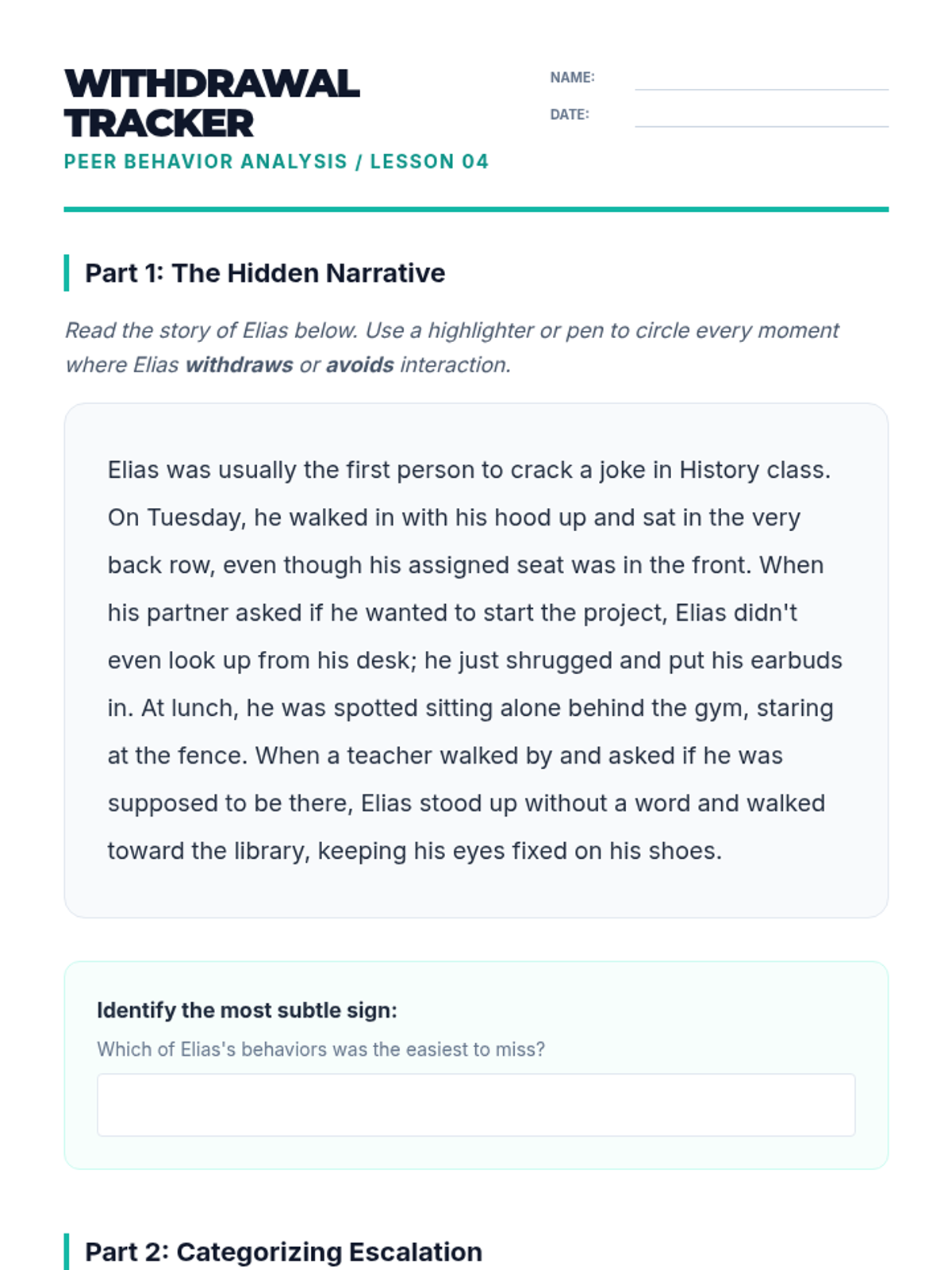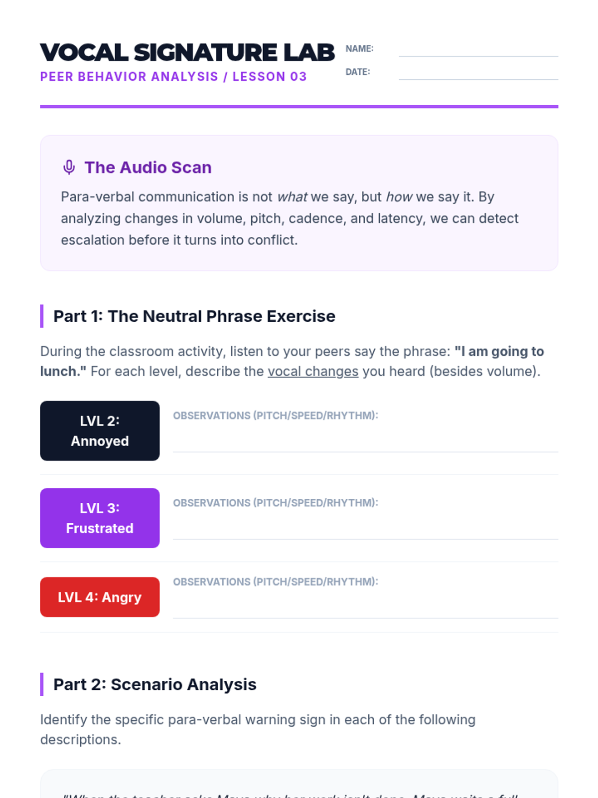 A 5-lesson sequence for 9th-grade students focused on developing social awareness and safety by identifying peer behavioral shifts and escalation warning signs through objective observation and non-verbal analysis.