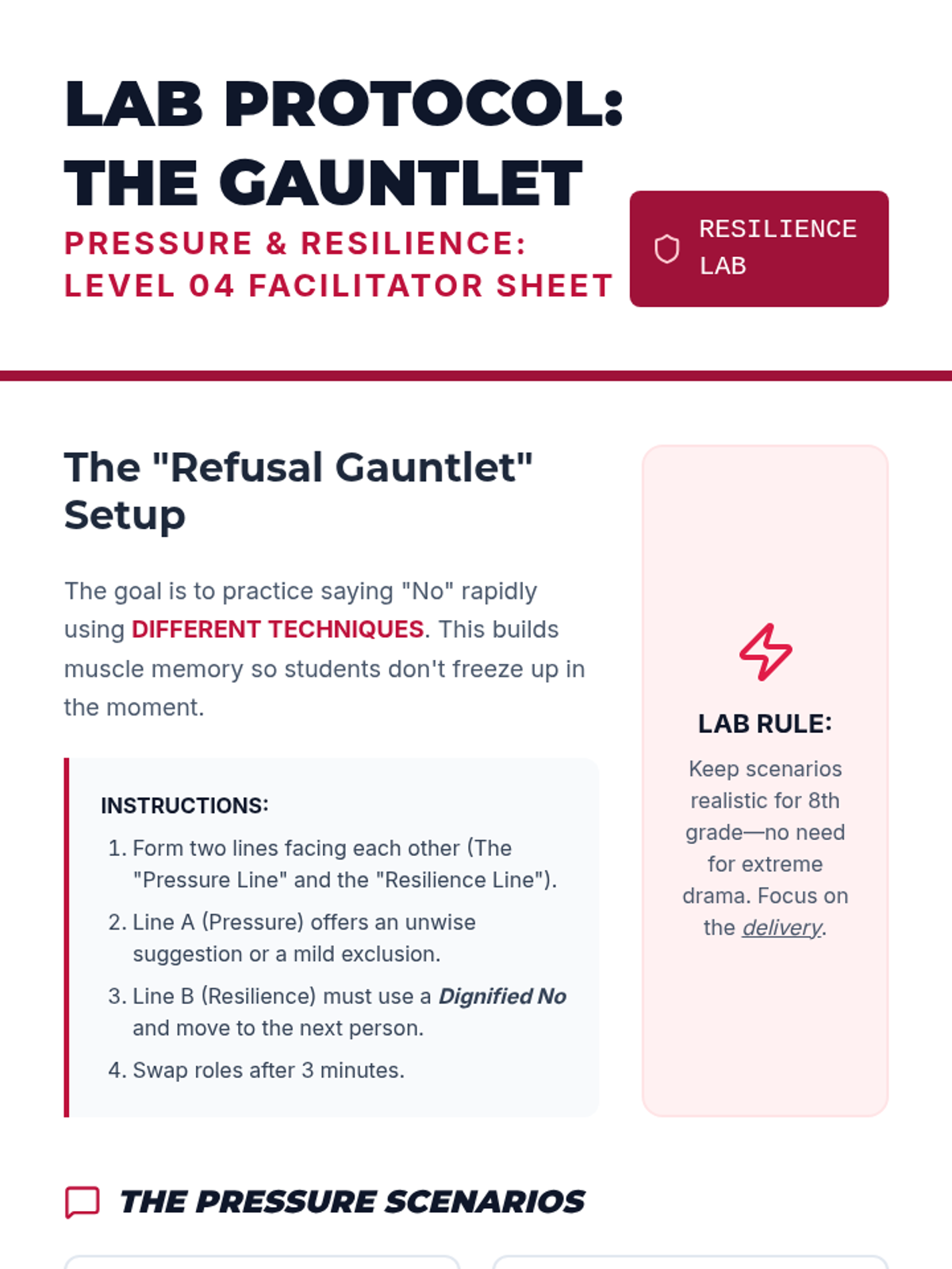 A 5-lesson sequence for 8th-grade social communication, focusing on simulating and role-playing social solutions to peer disagreements. Students move from decoding non-verbal cues to iterative role-play (The Rewind Technique) and specific academic and peer-pressure scenarios, ending with peer feedback.