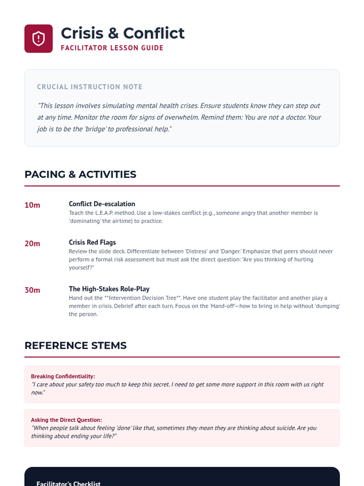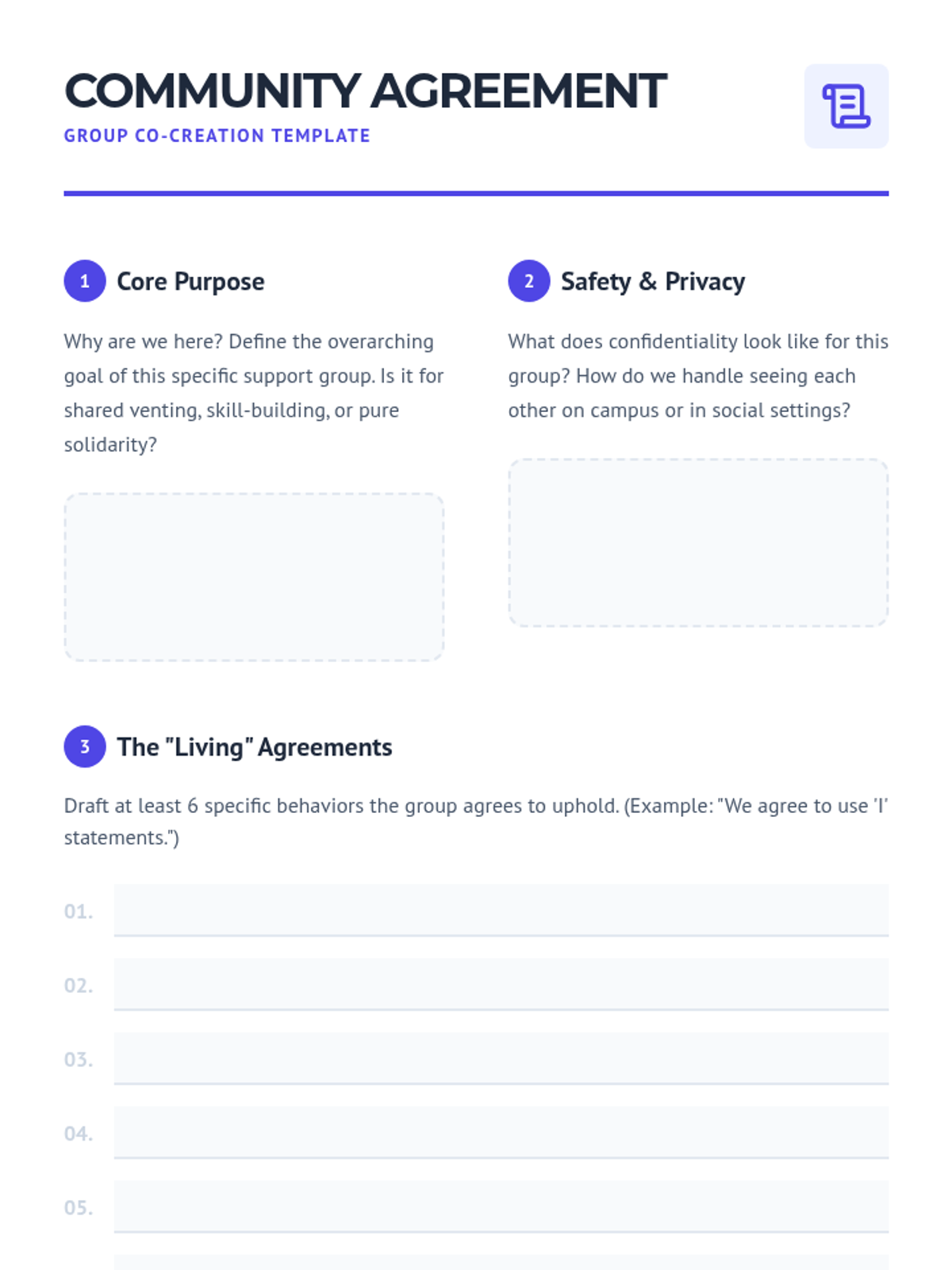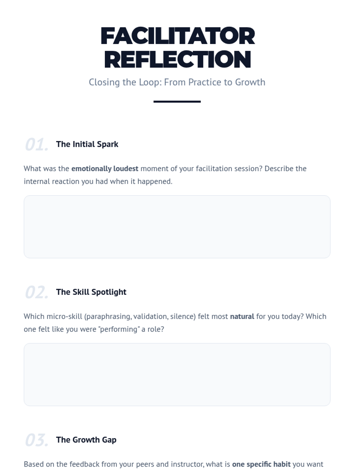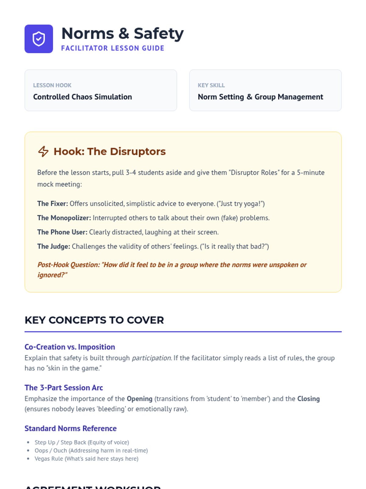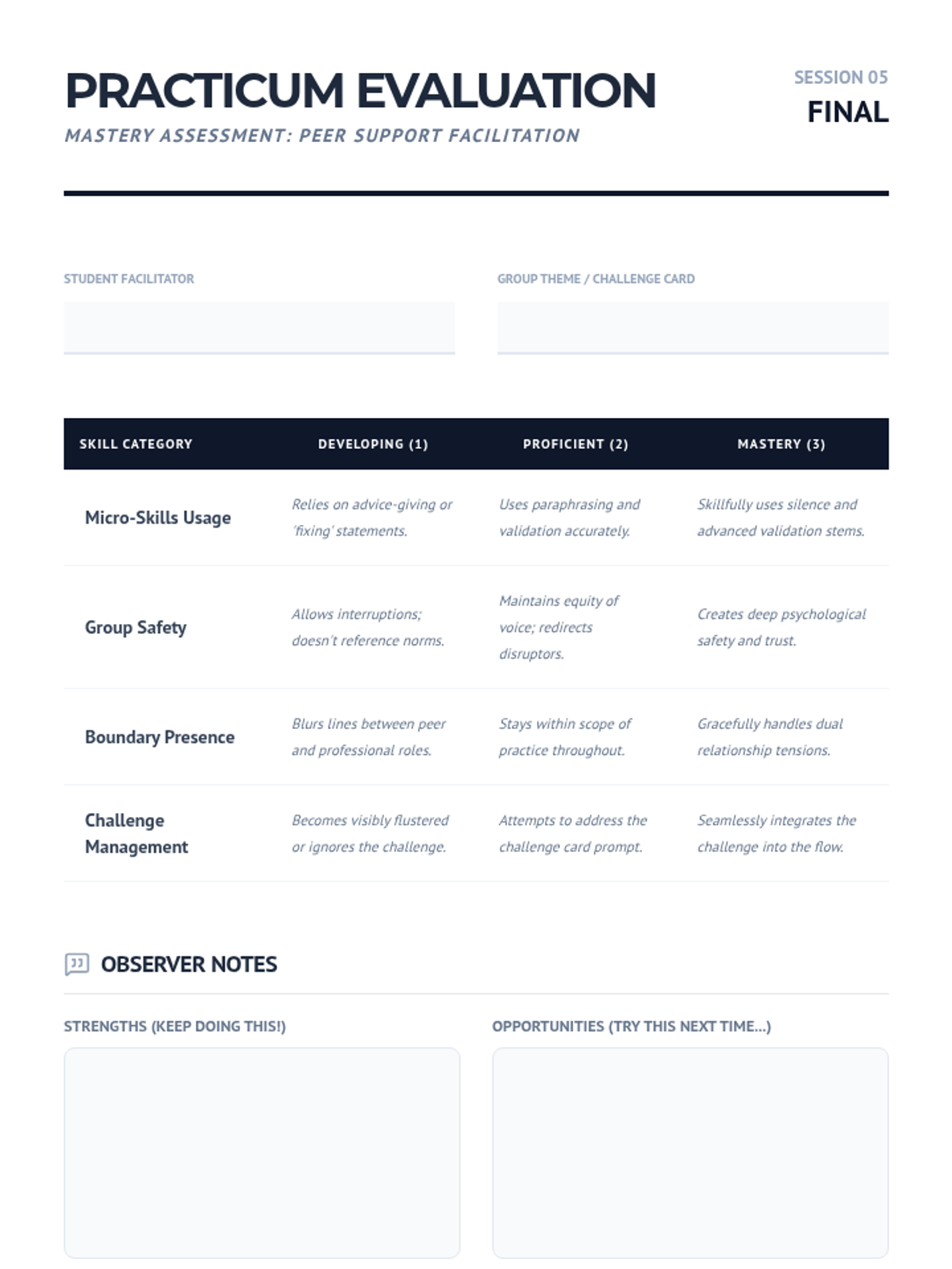 This sequence prepares undergraduate students to facilitate peer-led mental health support groups. It covers ethical boundaries, group safety, advanced communication skills, crisis protocols, and concludes with a practical facilitation session.