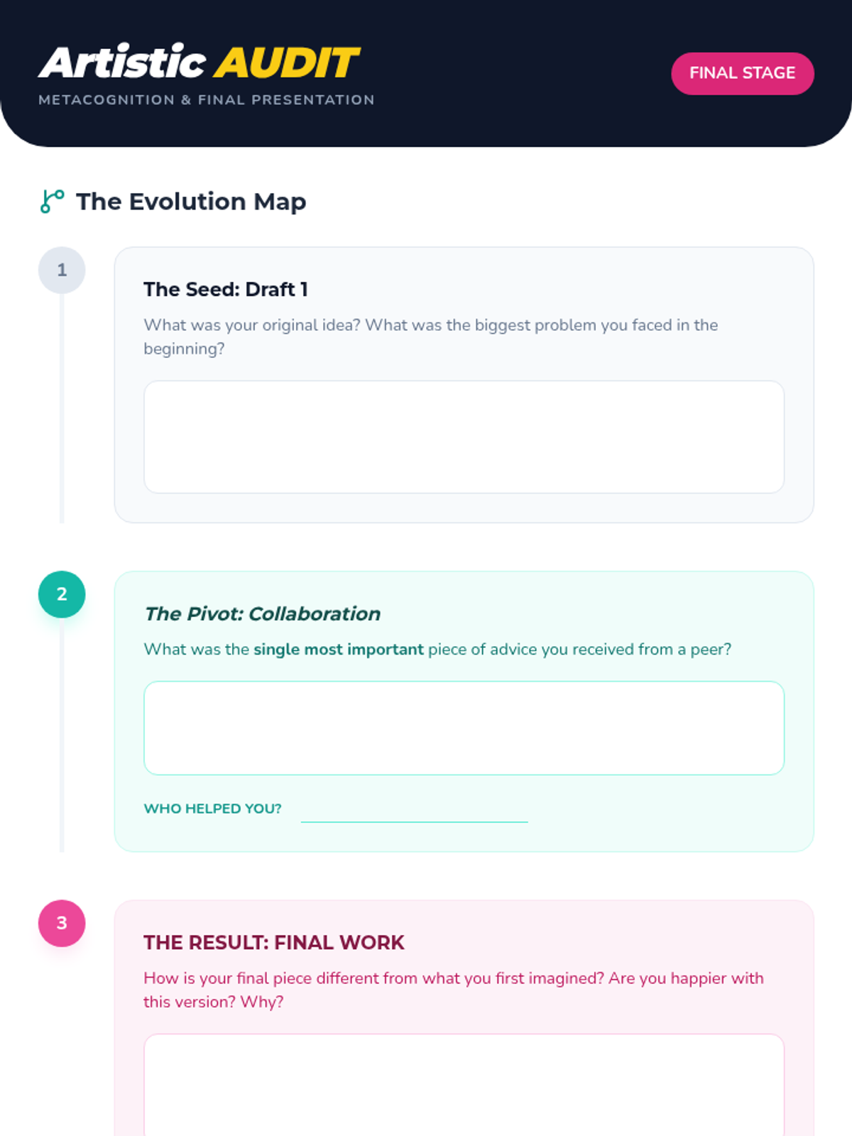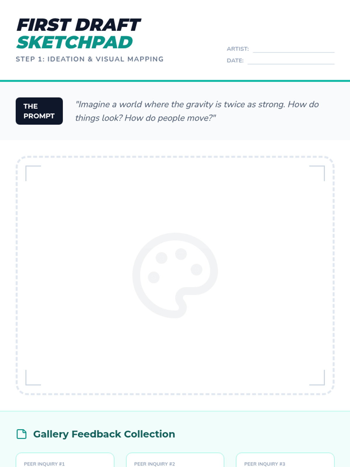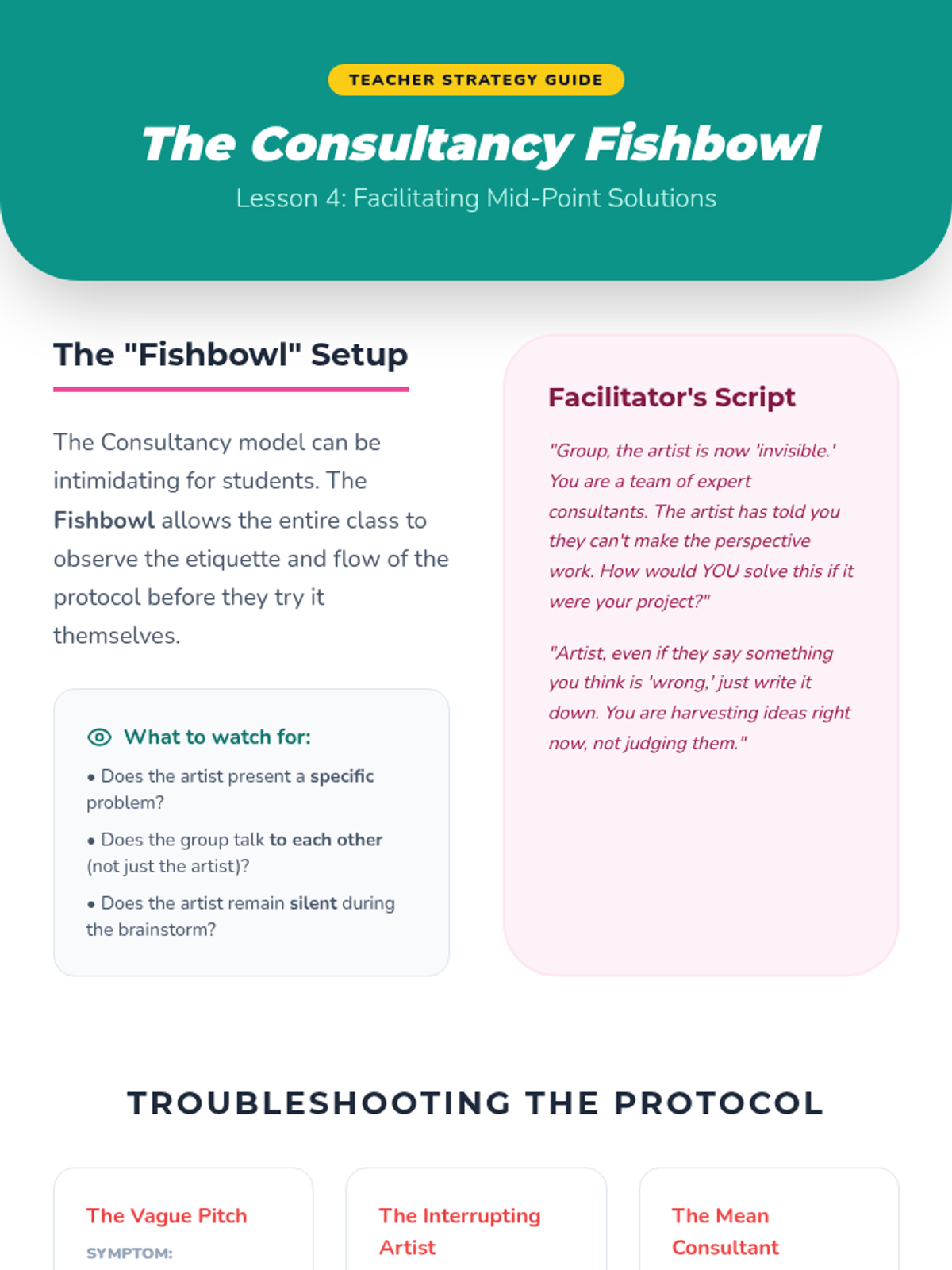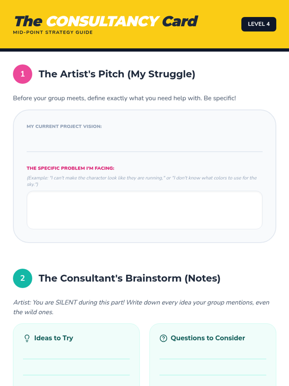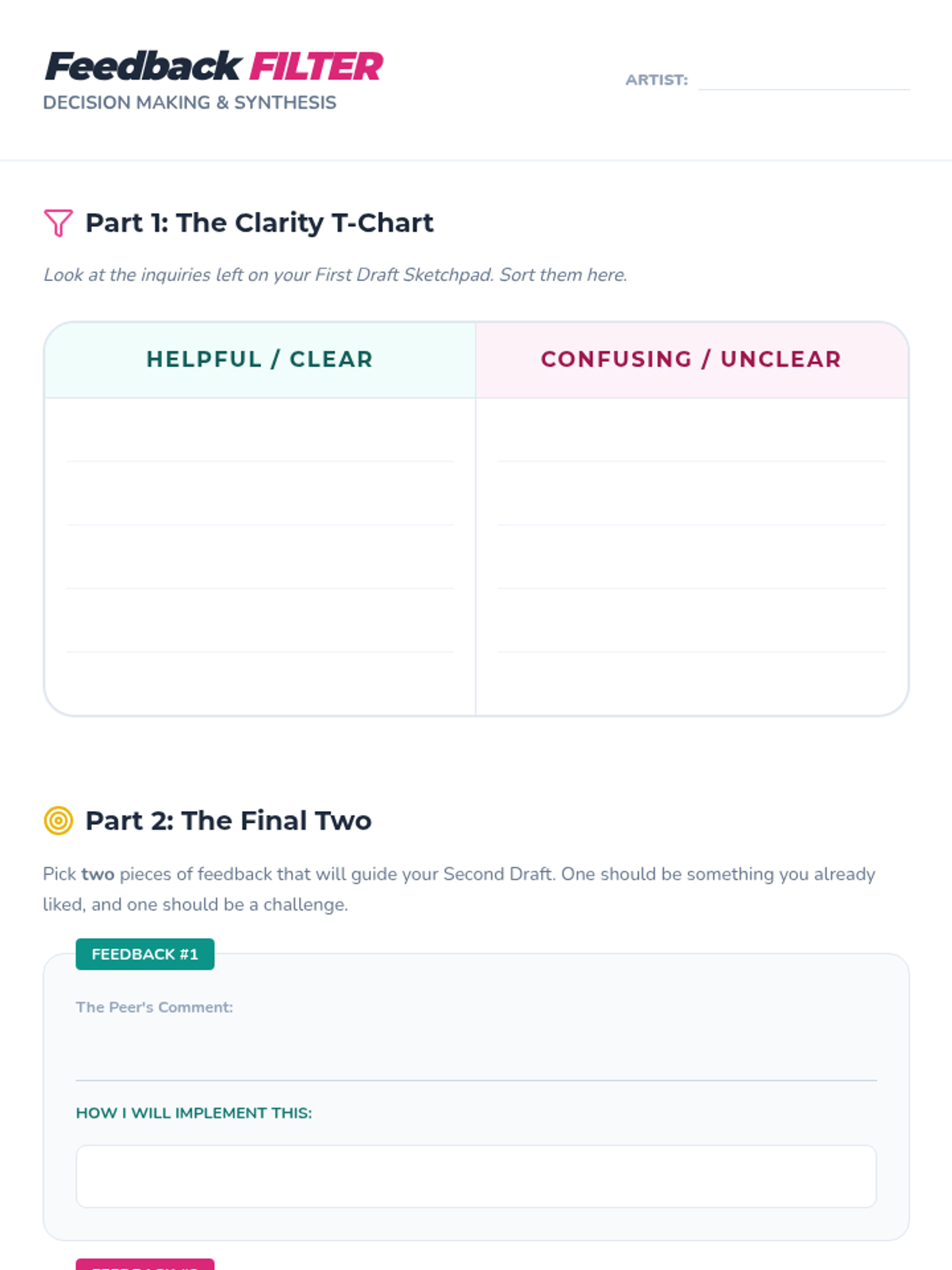 A 5th-grade arts sequence focused on the iterative process of creation through structured peer feedback, moving from initial drafts to final refined artworks using specific critique protocols.