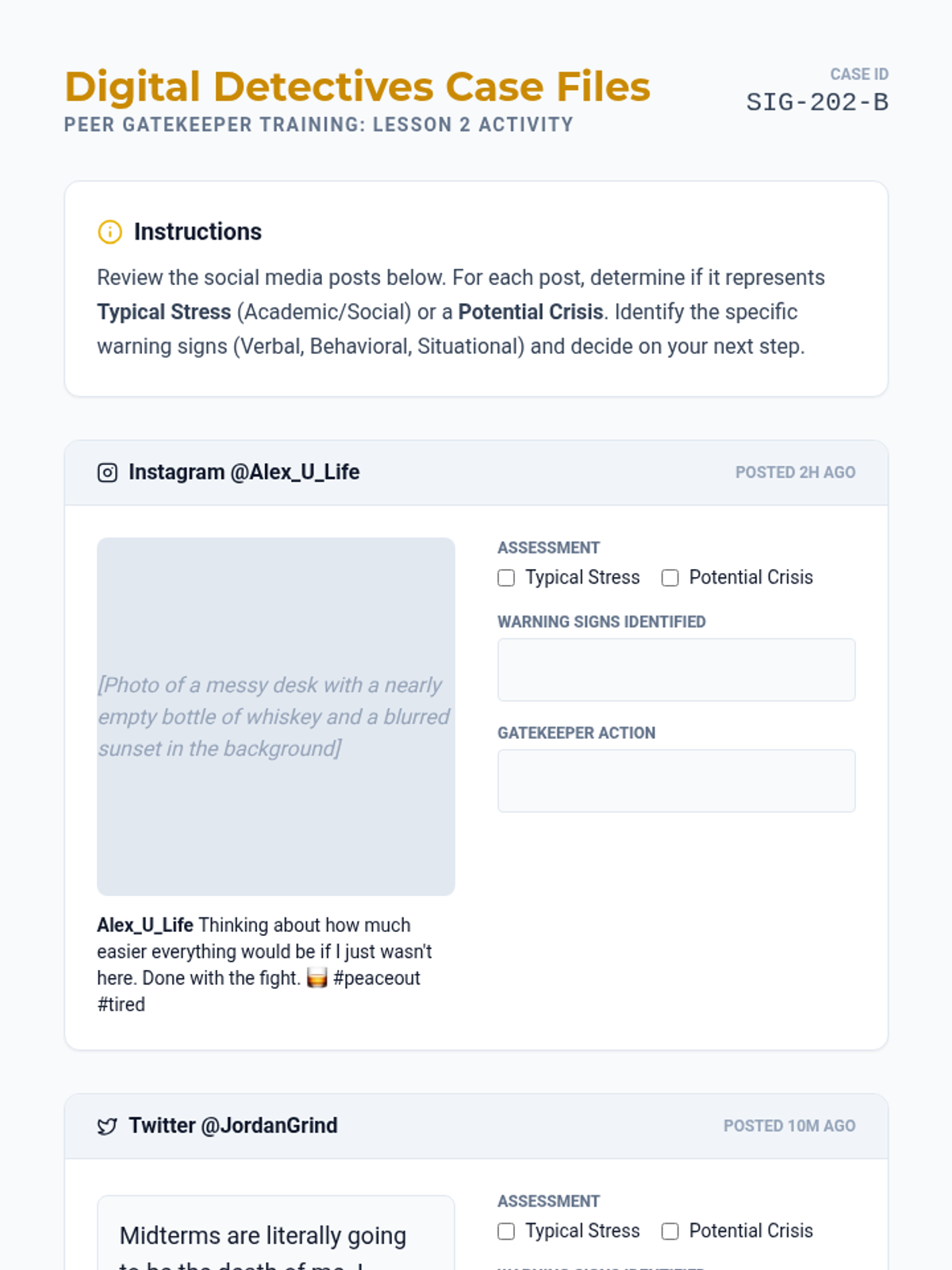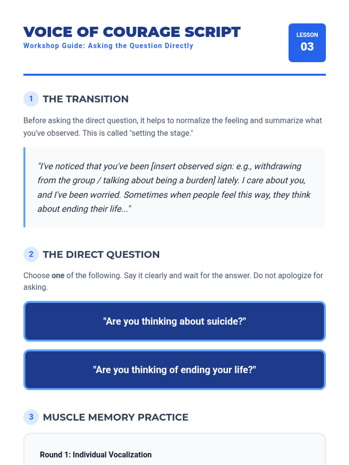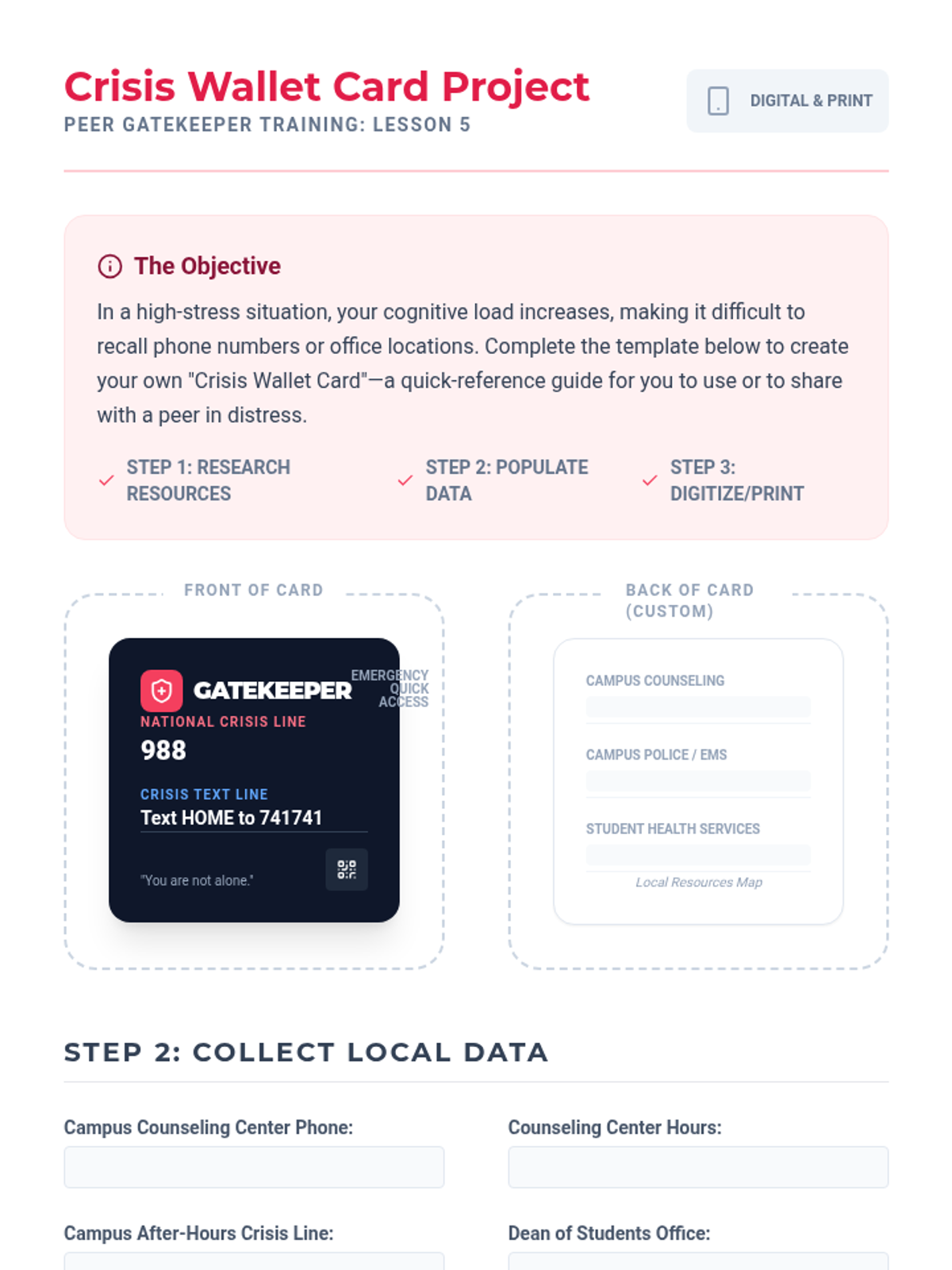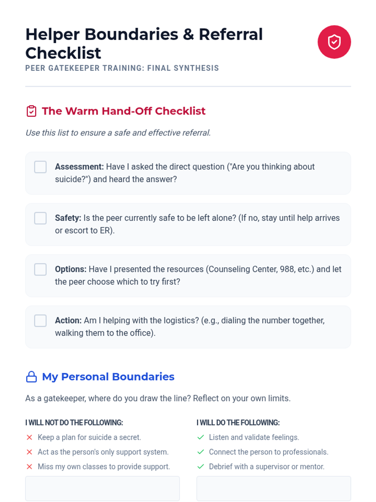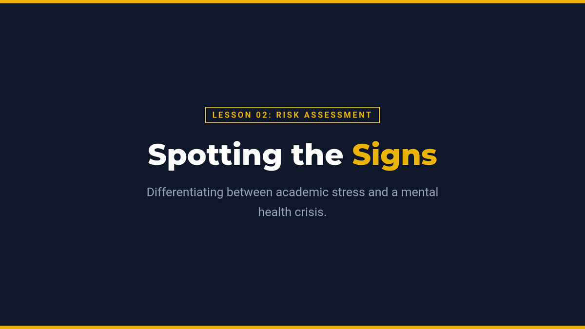 A comprehensive training sequence for undergraduate students to become effective mental health gatekeepers, focusing on identifying crisis signs, direct intervention, and referral pathways.