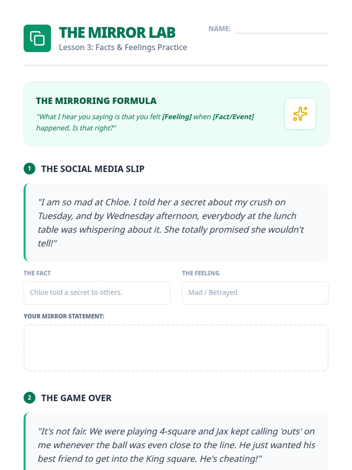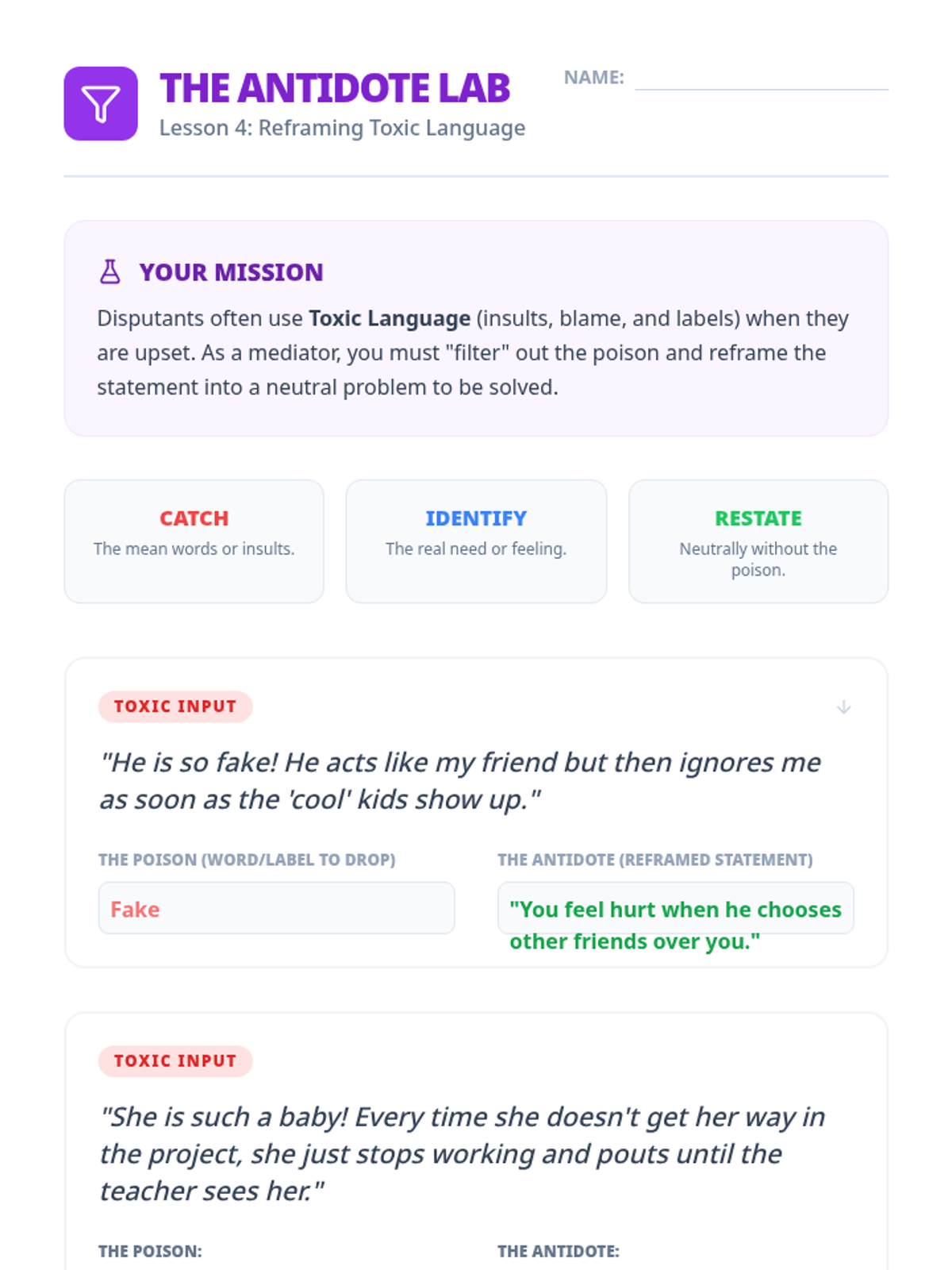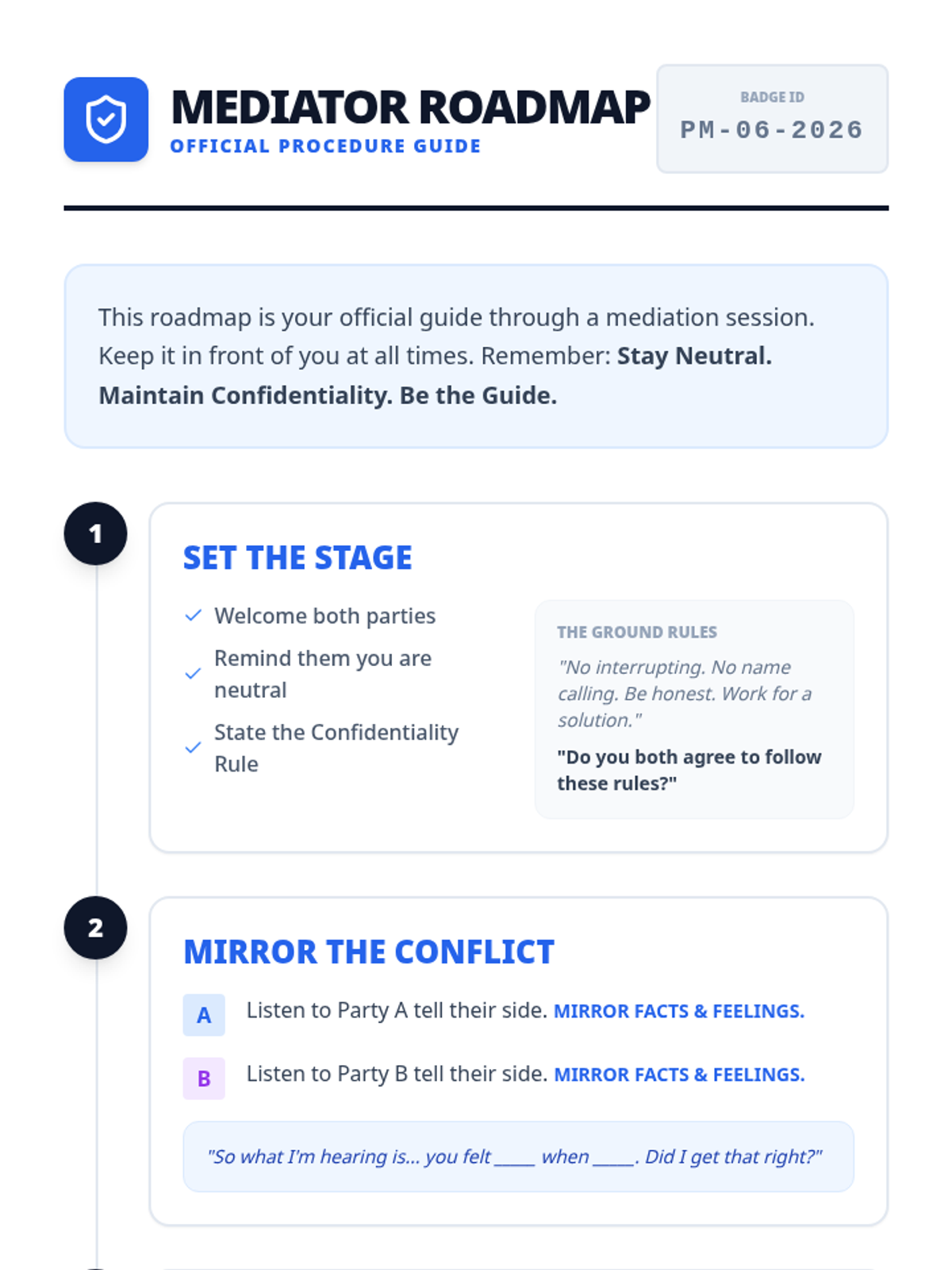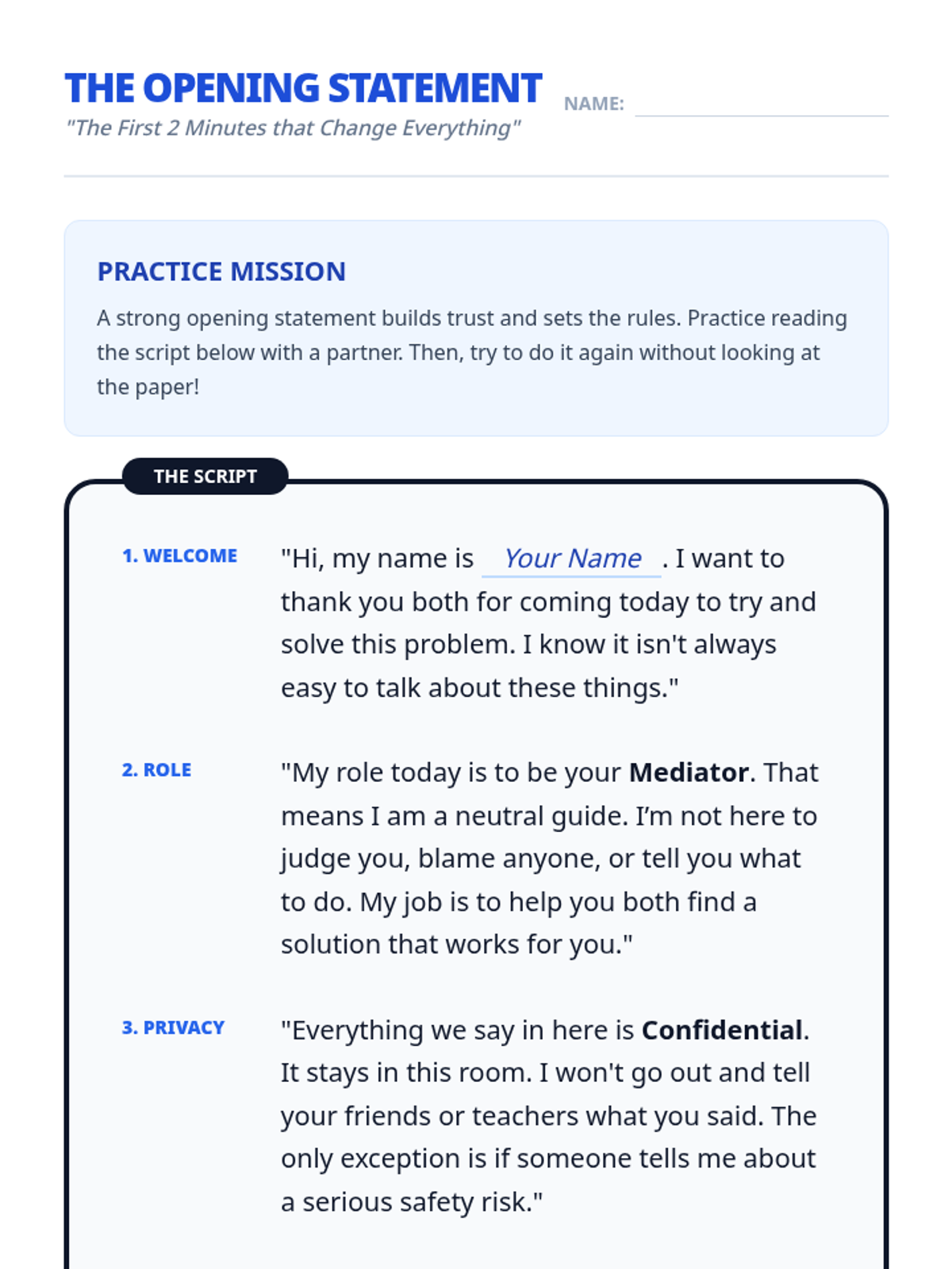 This sequence empowers students to act as third-party neutrals, introducing the specific structure and skills of Peer Mediation. Students learn the distinct phases of a mediation session, the importance of neutrality, and how to facilitate dialogue without taking sides.