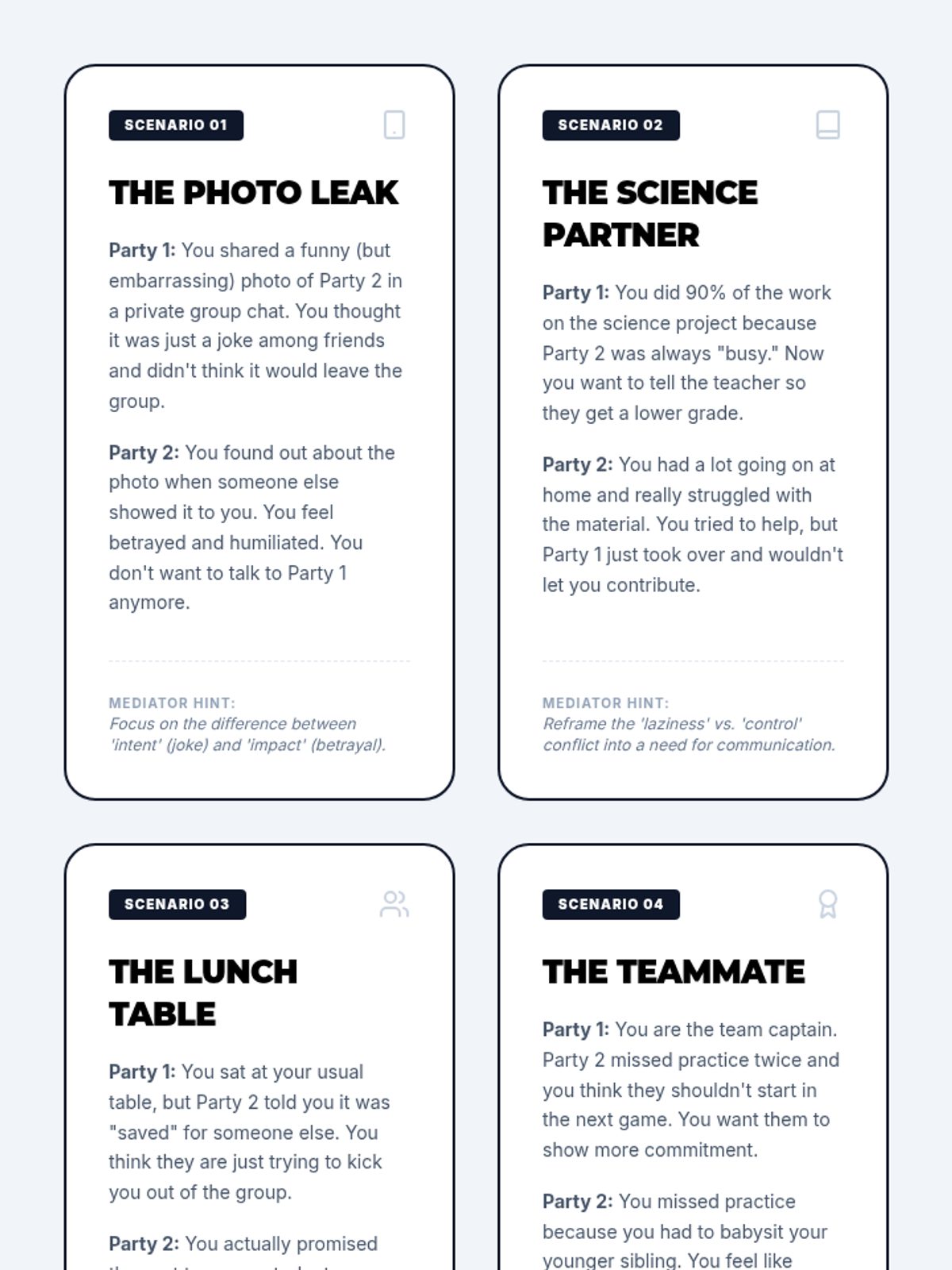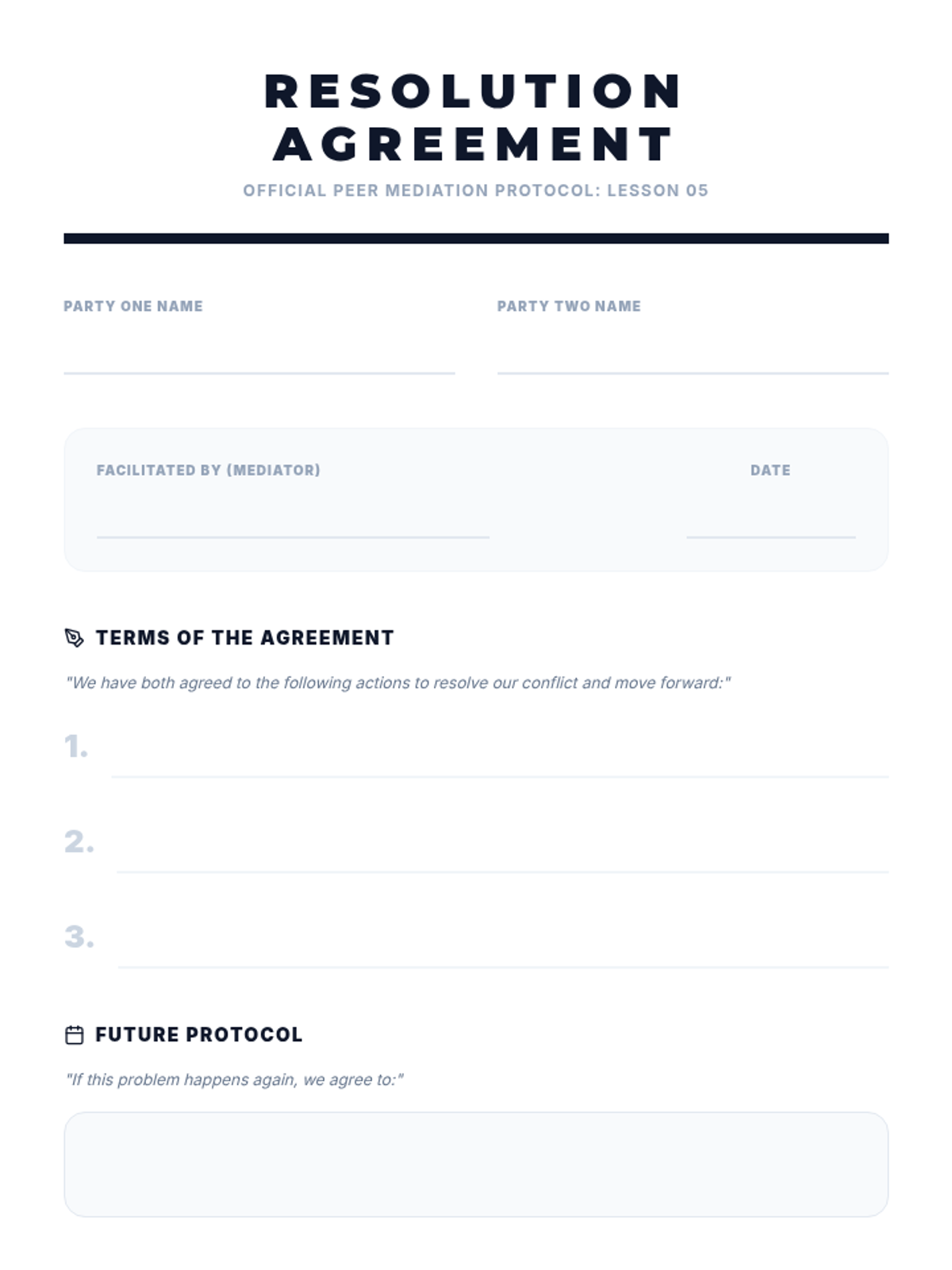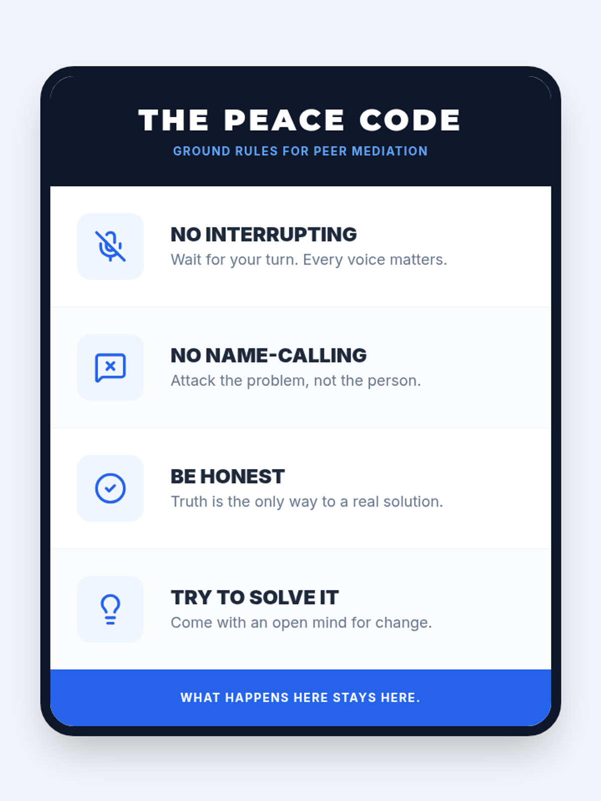 A 5-lesson unit for 7th graders on the formal structure of peer mediation. Students transition from observers to facilitators, learning to maintain neutrality, set ground rules, reframe toxic language, and guide parties toward mutually agreed-upon solutions.