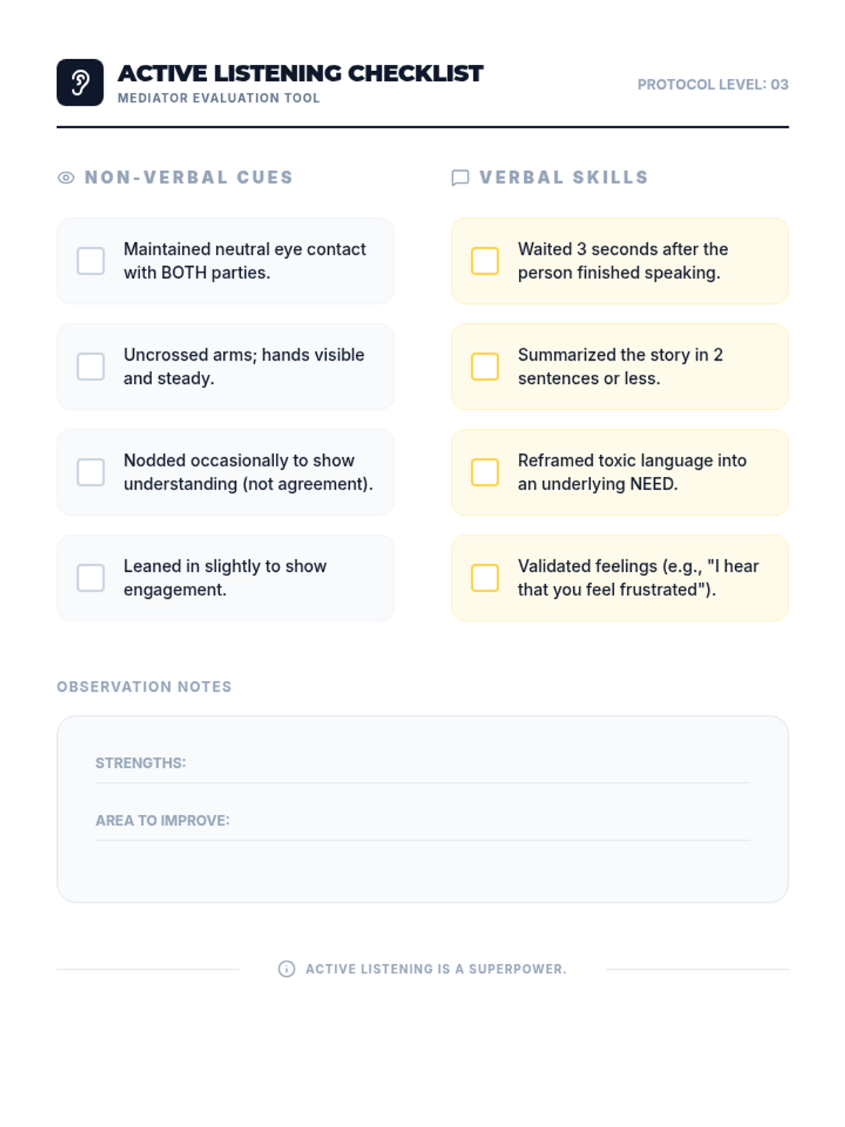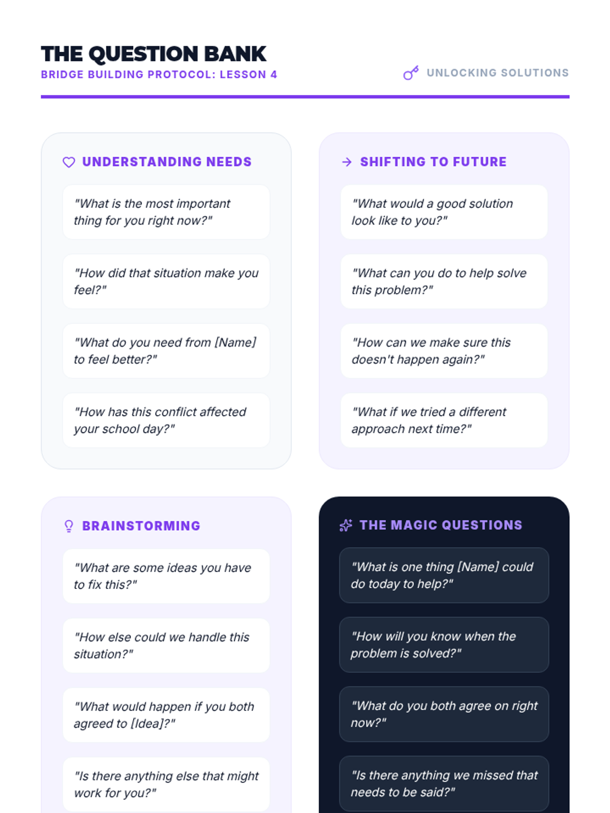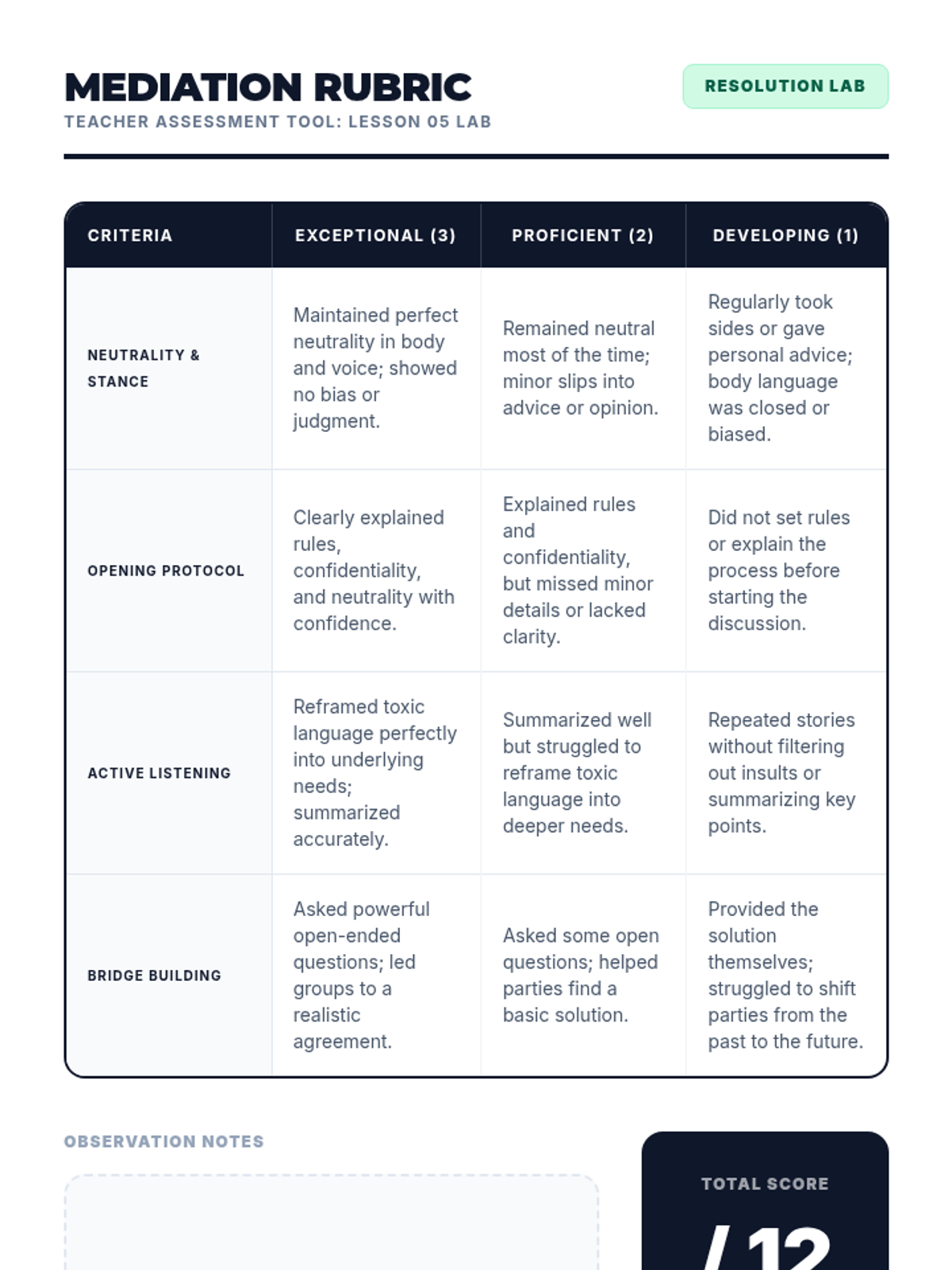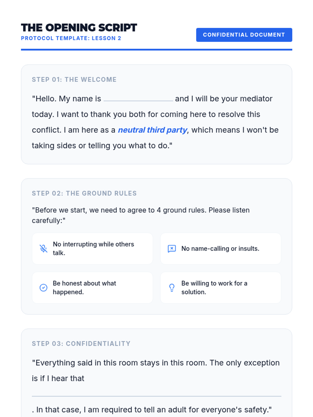A 5-lesson unit for 7th graders on the formal structure of peer mediation. Students transition from observers to facilitators, learning to maintain neutrality, set ground rules, reframe toxic language, and guide parties toward mutually agreed-upon solutions.