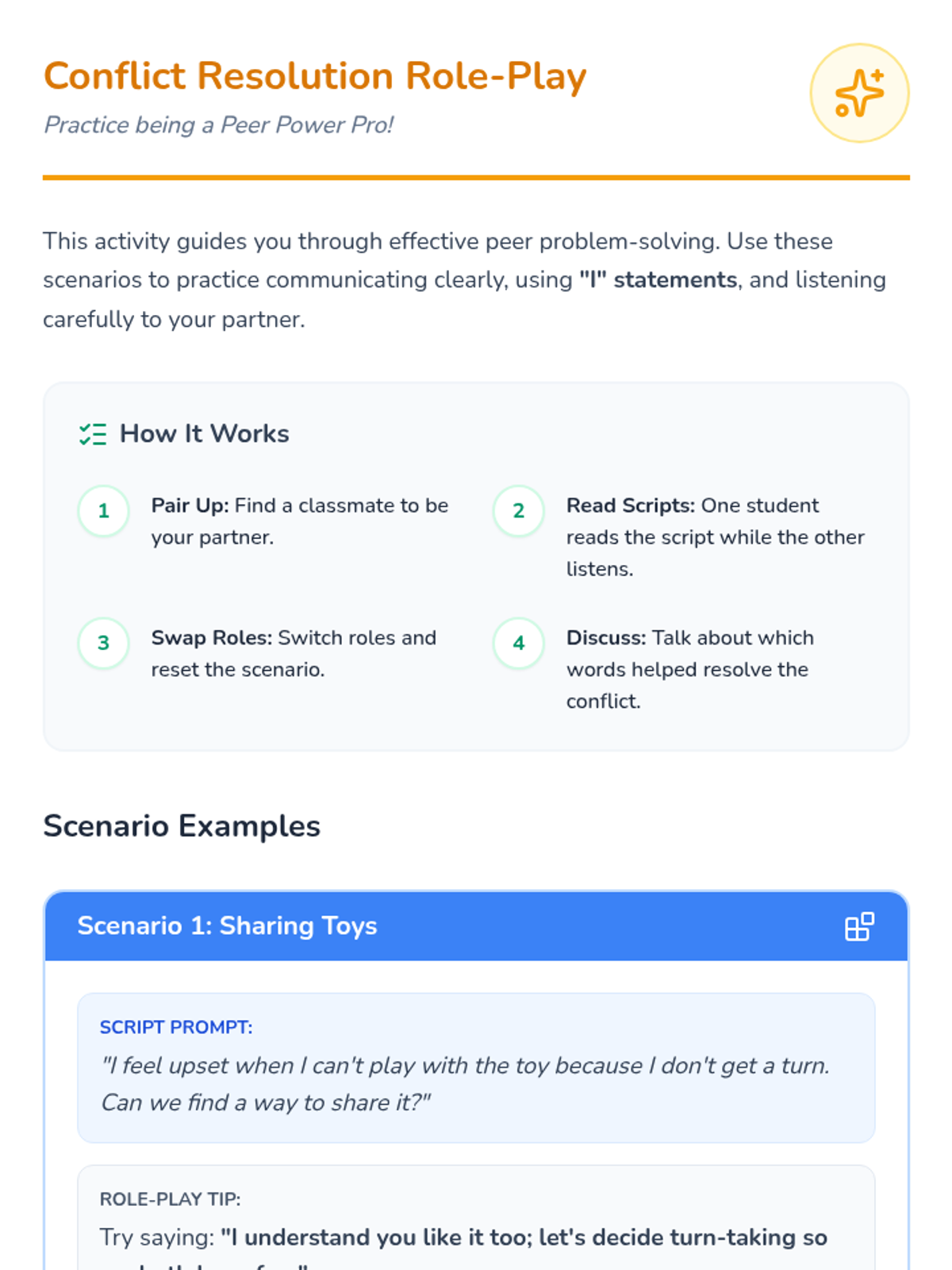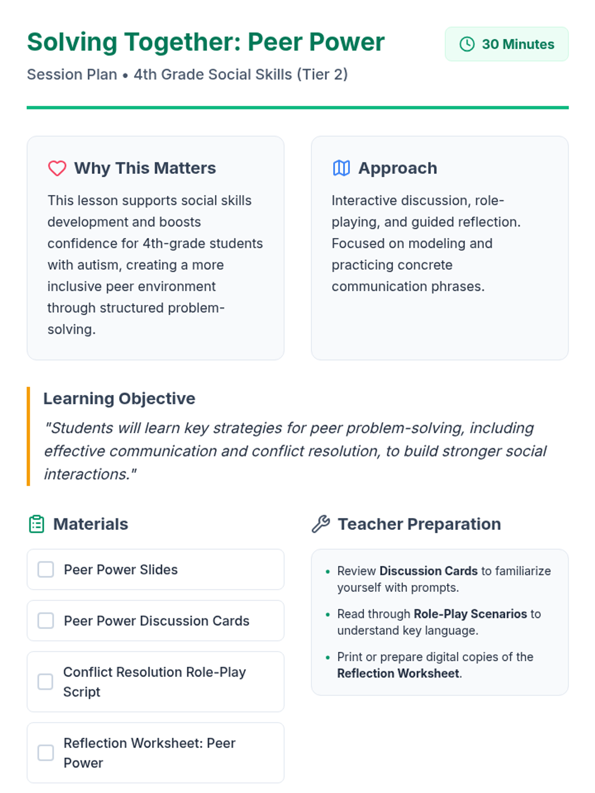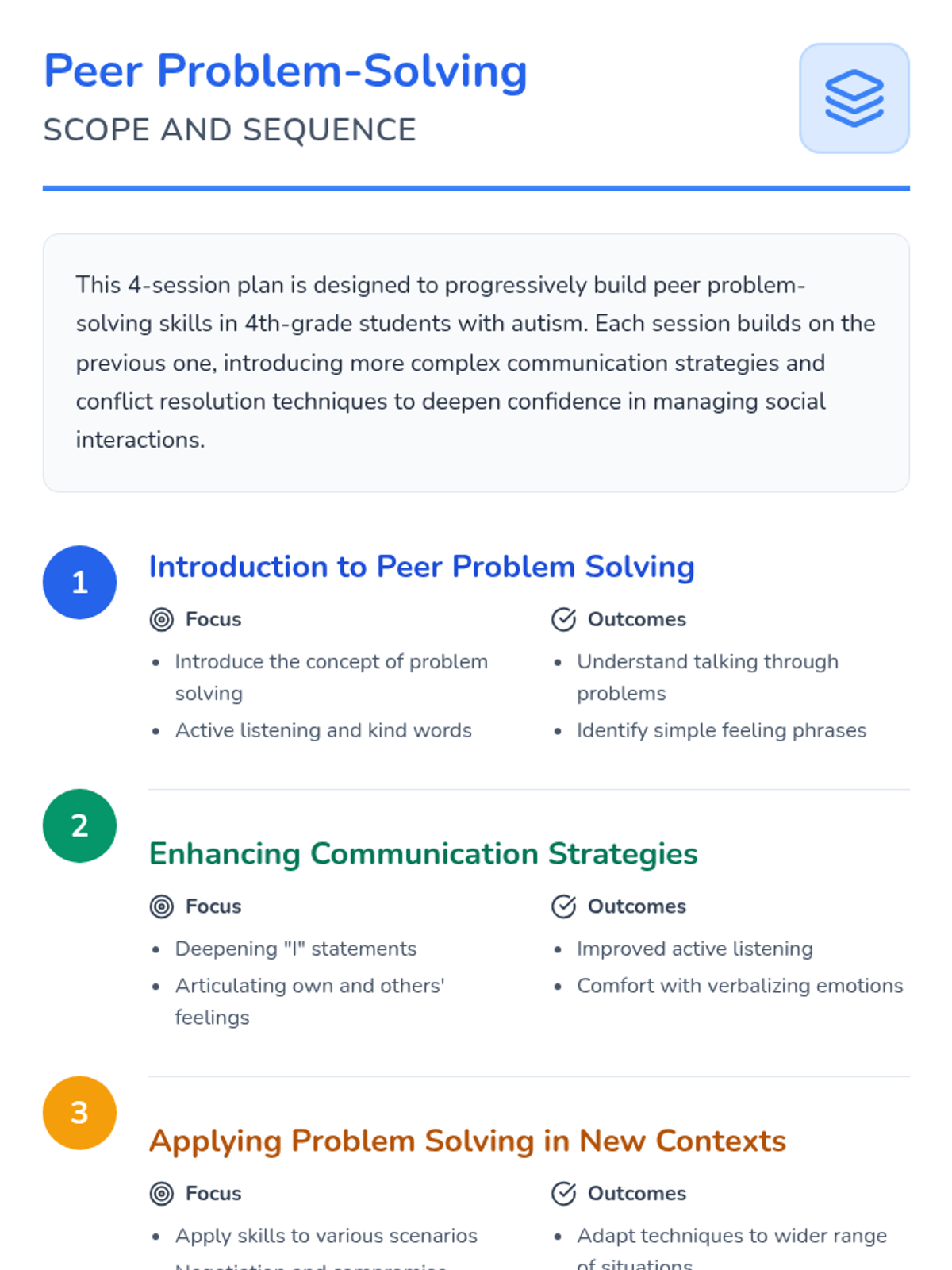 A 4-session sequence designed for 4th-grade students with autism to develop effective peer problem-solving, communication, and conflict resolution skills.