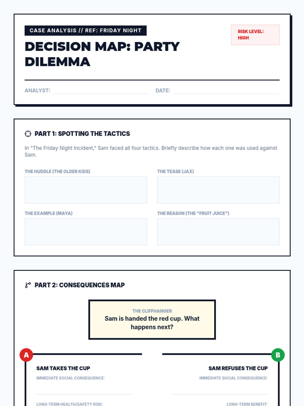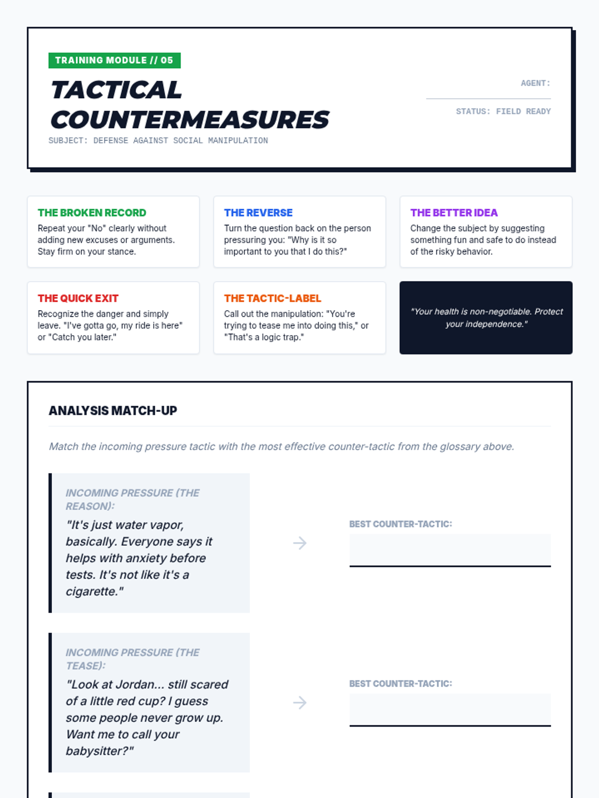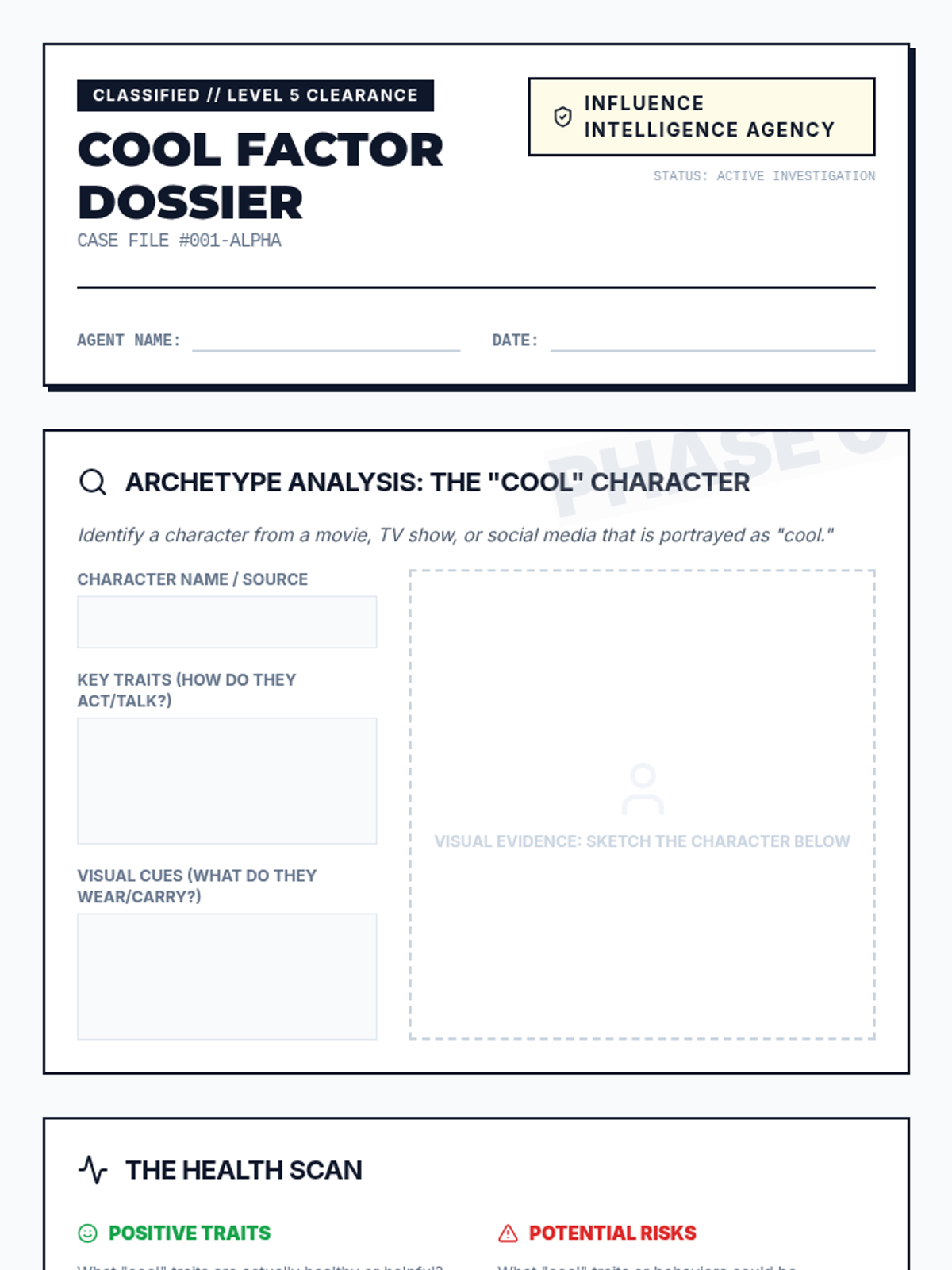 A 5th-grade health sequence that empowers students to deconstruct peer pressure tactics and media influence through a 'social analyst' lens. Students move from identifying the 'cool' factor to analyzing specific manipulation tactics and digital pressure, ultimately mastering effective refusal strategies.