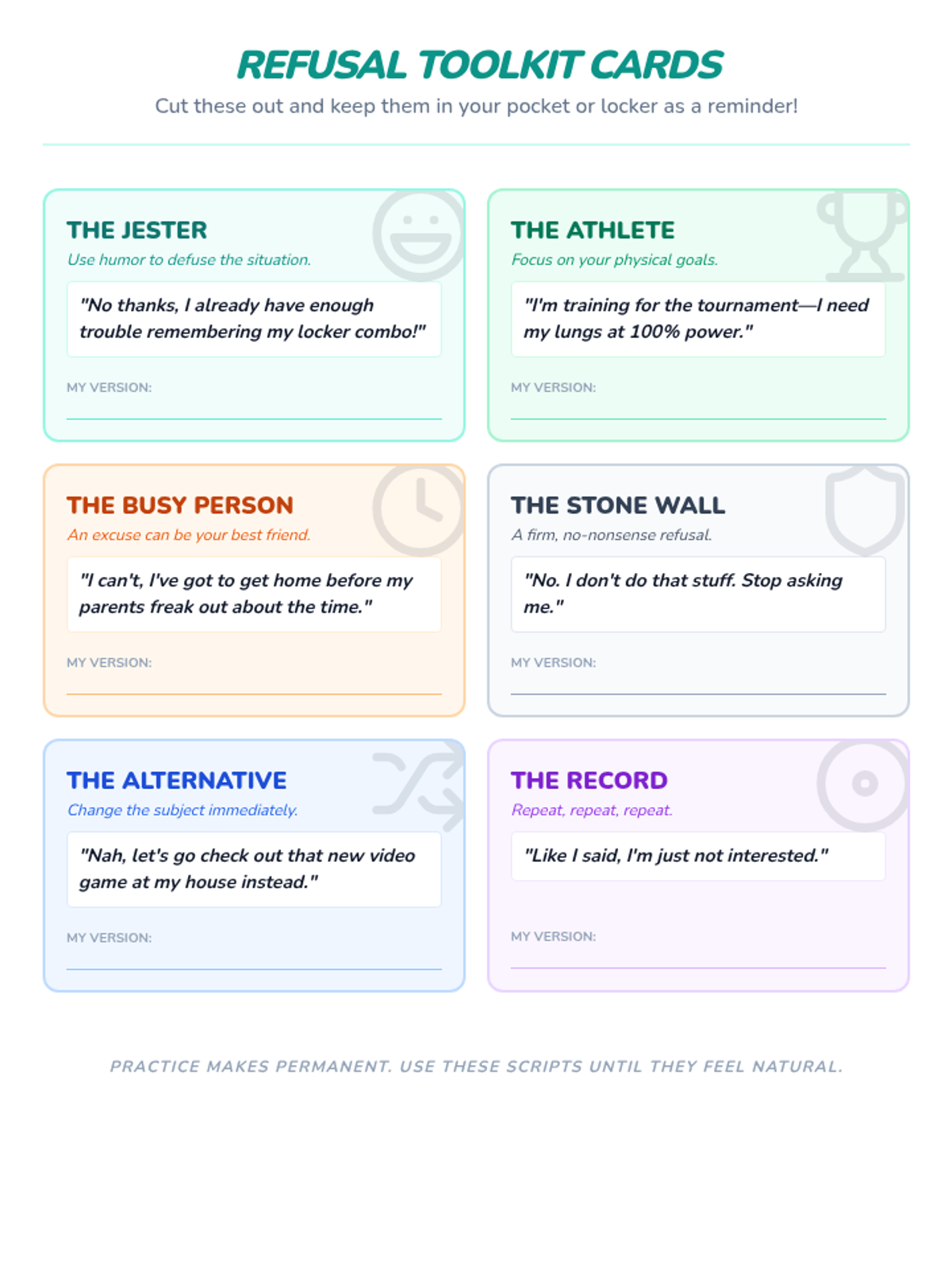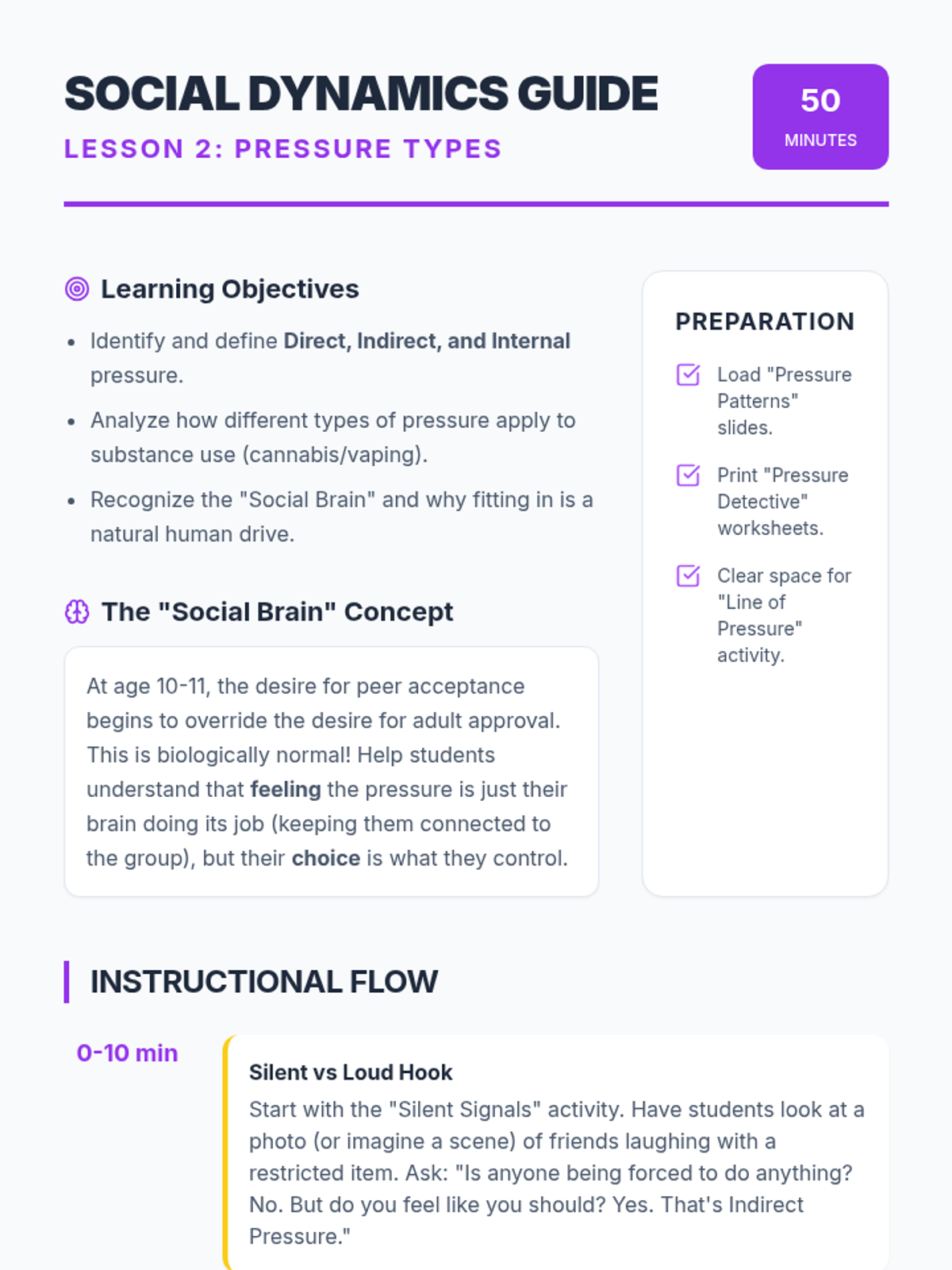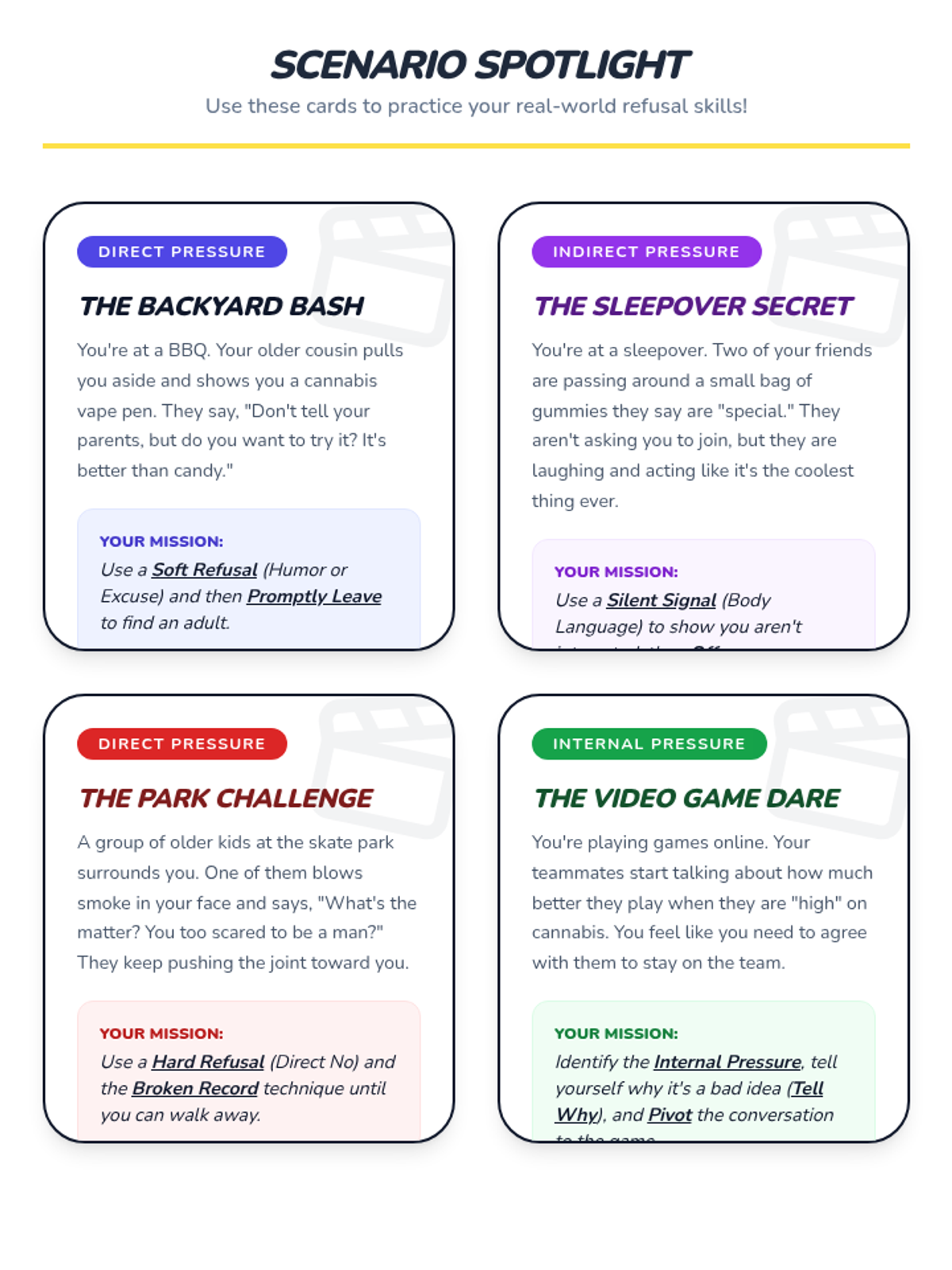 A comprehensive 5-lesson sequence for 5th graders focusing on the STOP decision-making model, identifying types of peer pressure, and mastering verbal and non-verbal refusal skills specifically related to cannabis and substance awareness.