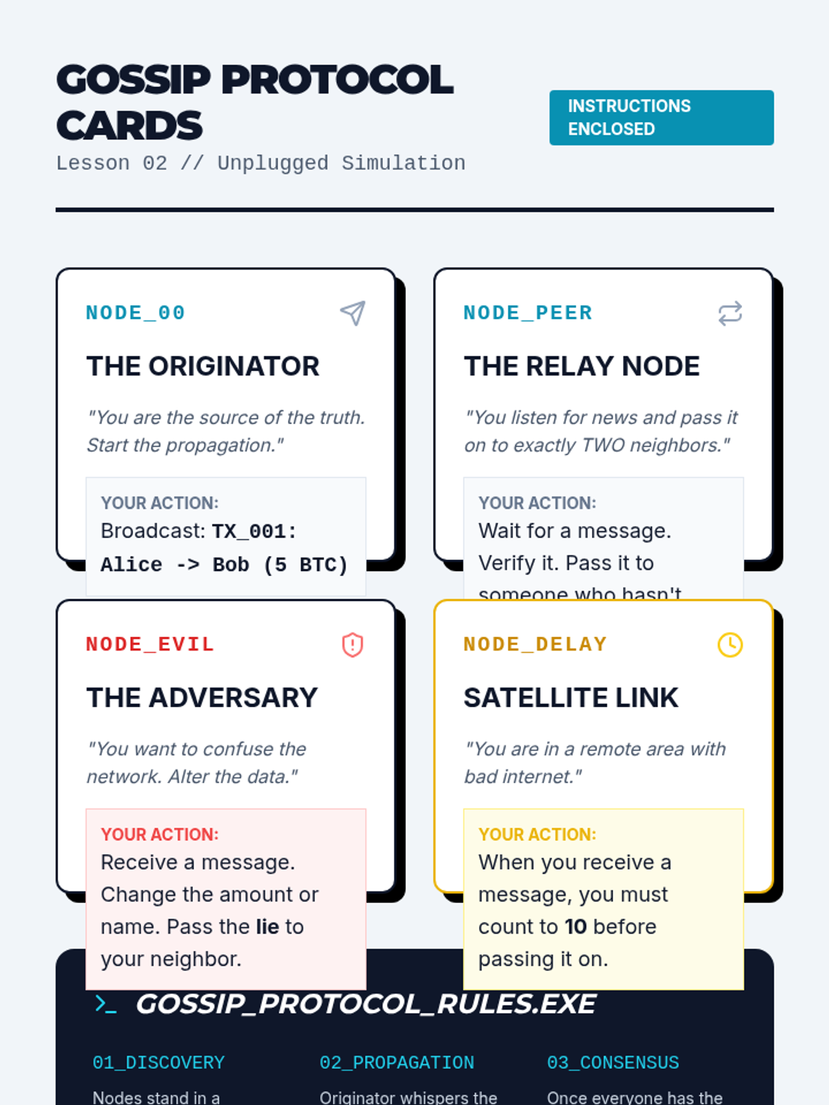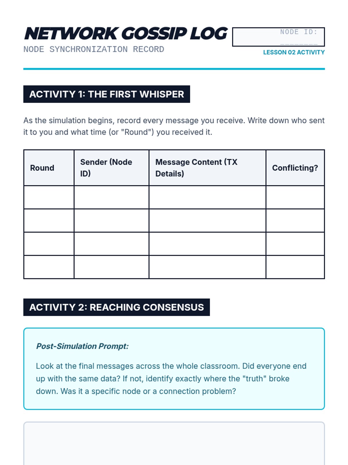 This sequence explores the network architecture of blockchain technology, contrasting centralized and decentralized systems. Students learn about peer-to-peer (P2P) communication, network latency, fork resolution, and node roles in a distributed ledger.