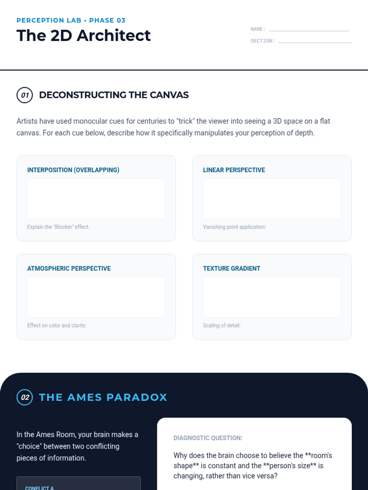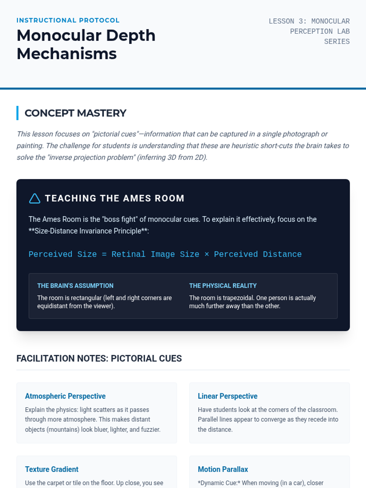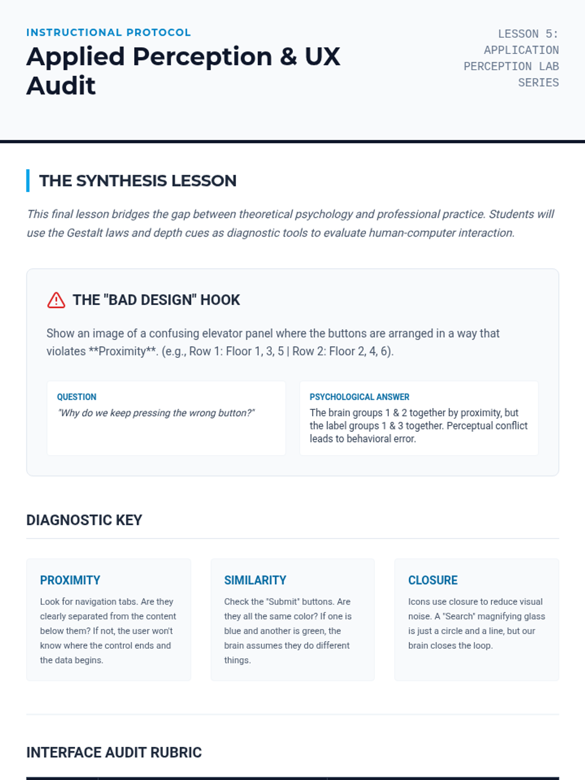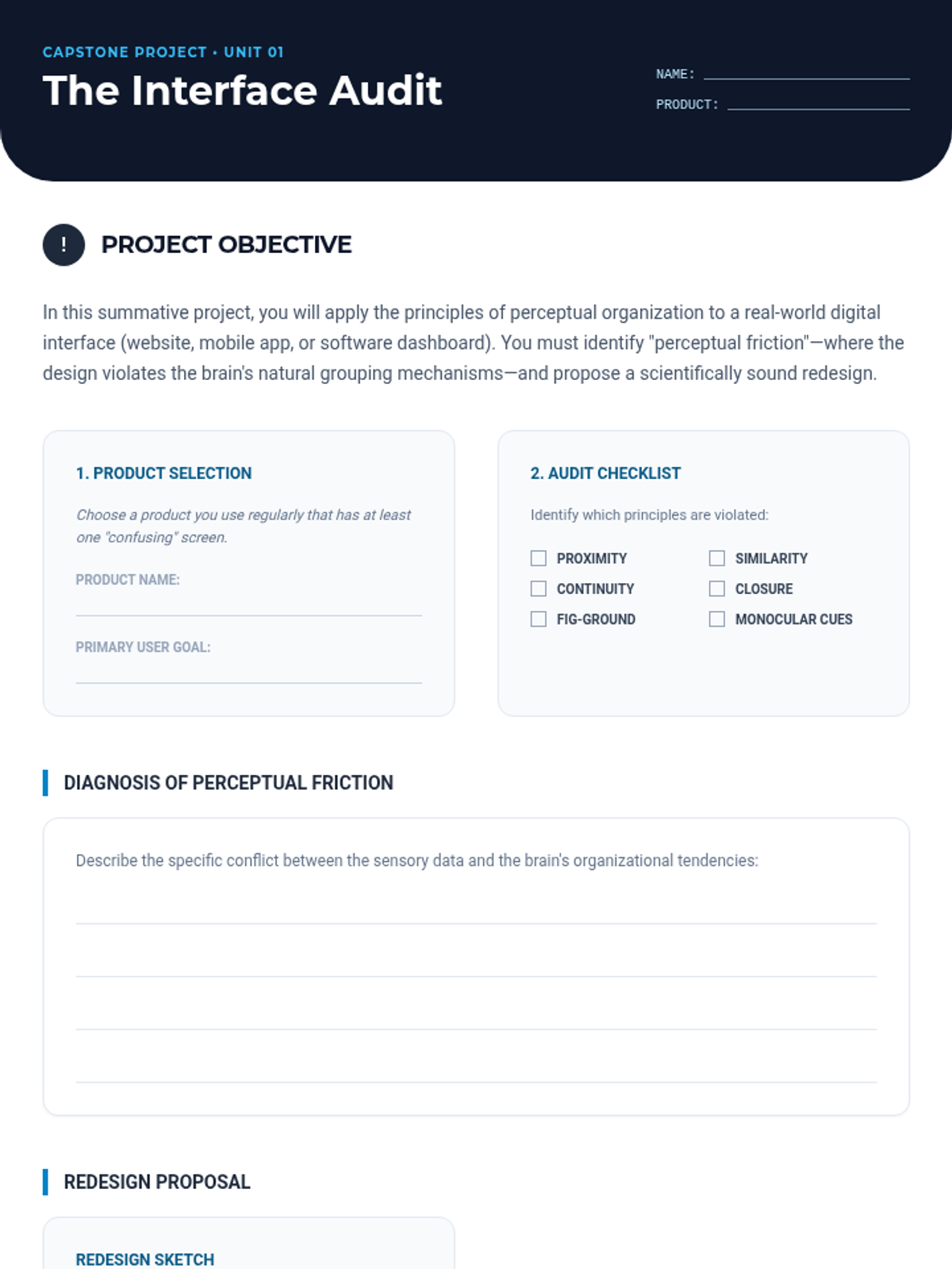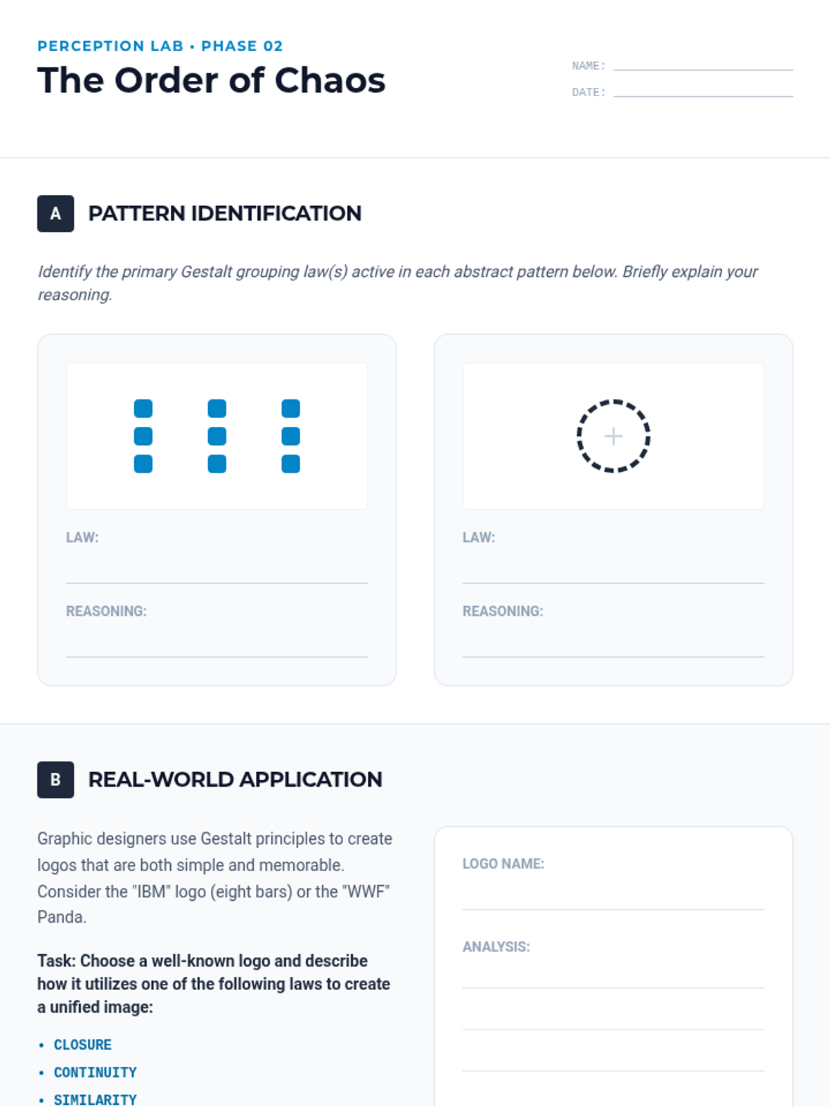 A comprehensive undergraduate psychology unit exploring how the human brain organizes sensory information into meaningful perceptions. The sequence covers Gestalt principles, monocular and binocular depth cues, and practical applications in UI/UX design.