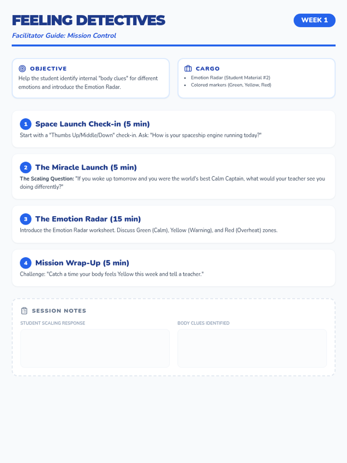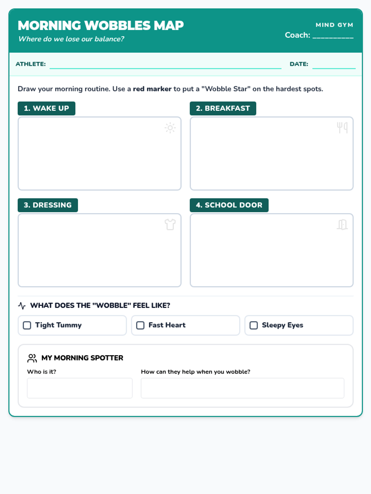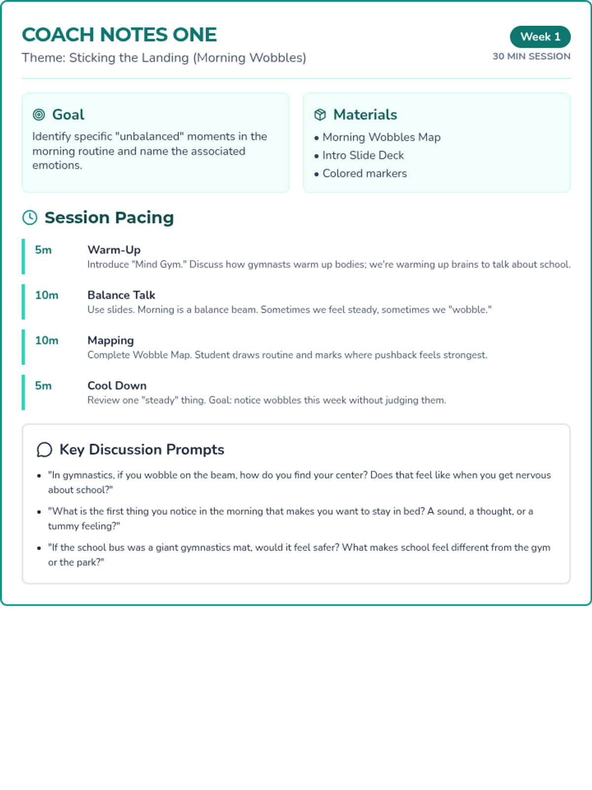 A 3-week solution-focused school-based therapy curriculum for students struggling with morning transitions. Uses gymnastics metaphors to teach emotional regulation, coping skills, and the "perfect landing" from home to school.