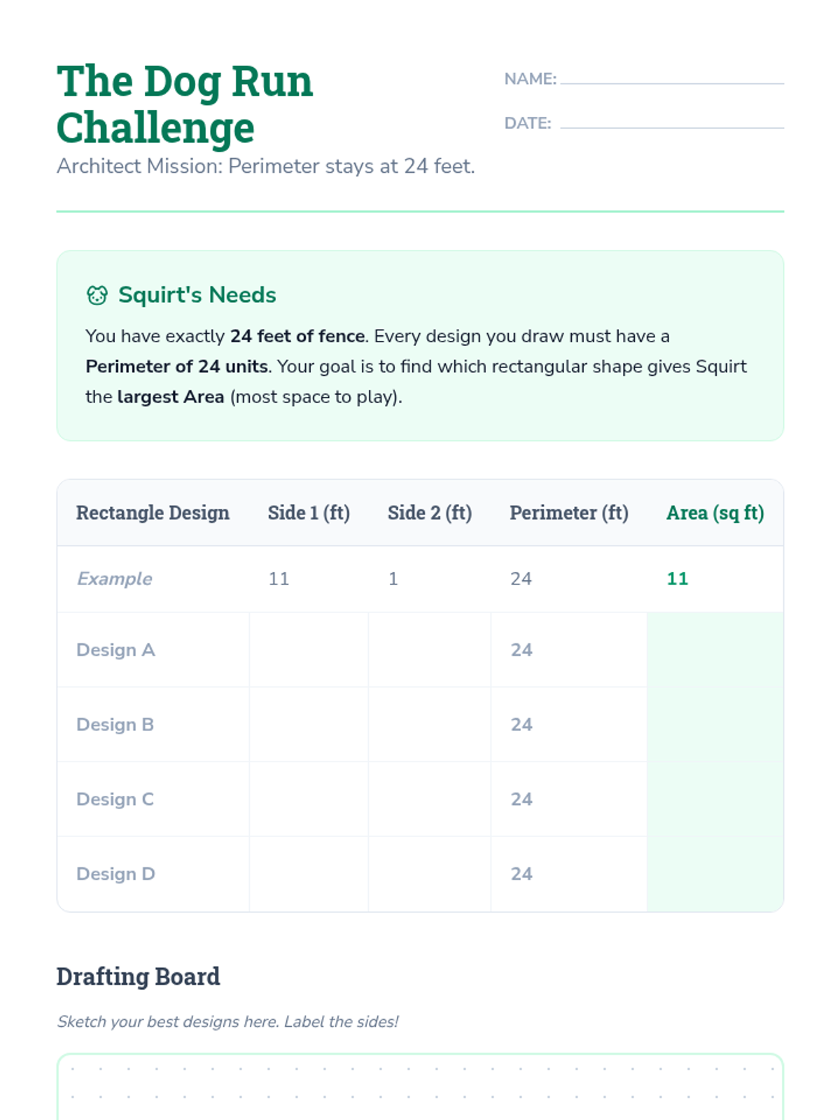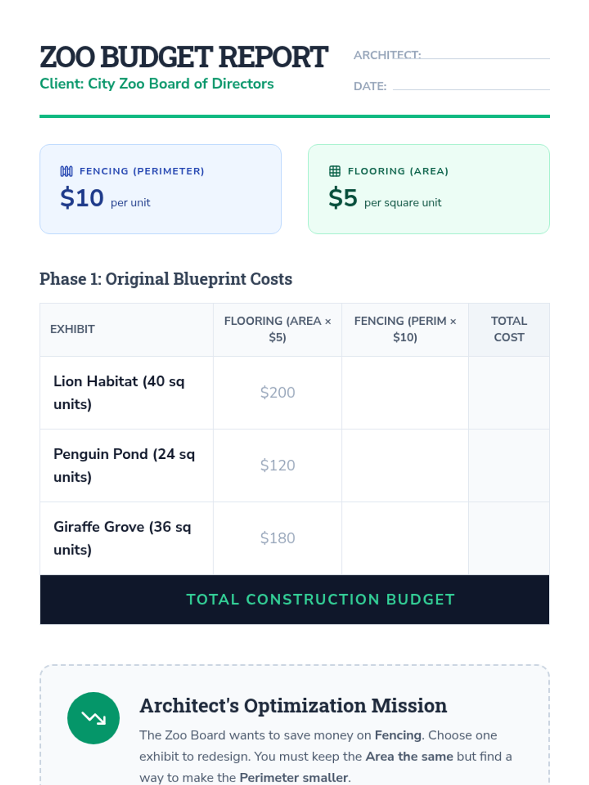 A 3rd-grade math sequence focused on the relationship between area and perimeter through the engaging lens of zoo design. Students explore how shapes with identical areas can have different perimeters and vice versa, culminating in a budget-conscious enclosure project.