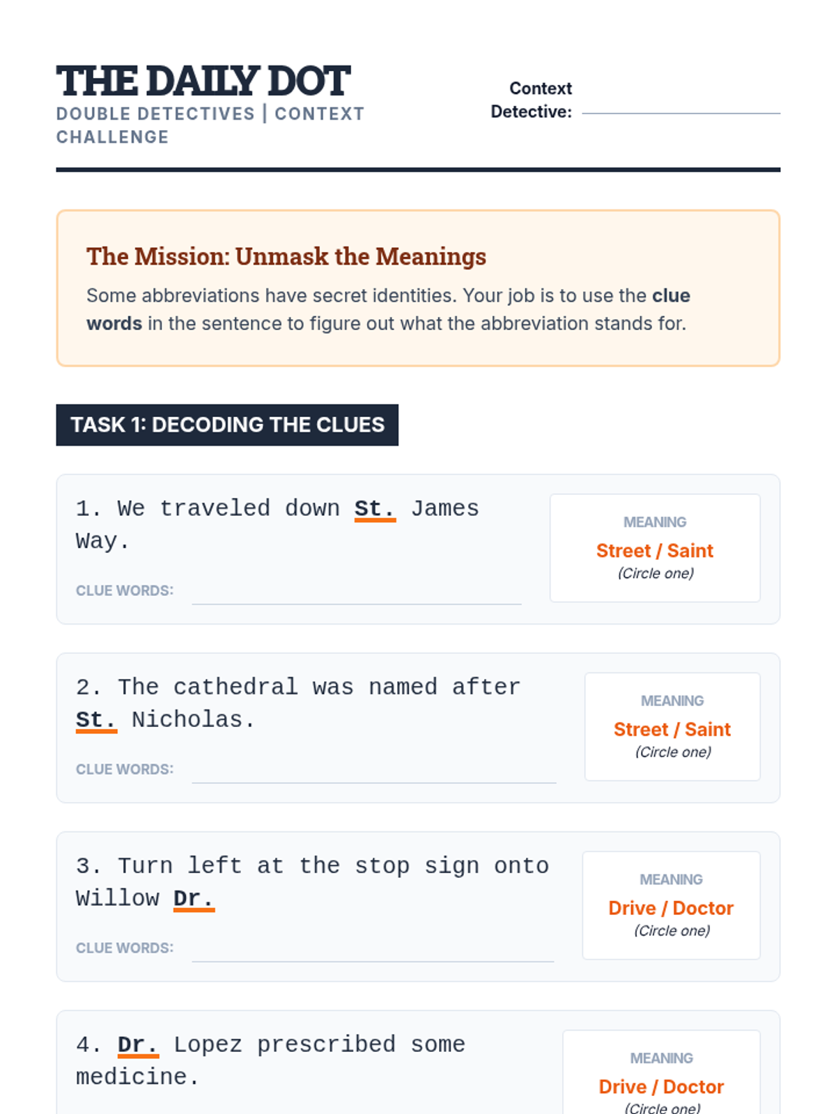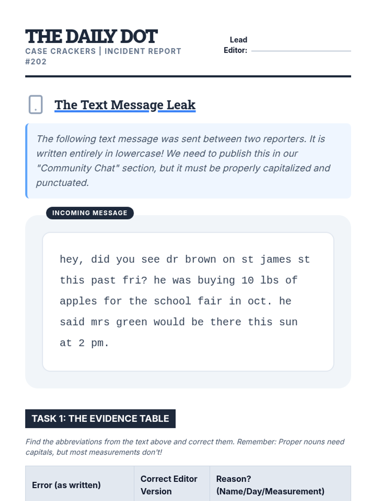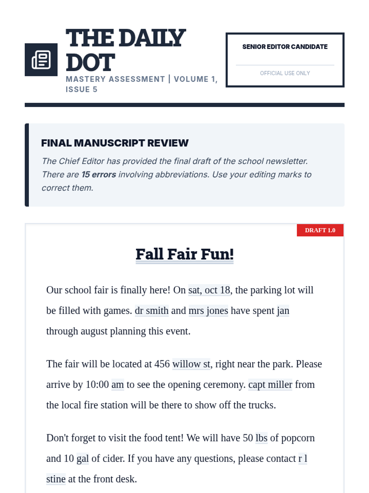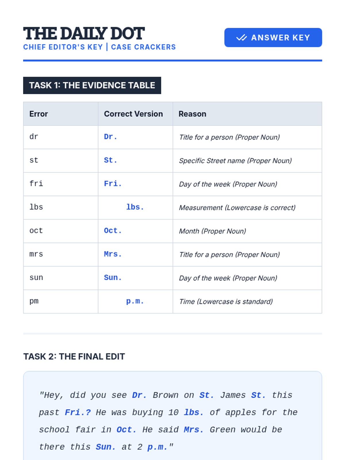 A mastery-based sequence where 4th-grade students act as editors for 'The Daily Dot' newsroom. They learn to proofread for periods, capitalization, context, and ambiguity in abbreviations, culminating in a final manuscript edit to earn their Senior Editor badges.