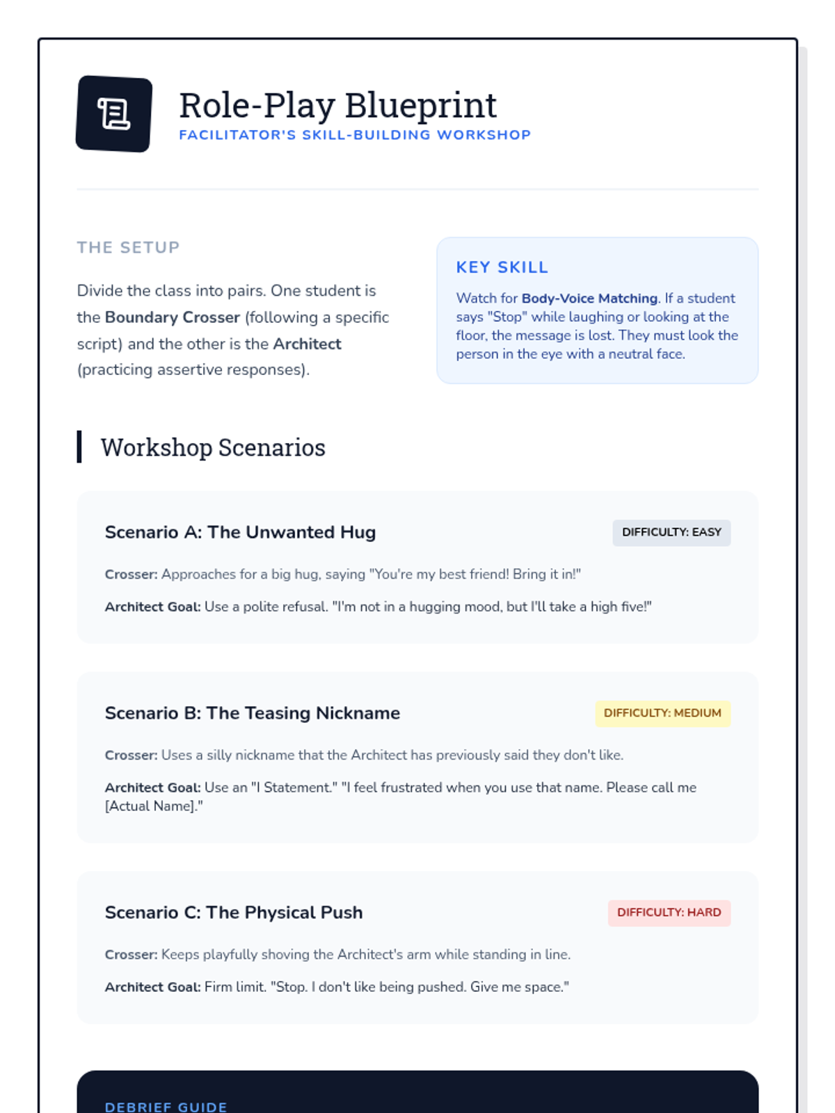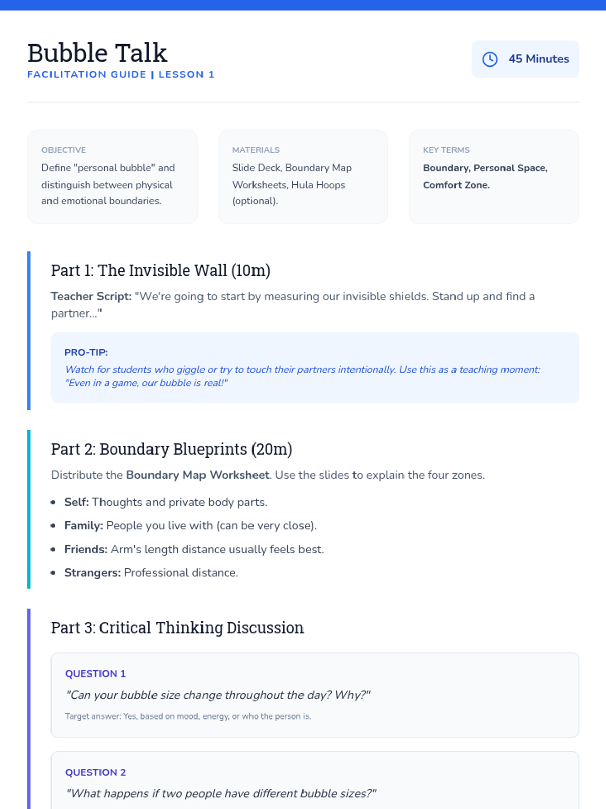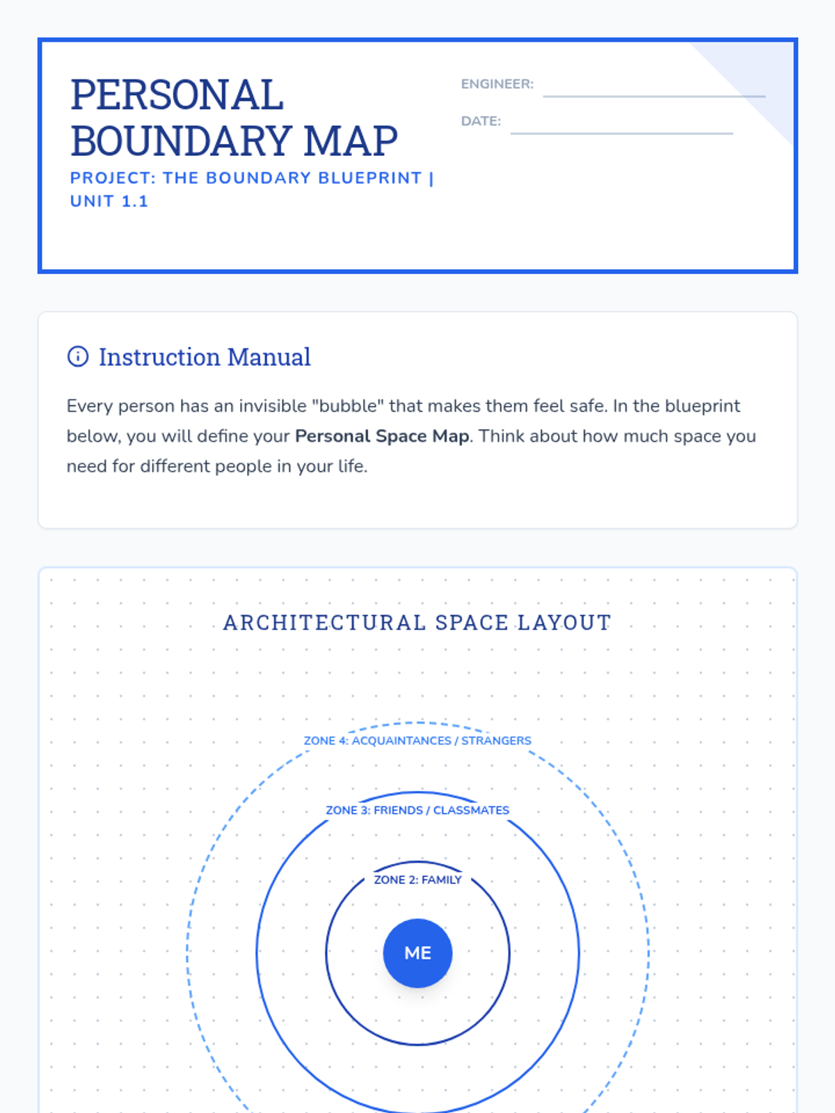 A comprehensive unit for fifth-grade students to understand, communicate, and respect personal boundaries in physical, social, and digital contexts. Through a 'Boundary Blueprint' theme, students develop self-awareness and assertive communication skills.