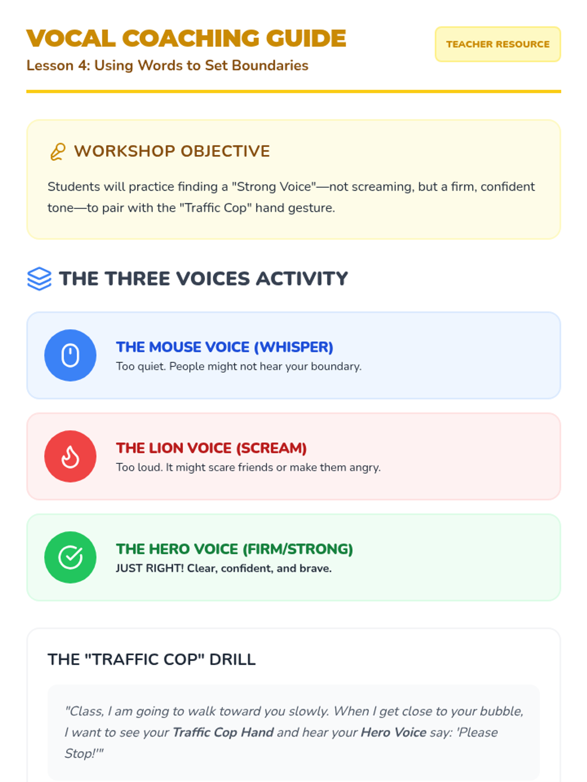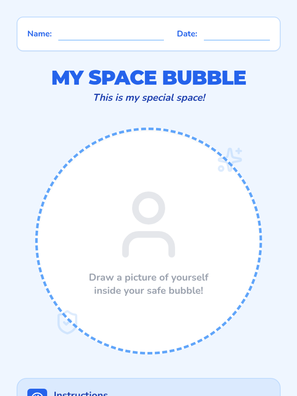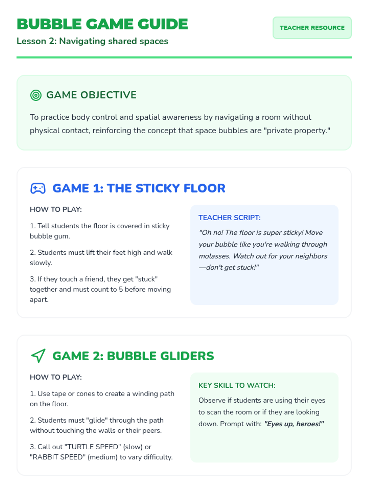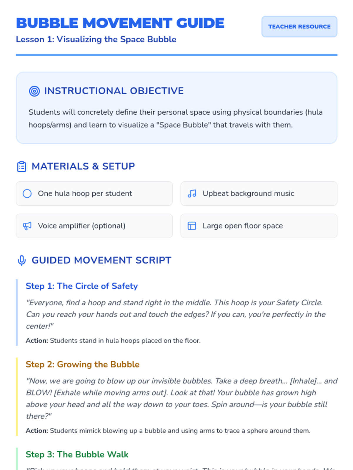 A comprehensive Pre-K sequence introducing personal space and verbal boundaries through the metaphor of 'Space Bubbles.' Students learn to define, navigate, and communicate their personal limits using movement, role-play, and assertive language.