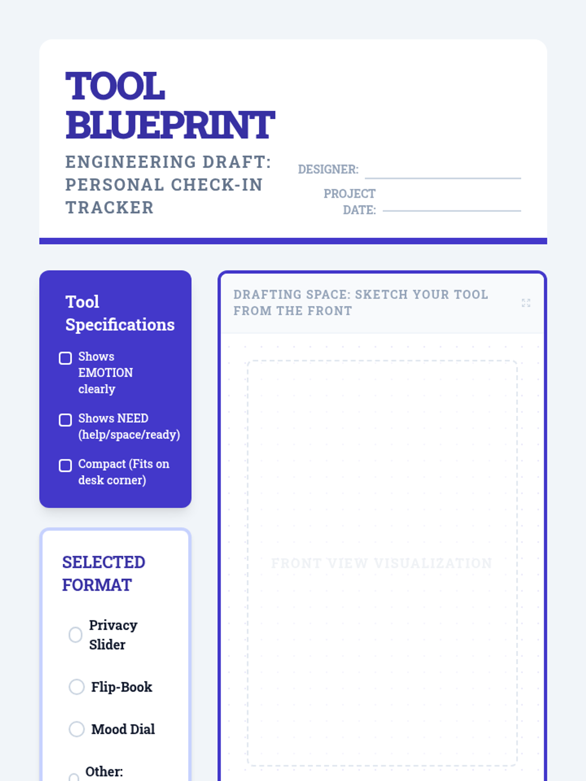 Students design and create their own personalized check-in tools to foster ownership over the behavioral check-in process. The sequence moves from exploration of different modalities to the design, construction, and implementation of a personal 'Check-In Toolkit'.