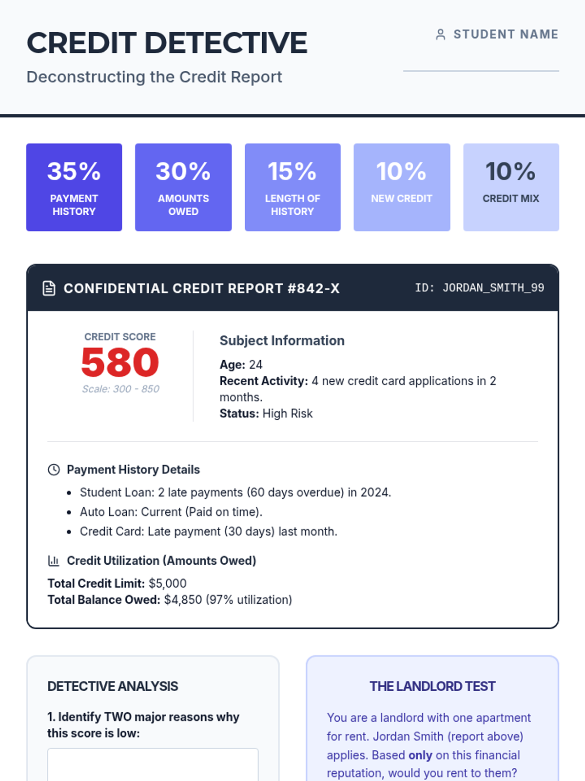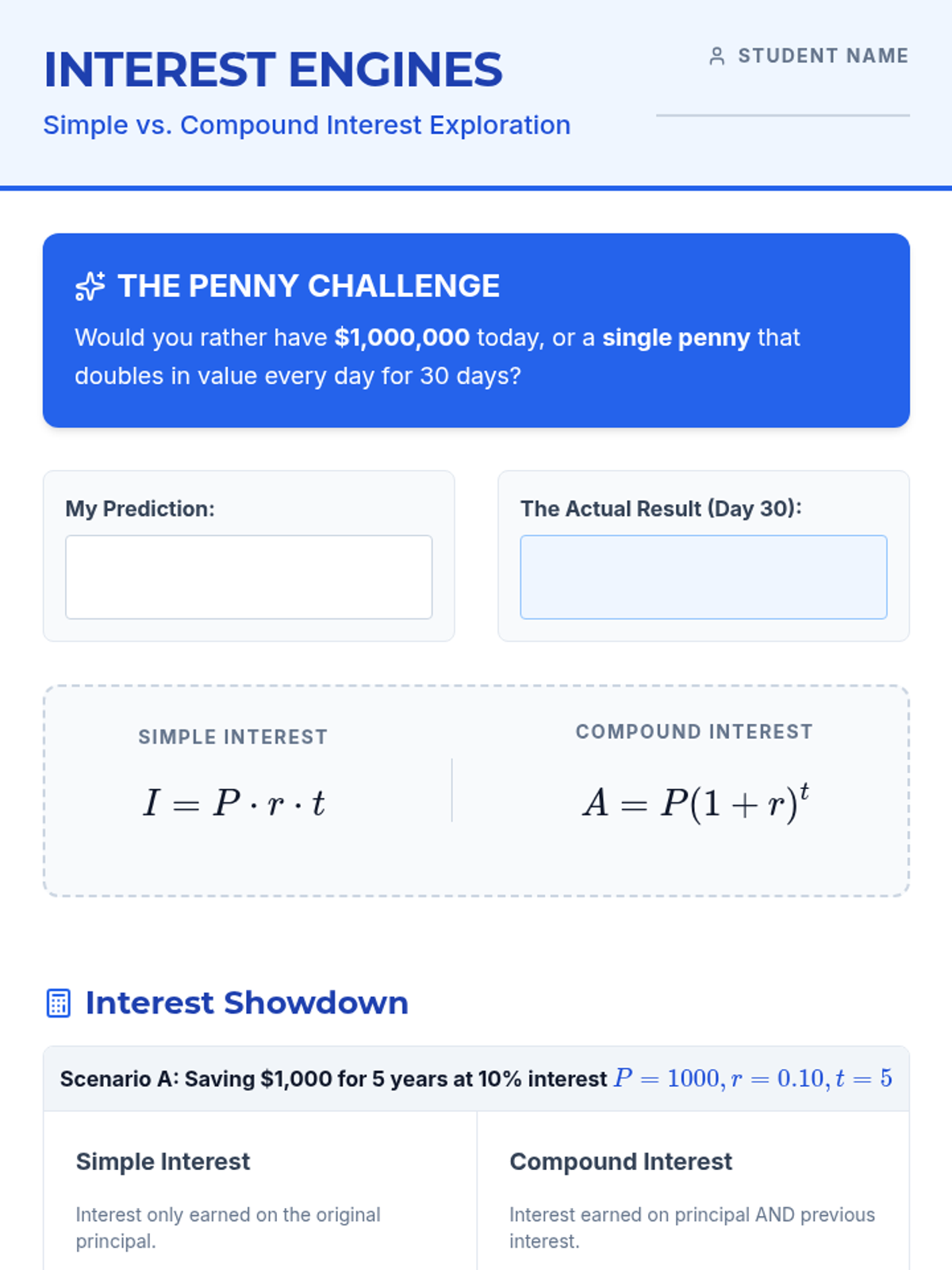This comprehensive 8th-grade sequence covers banking institutions, compound interest, credit scoring, and loan amortization. Students engage in inquiry-based case studies and simulations to understand how financial decisions impact long-term health.