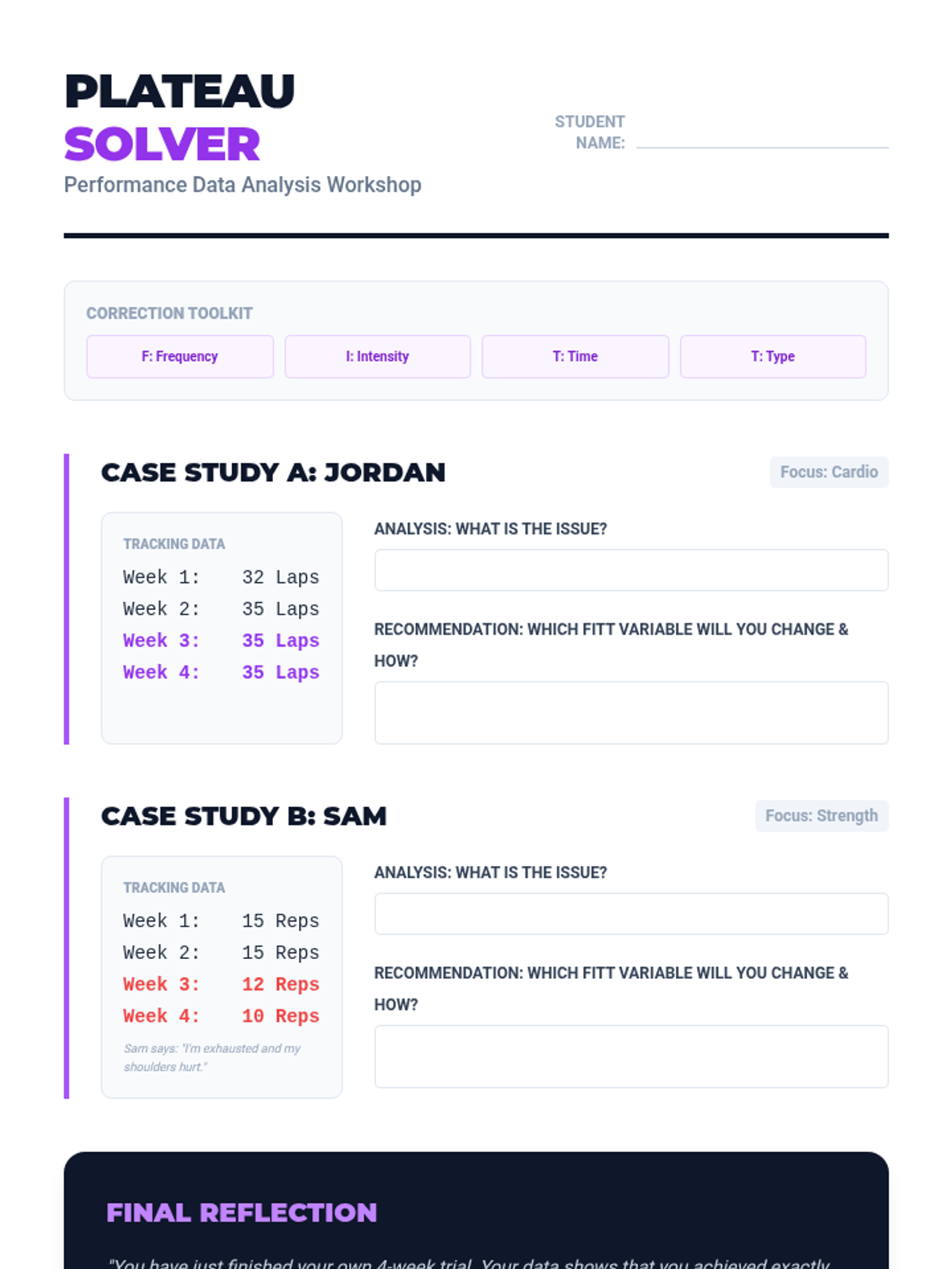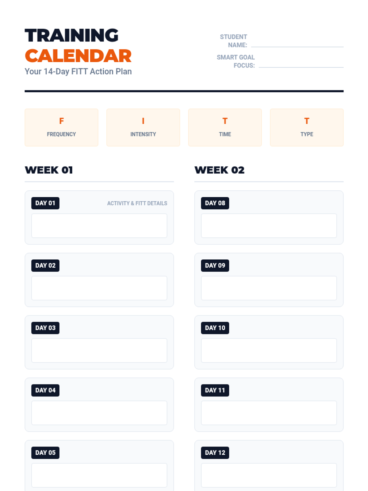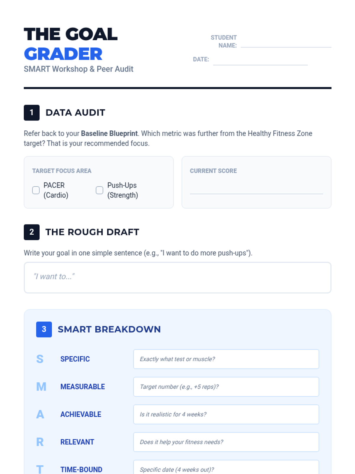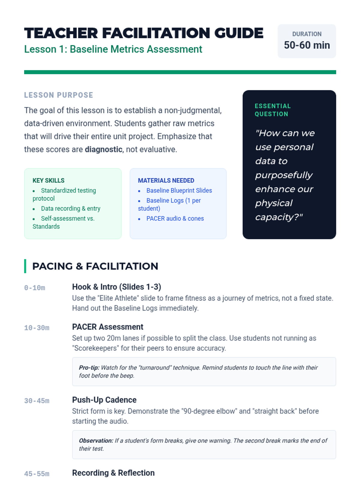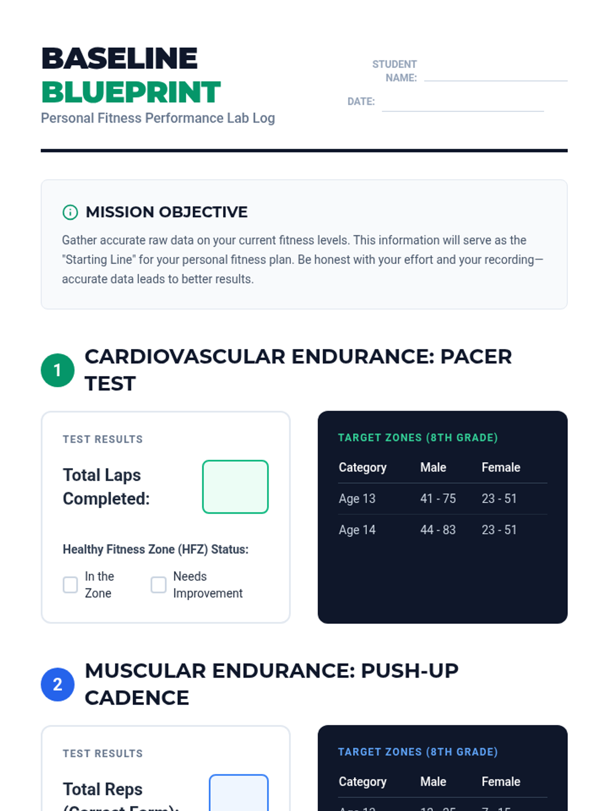 This sequence guides 8th-grade students through the full cycle of personal fitness planning, from baseline assessment and SMART goal setting to FITT plan design and data-driven adjustments. Students will learn to use personal metrics to create actionable, realistic health improvements.
