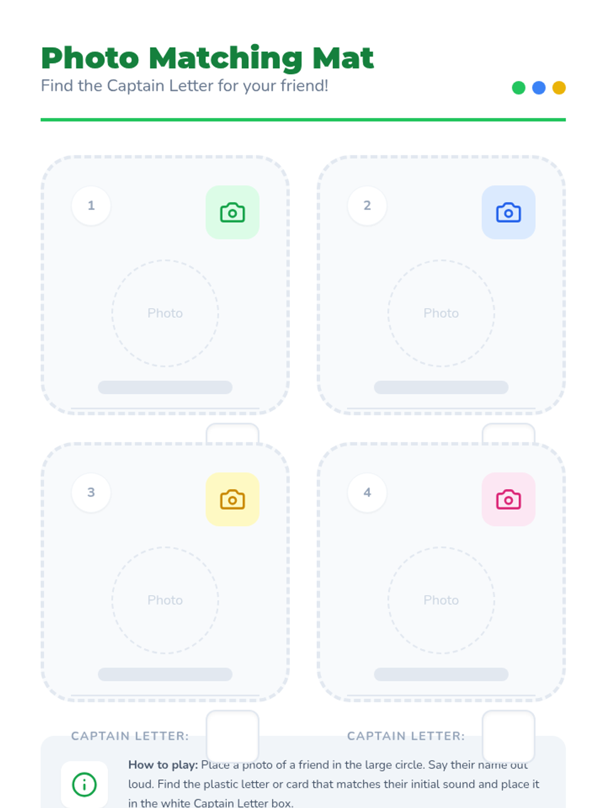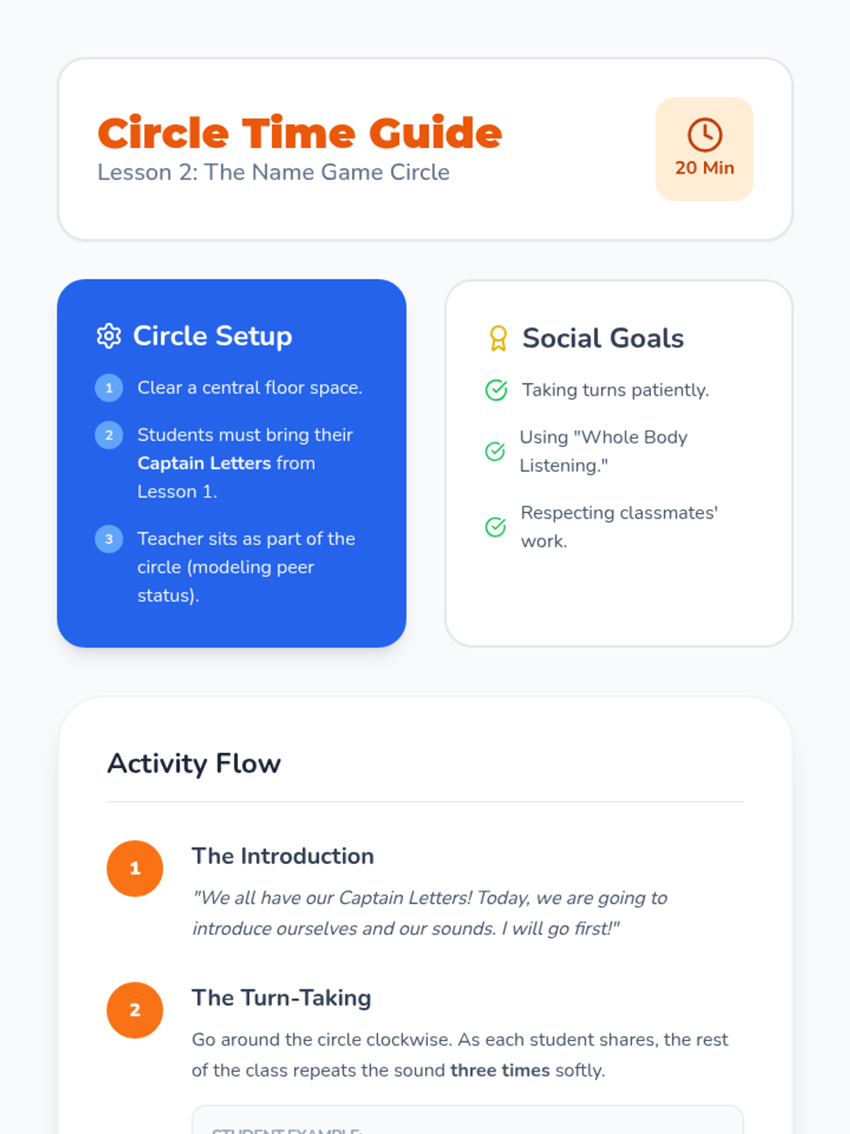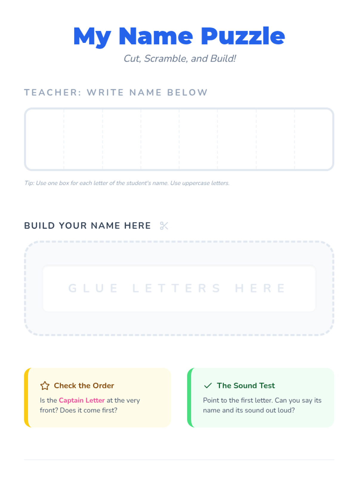 A Pre-K phonics sequence that uses students' names to teach uppercase letter recognition and initial sound associations through hands-on projects and social games.
