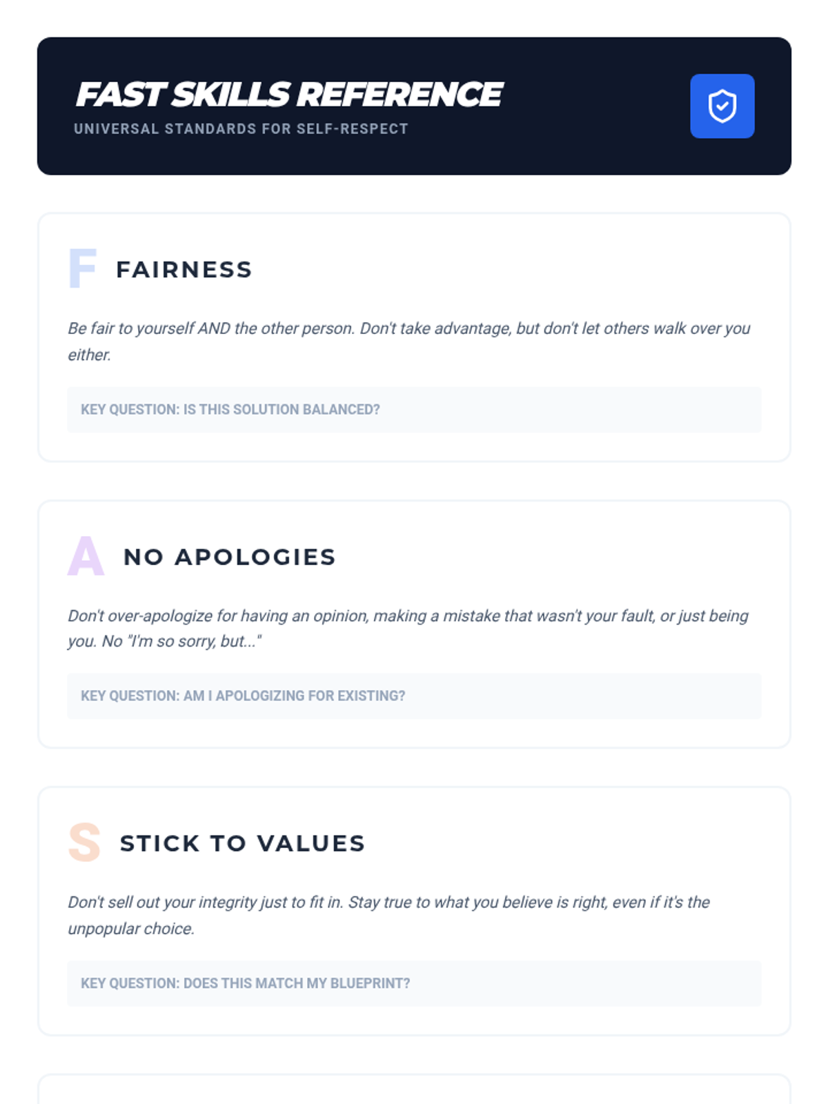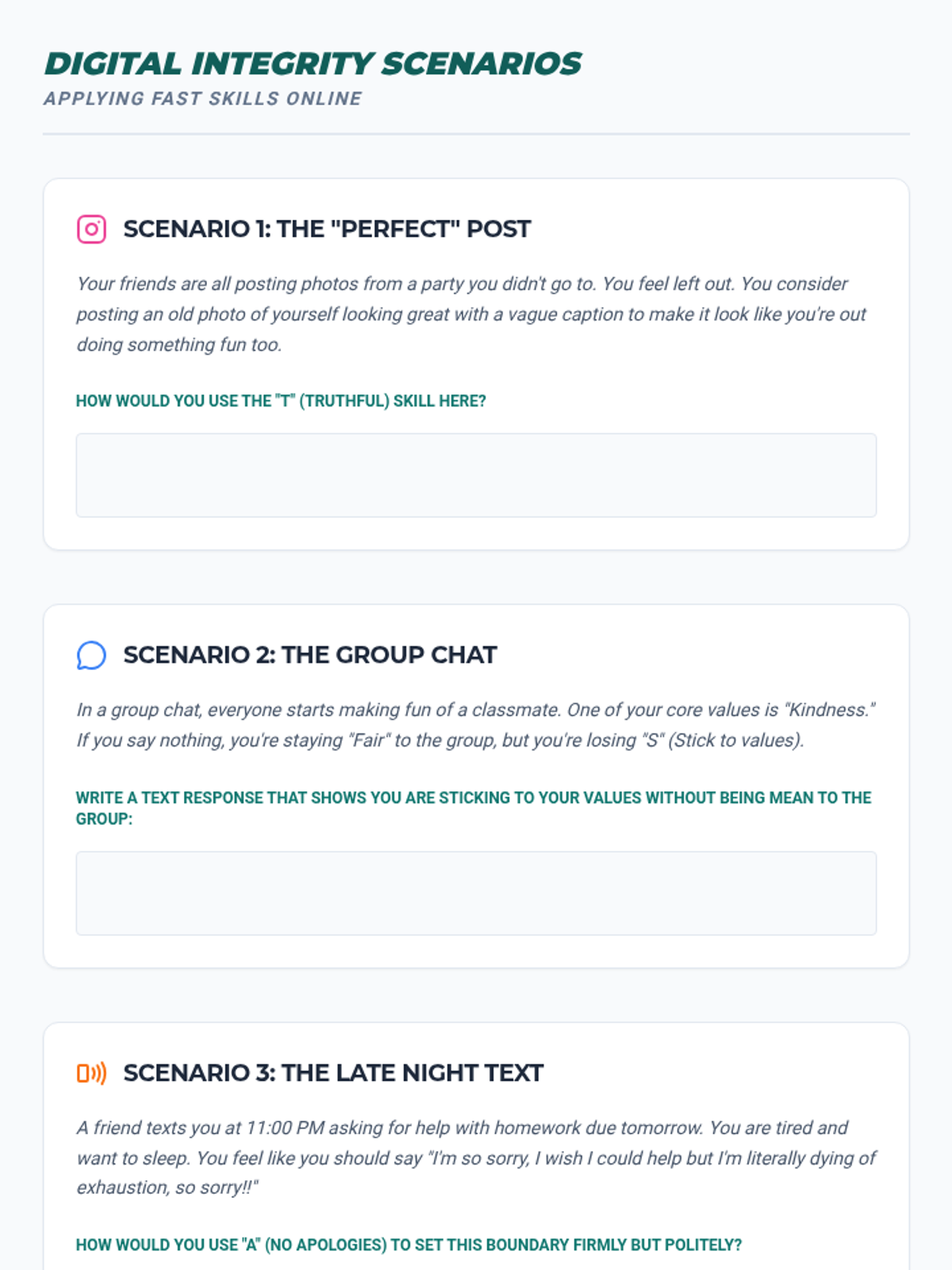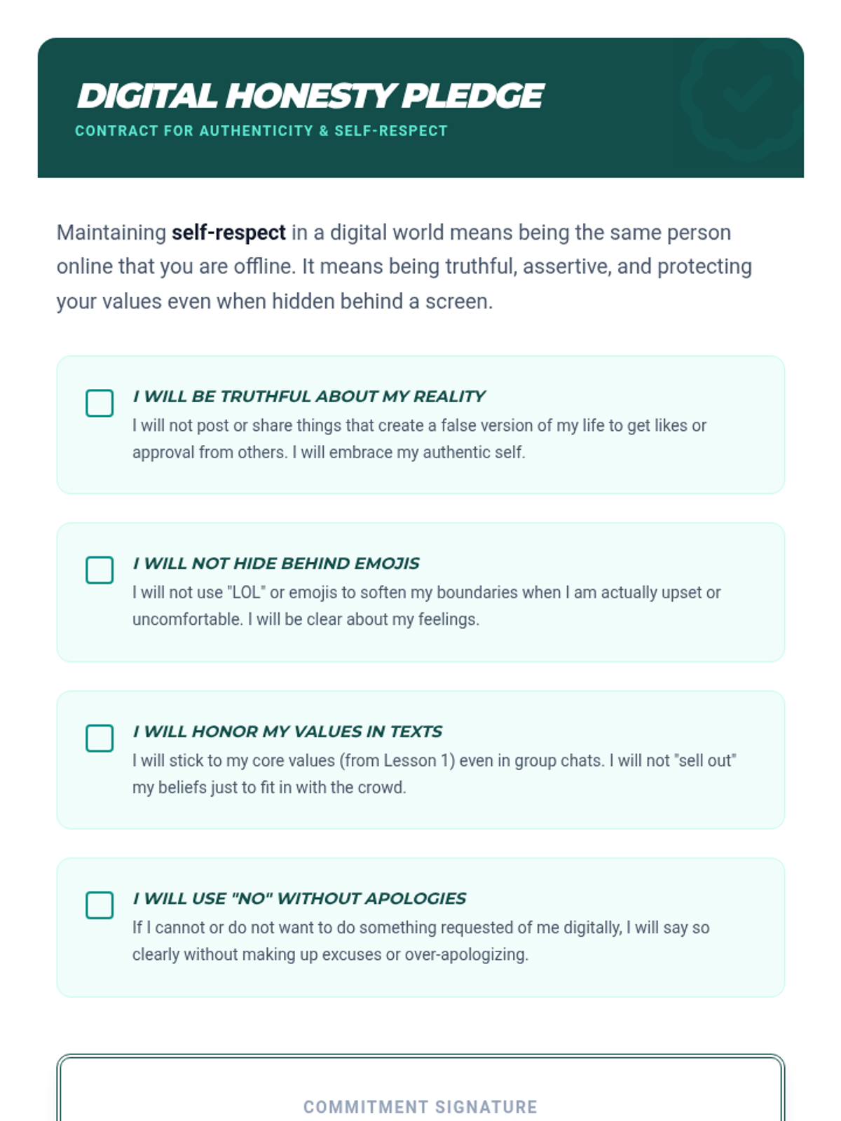 A project-based sequence for 6th graders to develop self-respect using FAST skills. Students explore personal values, digital authenticity, boundaries, and assertive communication to create a comprehensive 'Personal Code of Conduct' manifesto.
