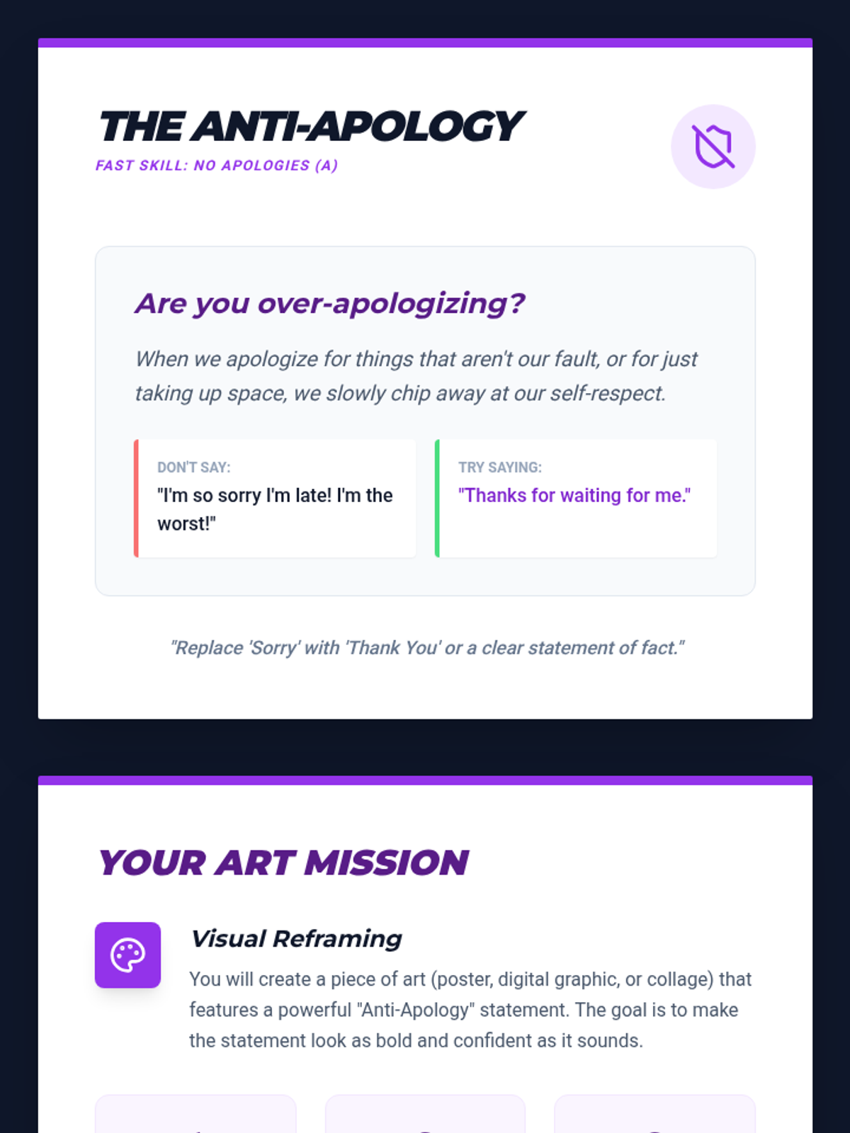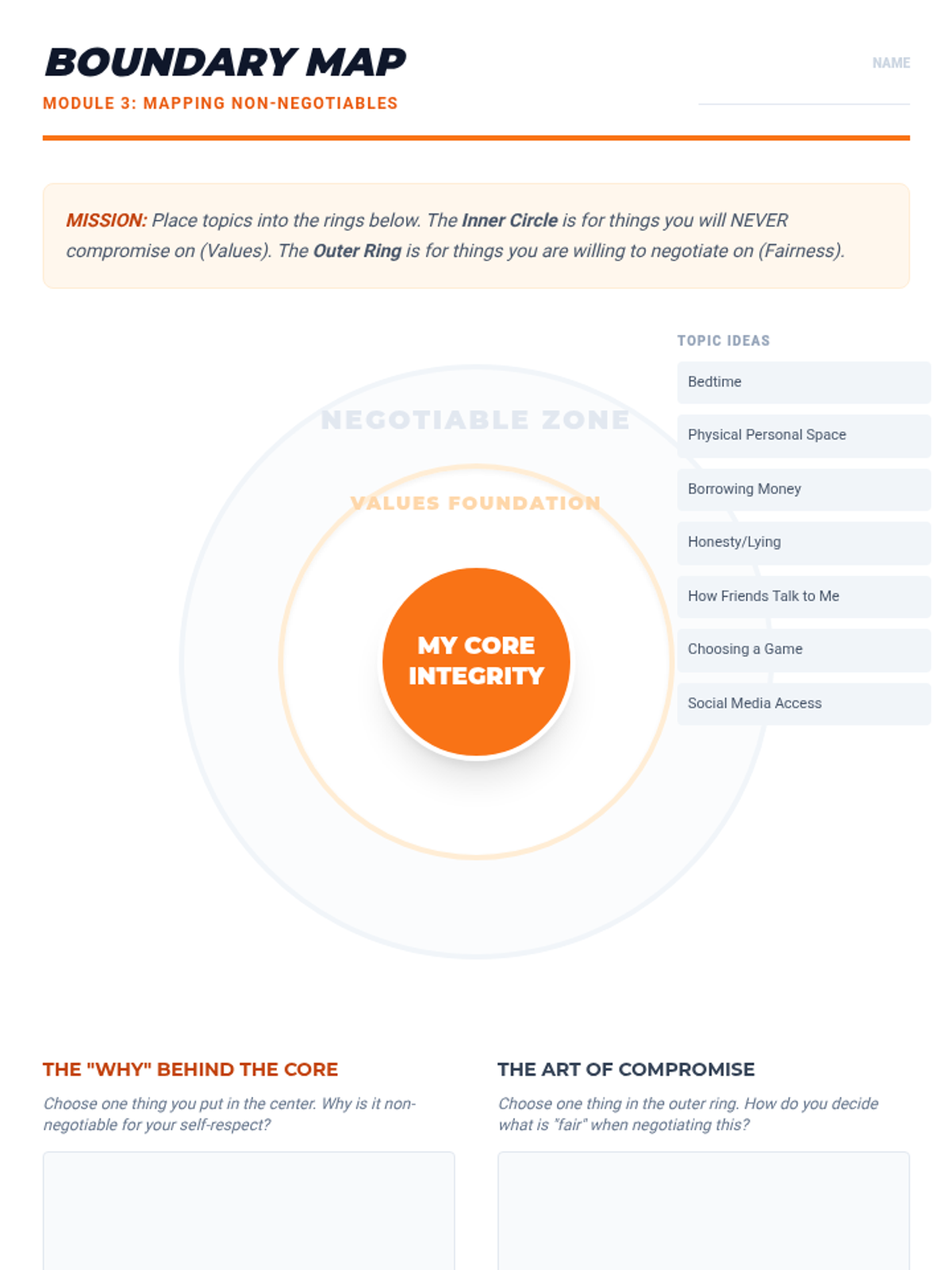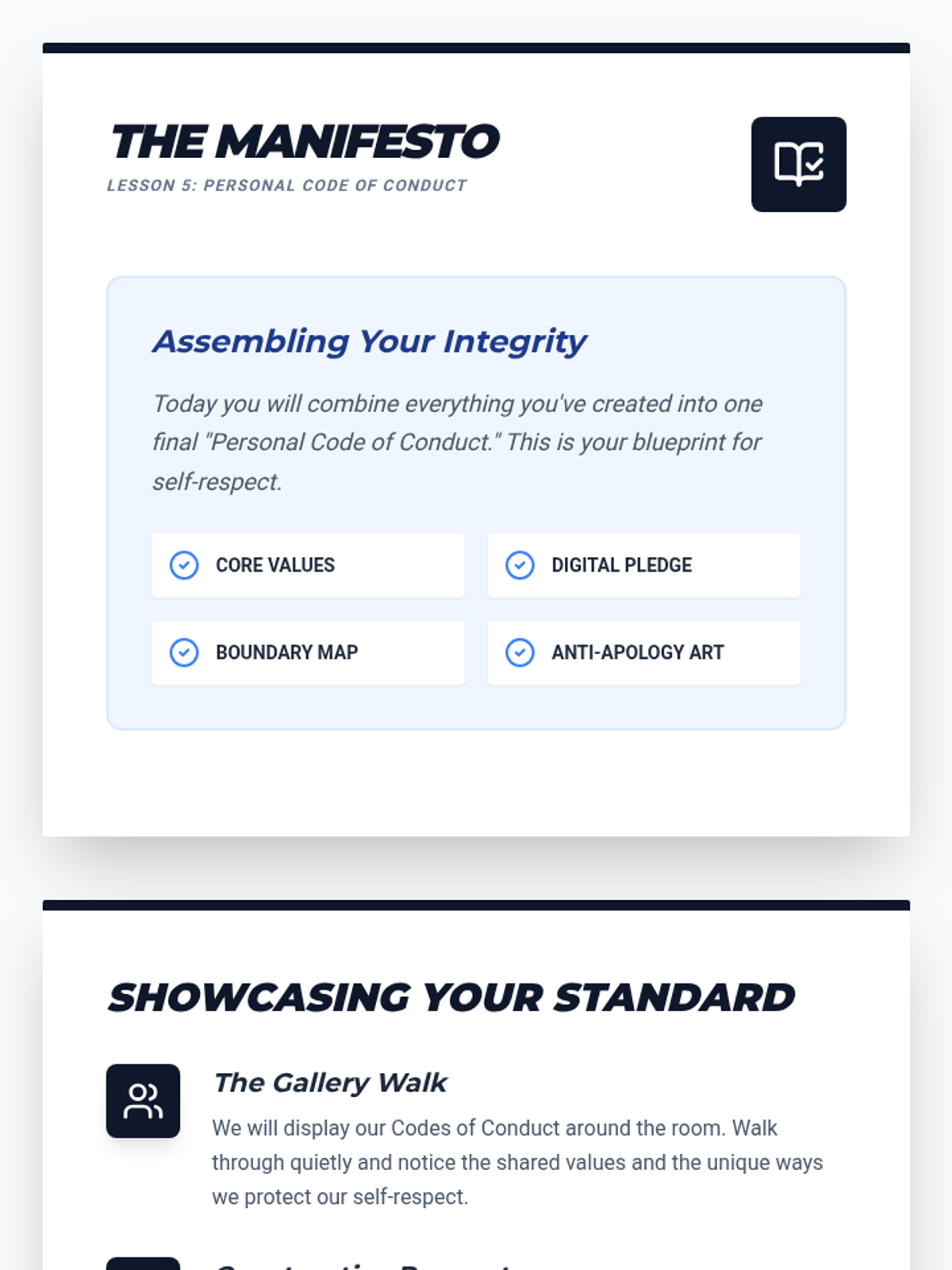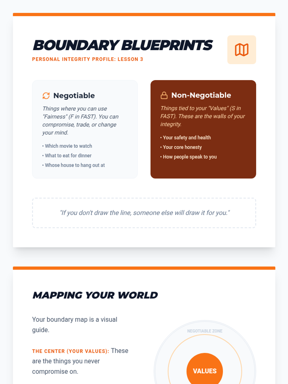 A project-based sequence for 6th graders to develop self-respect using FAST skills. Students explore personal values, digital authenticity, boundaries, and assertive communication to create a comprehensive 'Personal Code of Conduct' manifesto.