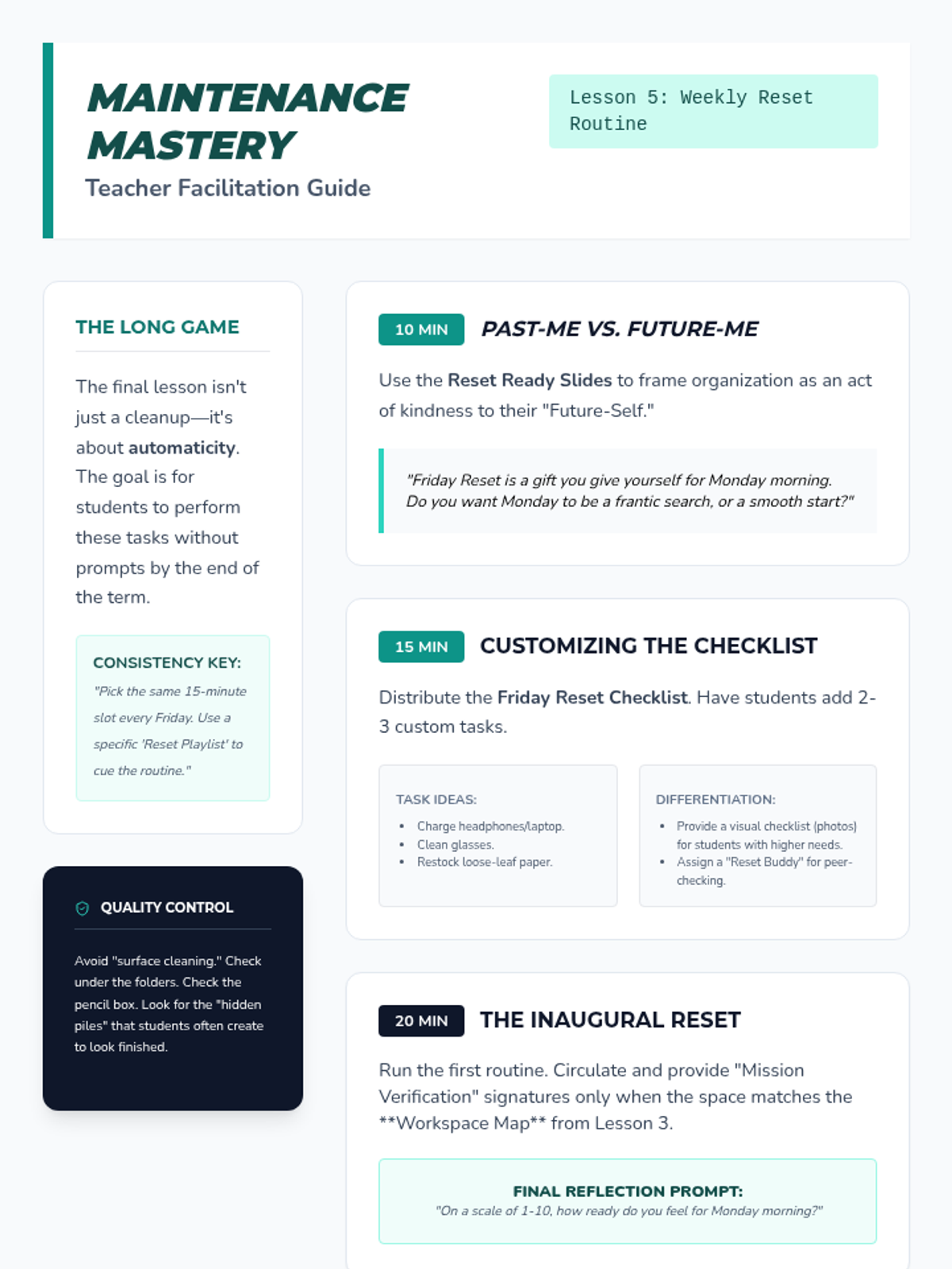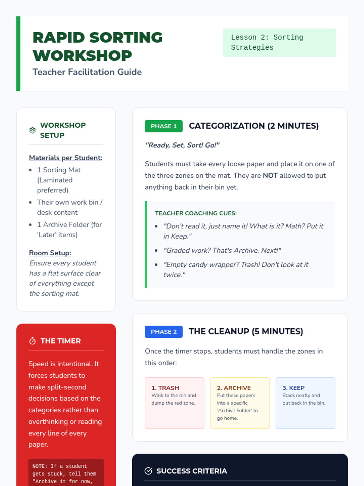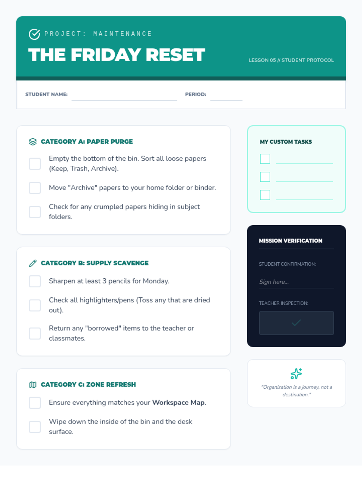 A 5-lesson sequence focused on executive functioning and physical organization for 6th-grade students. Students learn to manage work bins, sort materials, zone their workspaces, and establish maintenance routines.