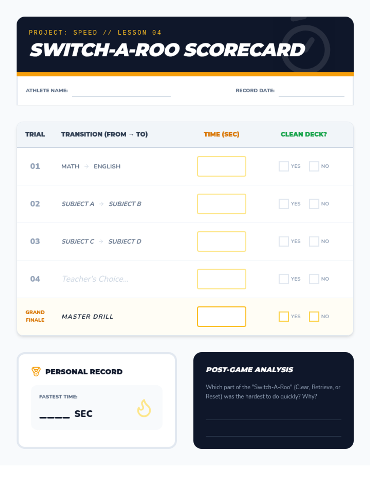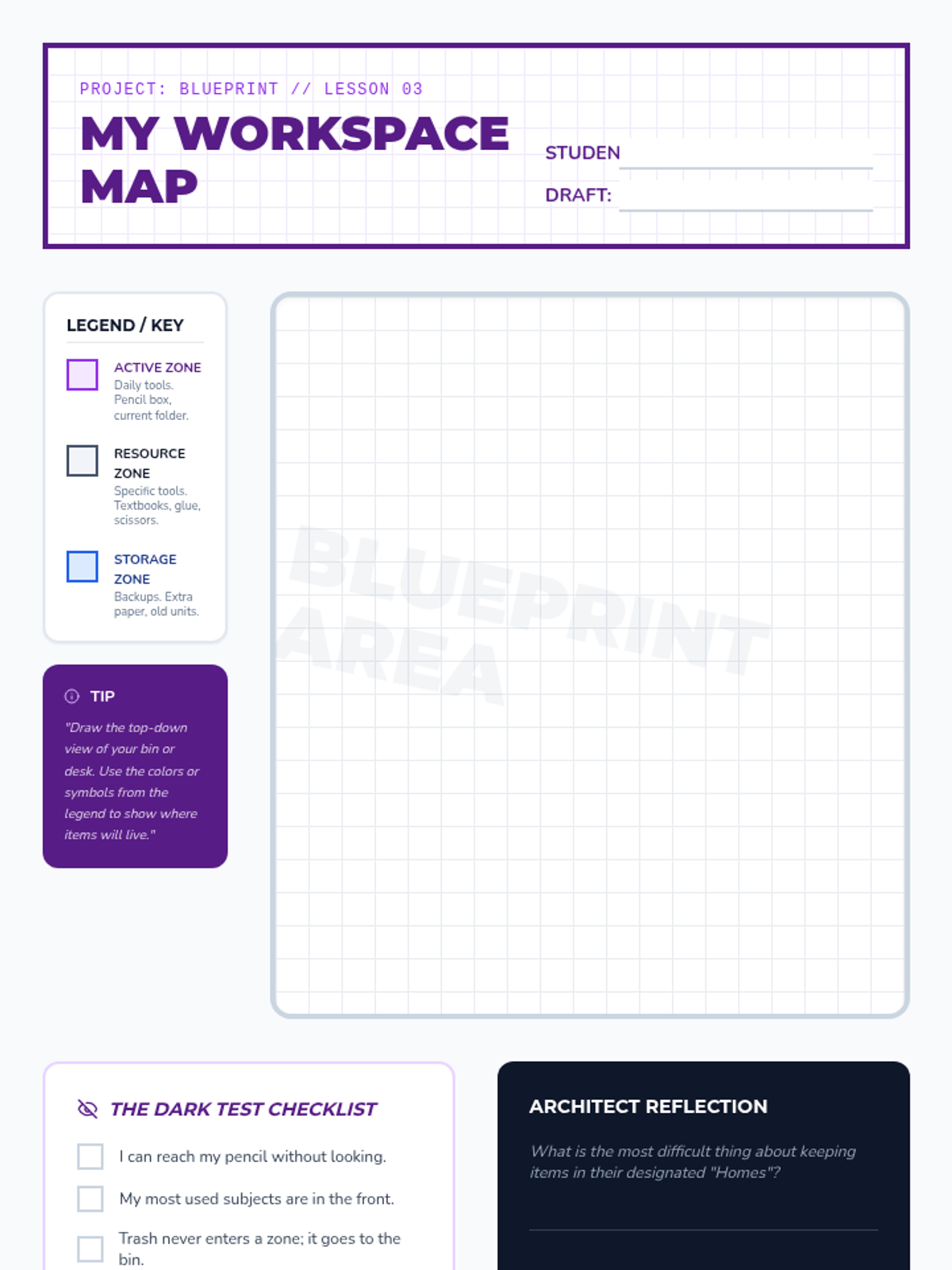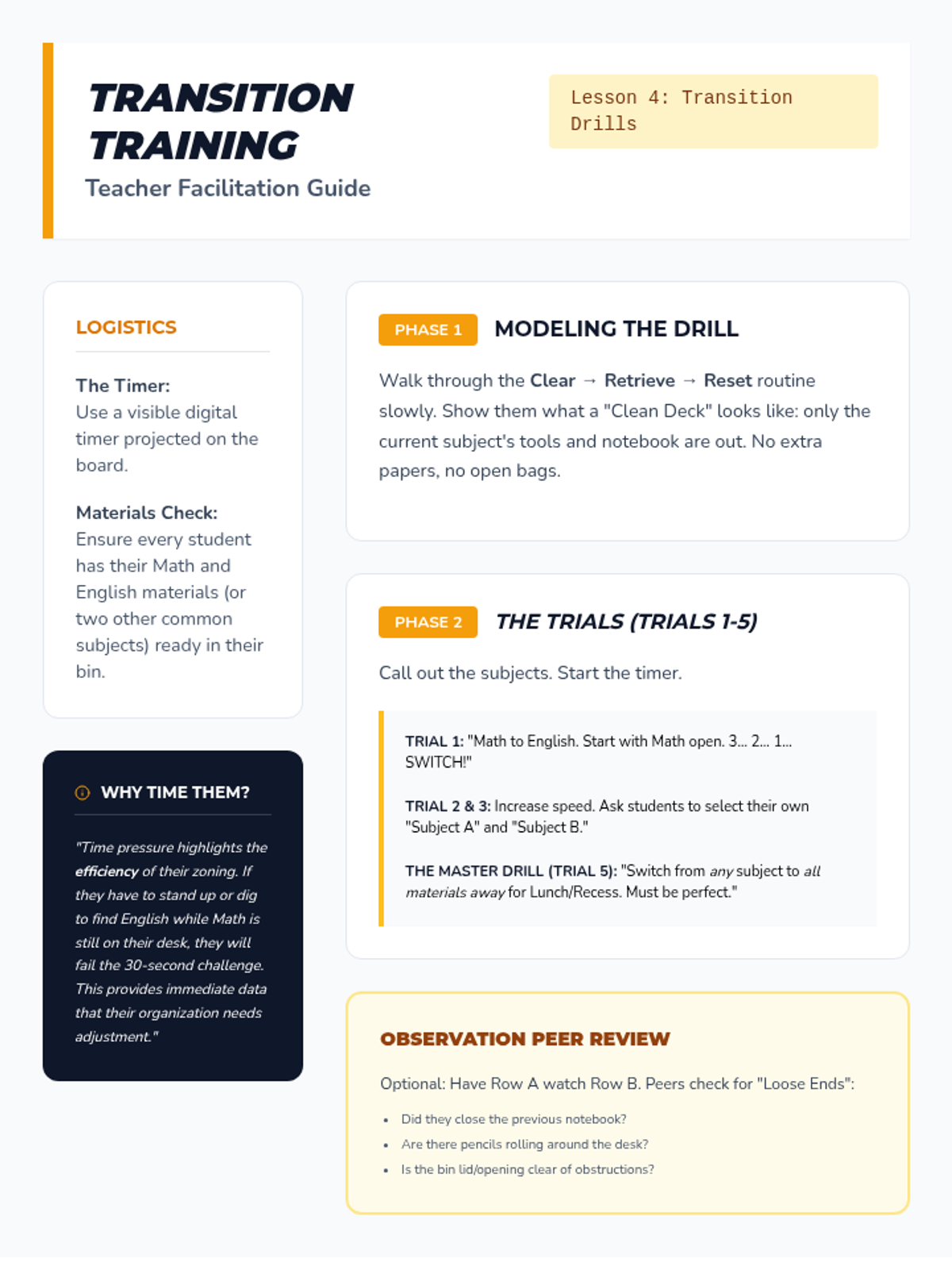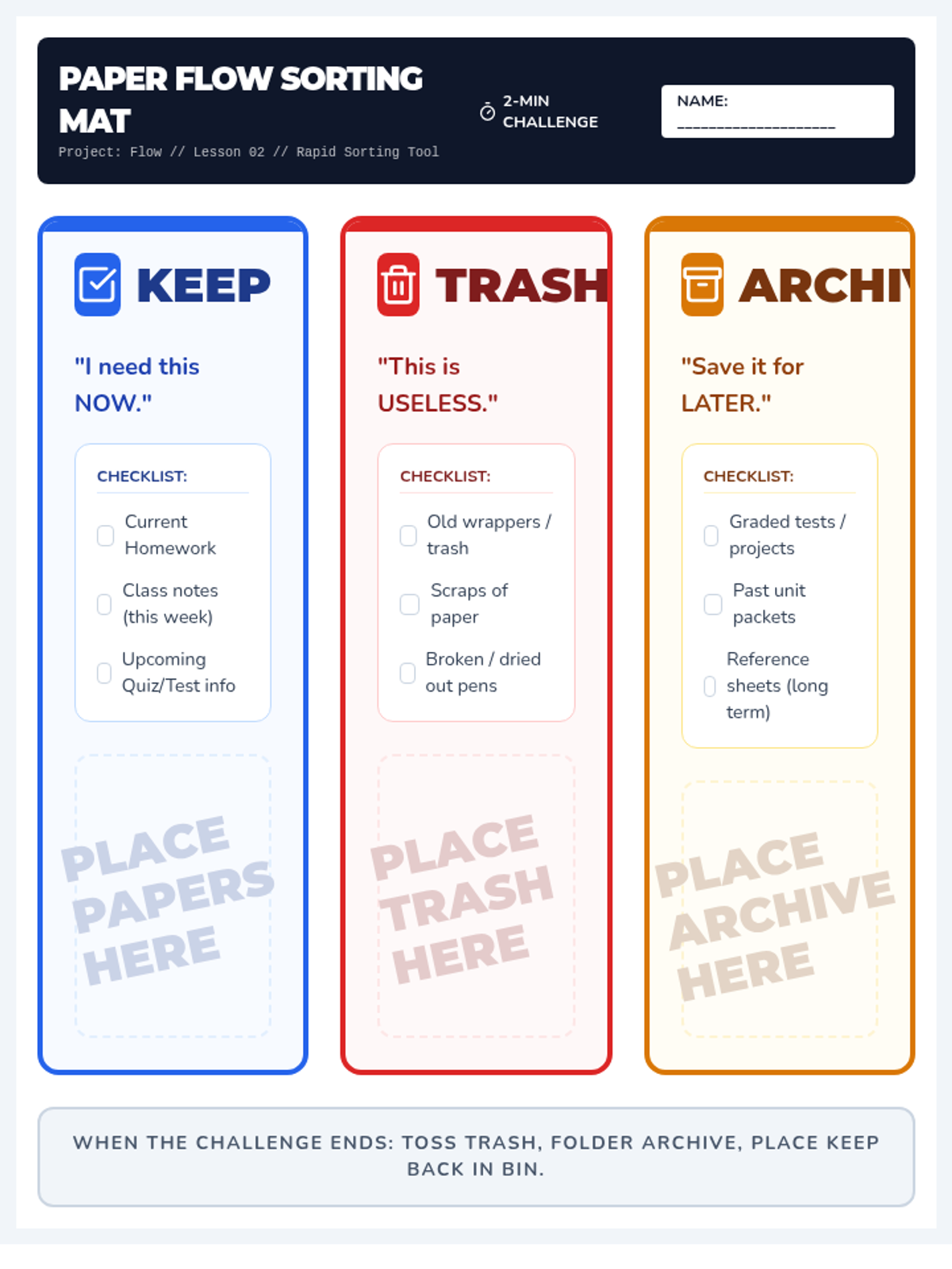 A 5-lesson sequence focused on executive functioning and physical organization for 6th-grade students. Students learn to manage work bins, sort materials, zone their workspaces, and establish maintenance routines.
