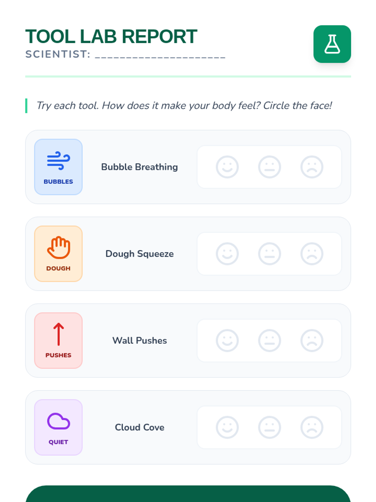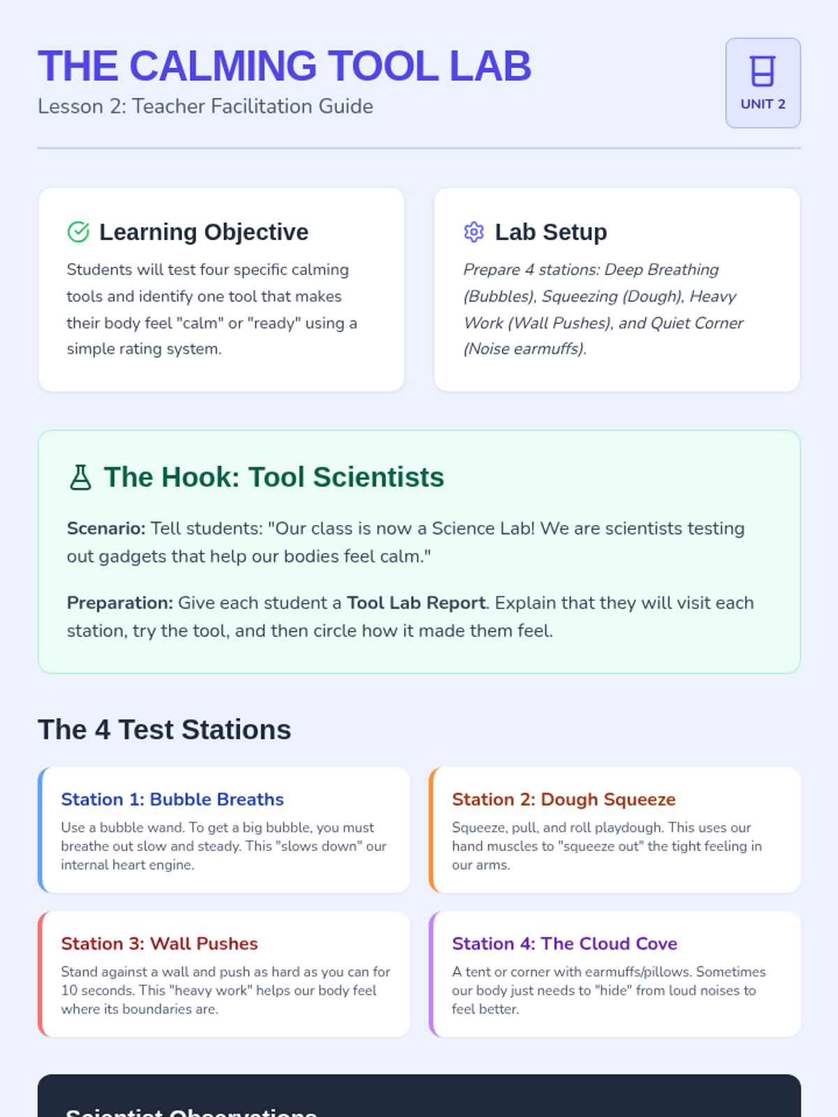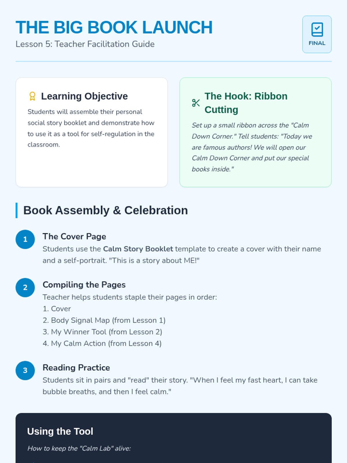 A 5-lesson unit for Pre-K students focused on interoception and self-regulation. Students identify physical distress signals, test calming tools, and create a personalized social story booklet to help them return to a state of calm.