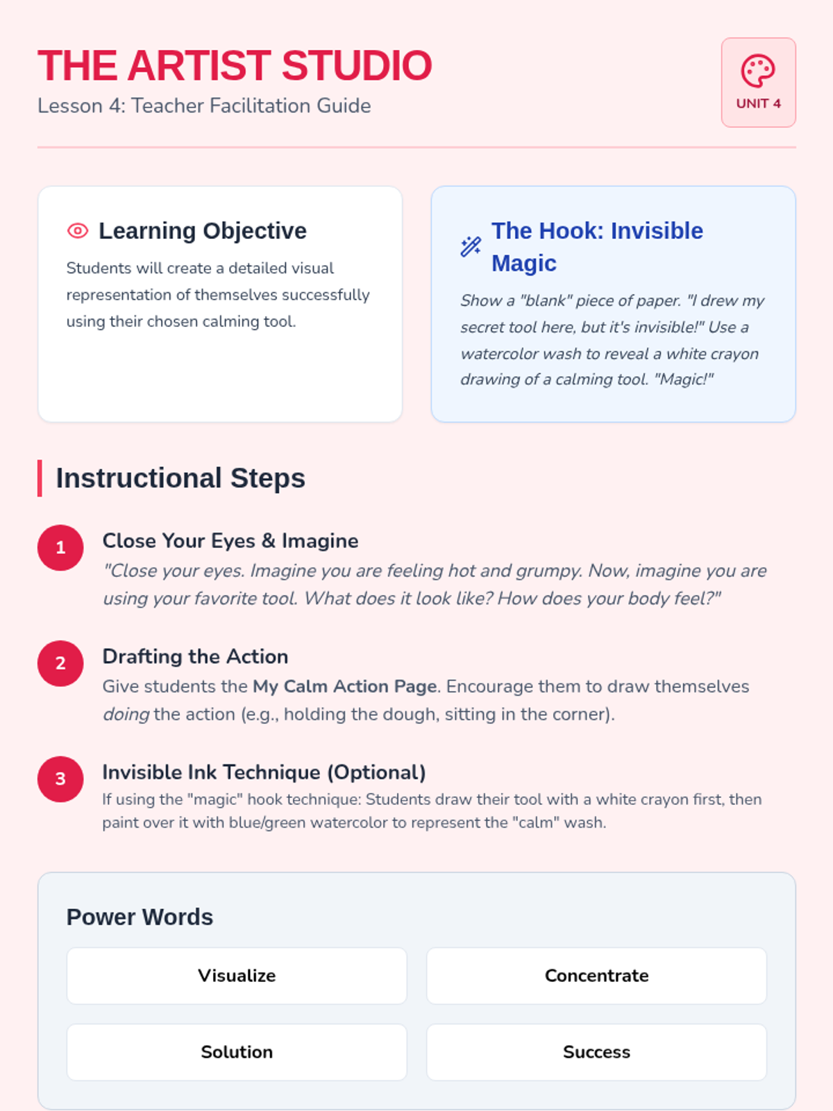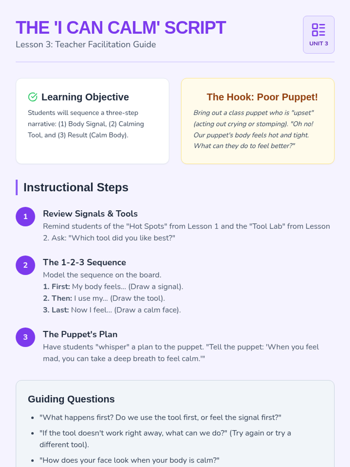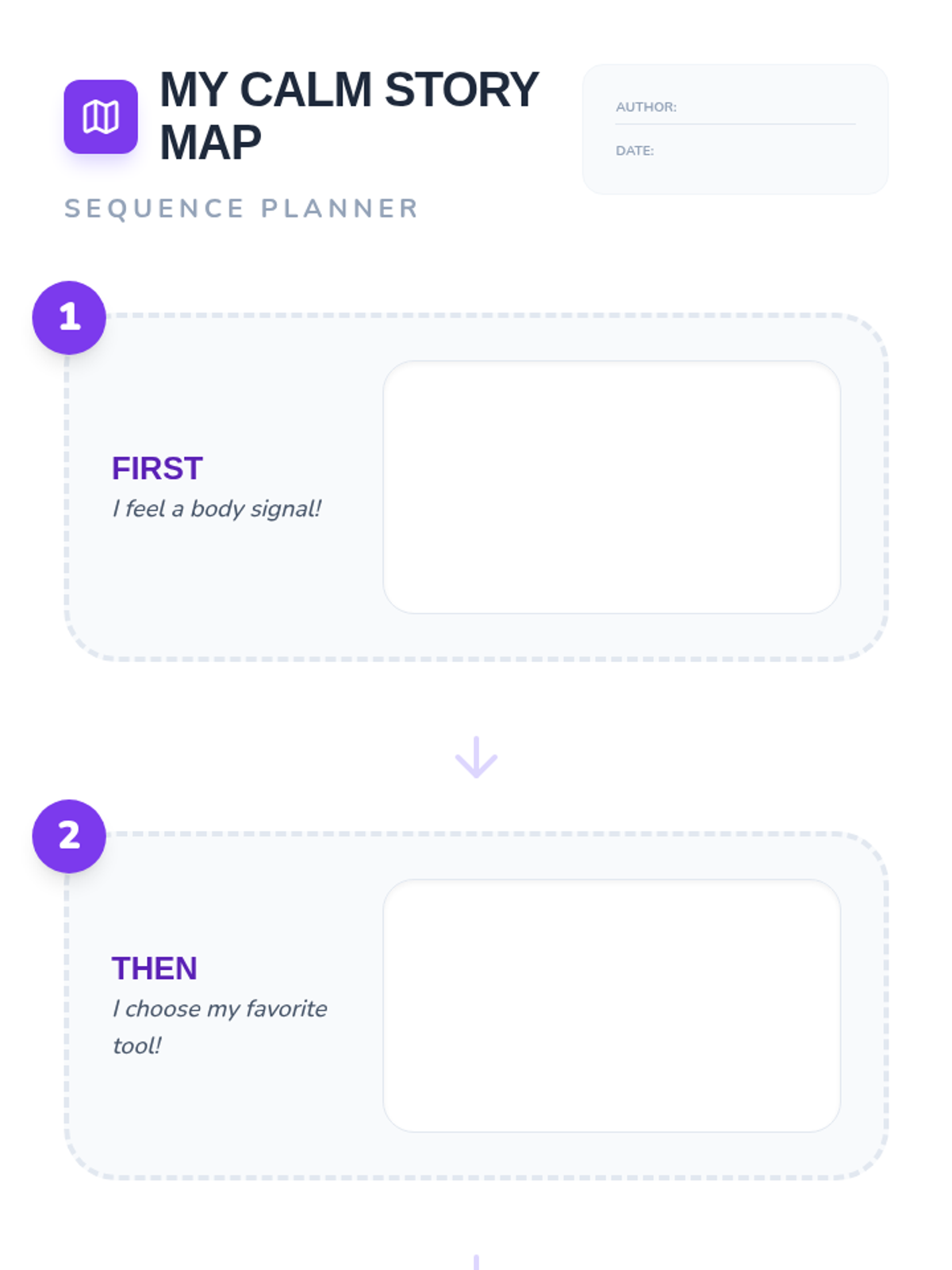 A 5-lesson unit for Pre-K students focused on interoception and self-regulation. Students identify physical distress signals, test calming tools, and create a personalized social story booklet to help them return to a state of calm.