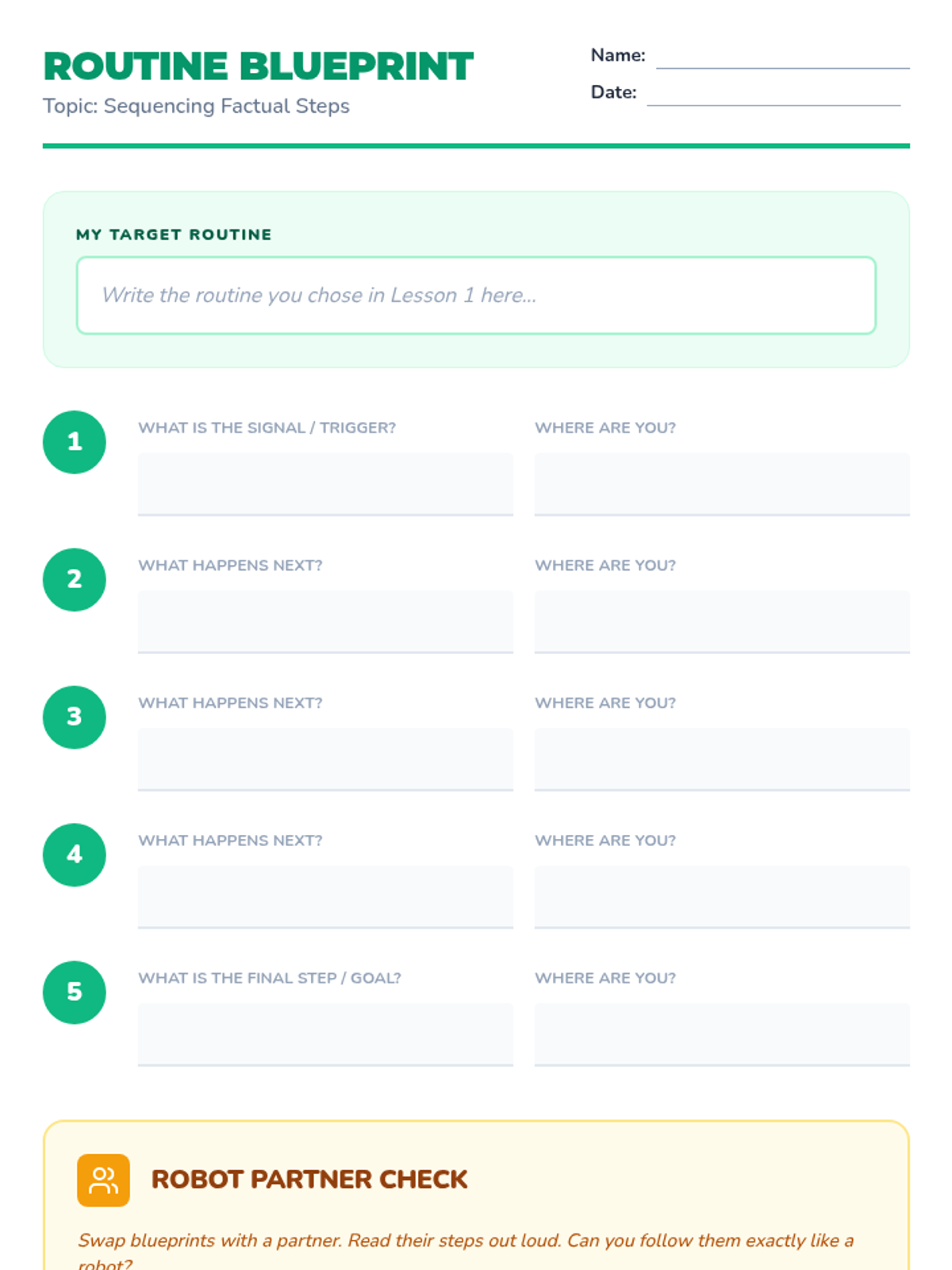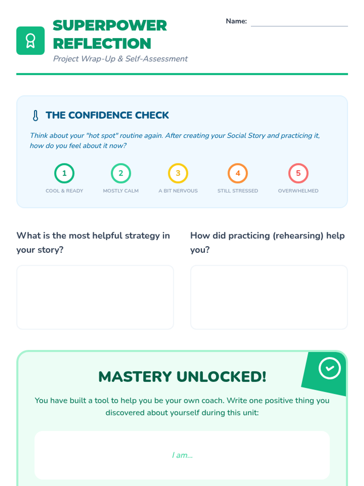 A project-based unit where 5th-grade students learn to author their own social stories to manage transitions and challenging routines. Students identify personal triggers, sequence procedural steps, and integrate coping strategies into a personalized narrative guide.