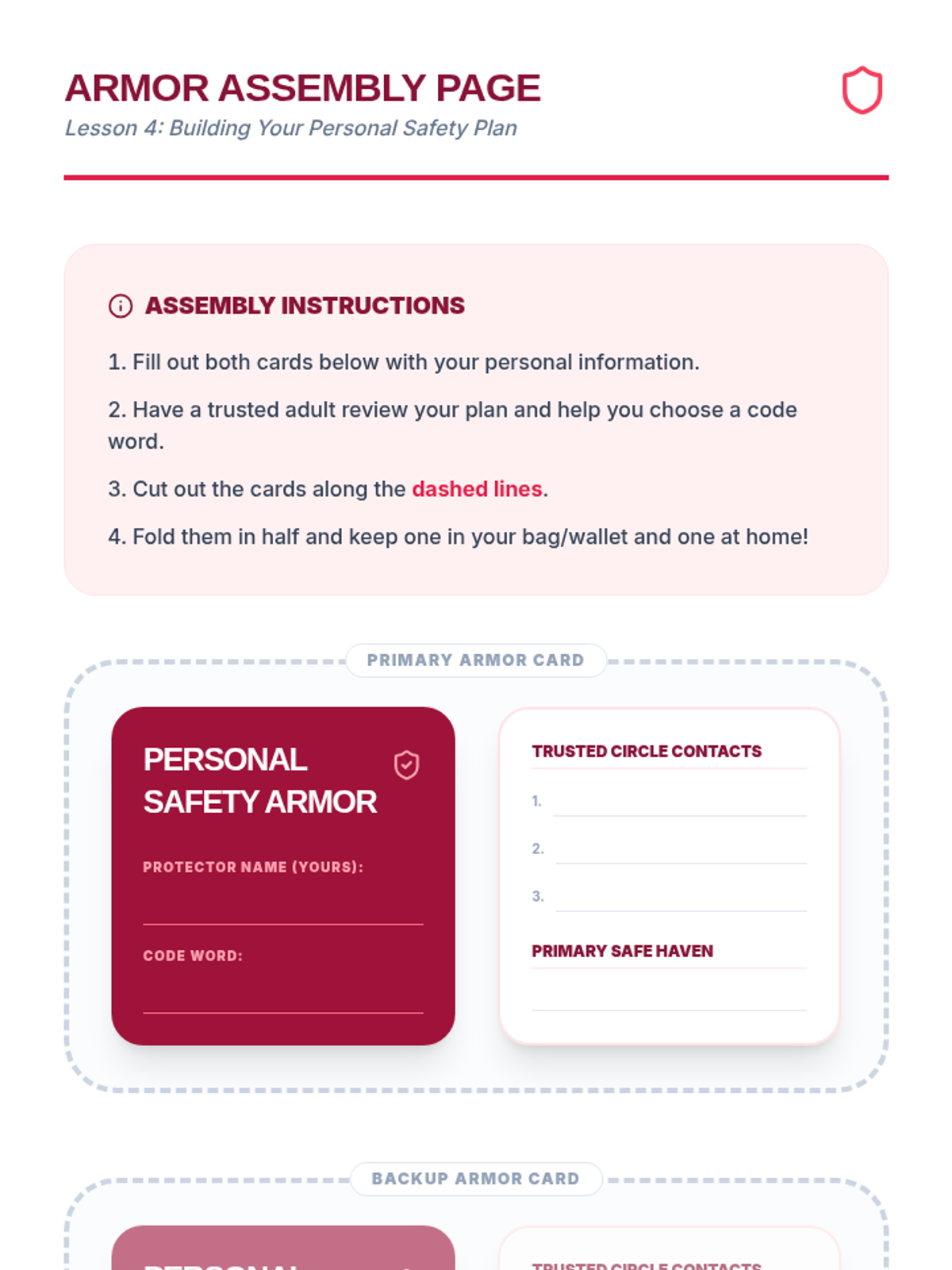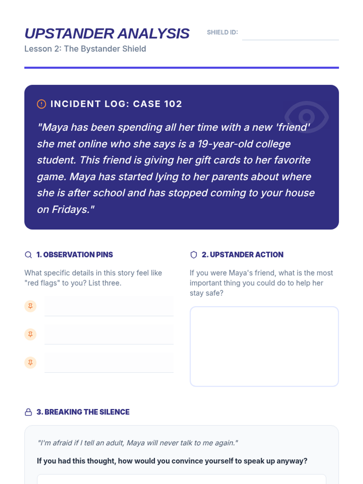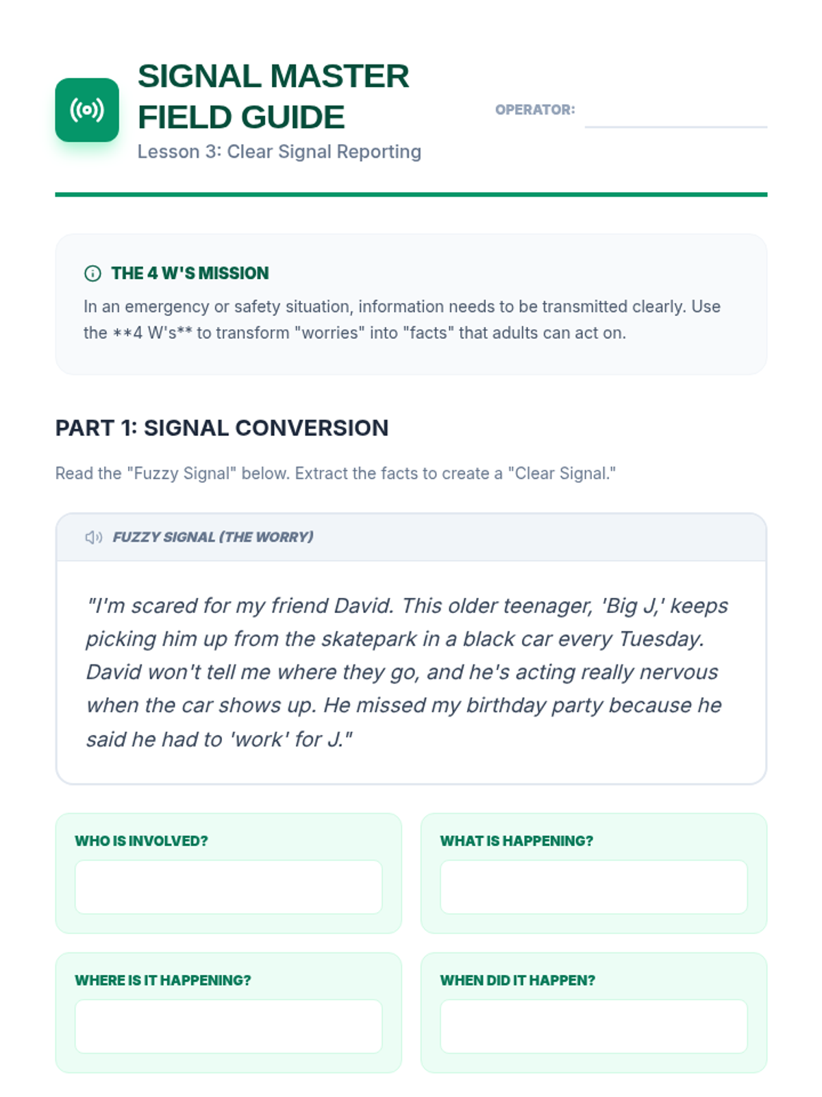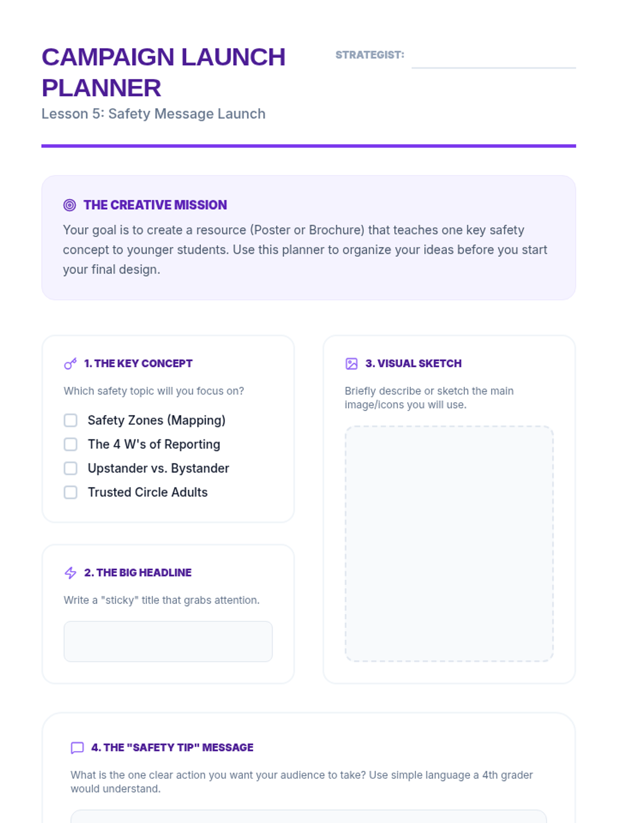 A 5th-grade sequence focused on personal safety, focusing on proactive planning, recognizing grooming behaviors in peers, and developing clear reporting skills. Students create personal safety plans and community awareness materials to reinforce their understanding of human and child trafficking prevention.