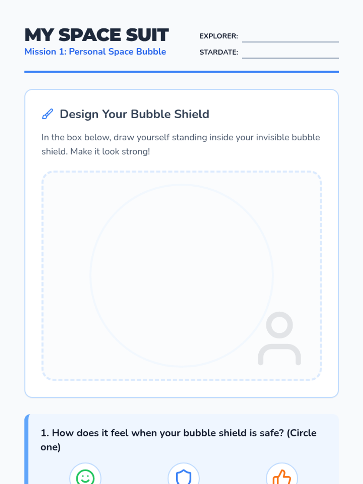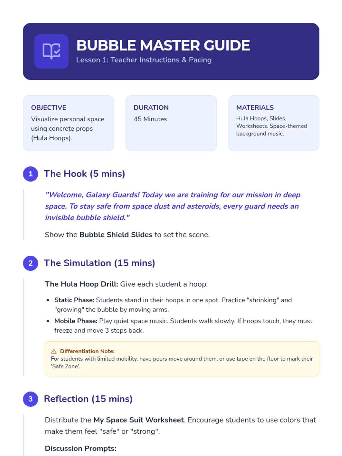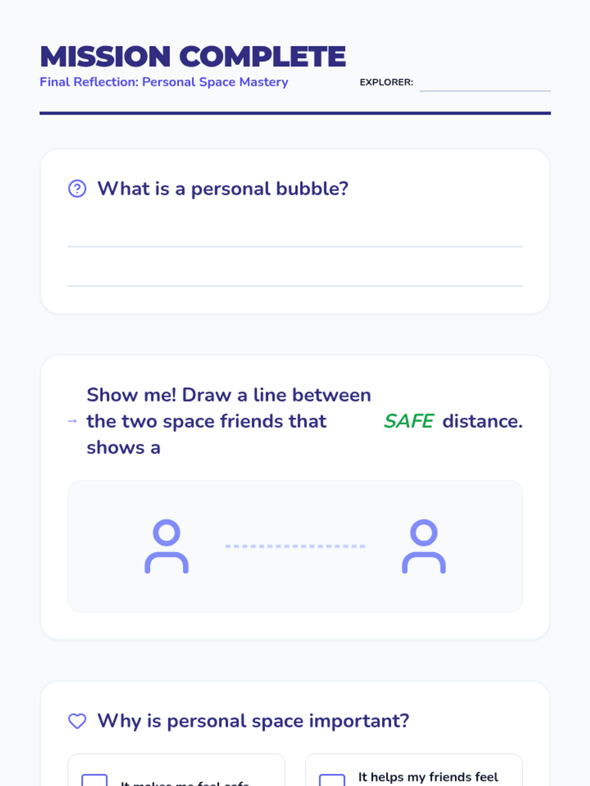 This sequence introduces personal space to 3rd grade students using a 'Space Explorer' theme. Students learn to visualize their personal bubble, use the arm-length rule, navigate shared spaces, line up effectively, and self-monitor their social distance.