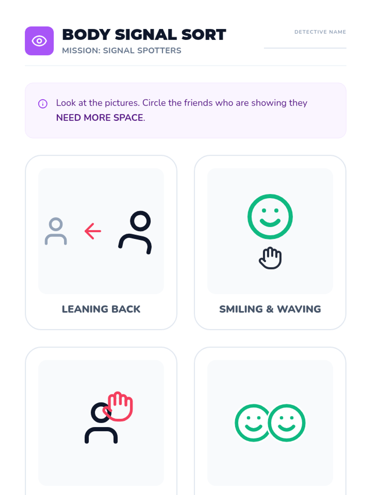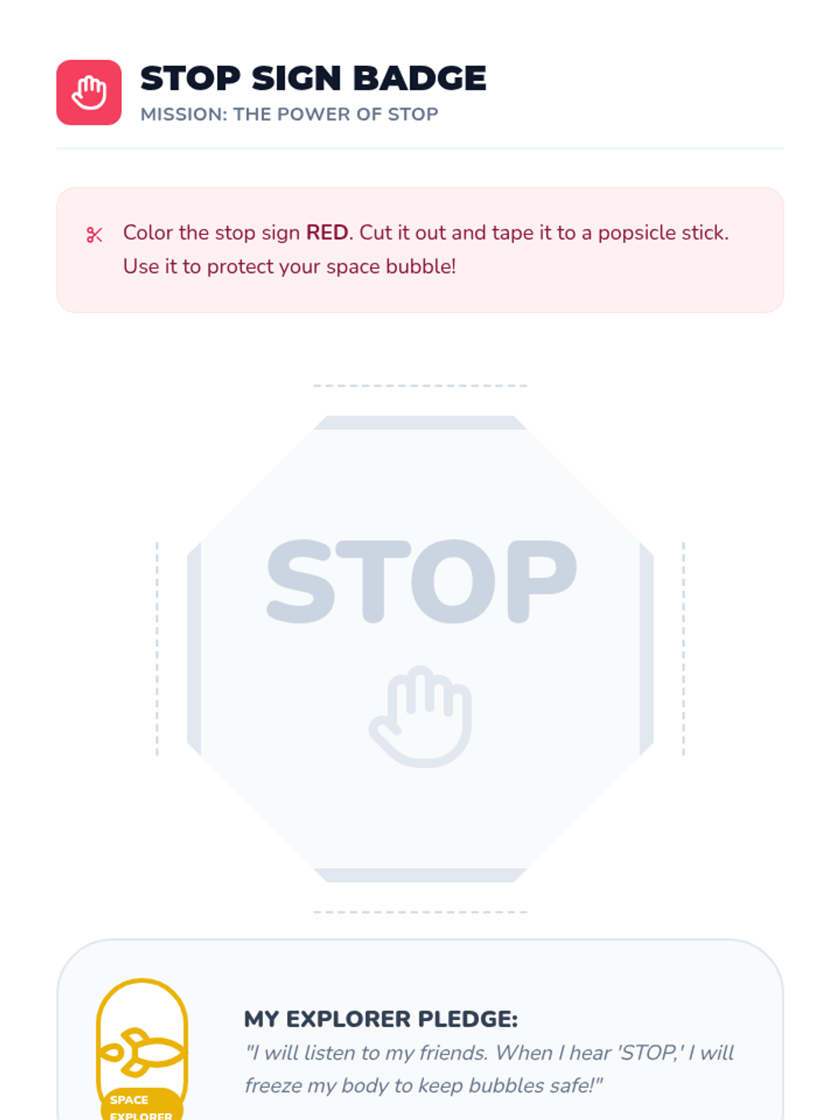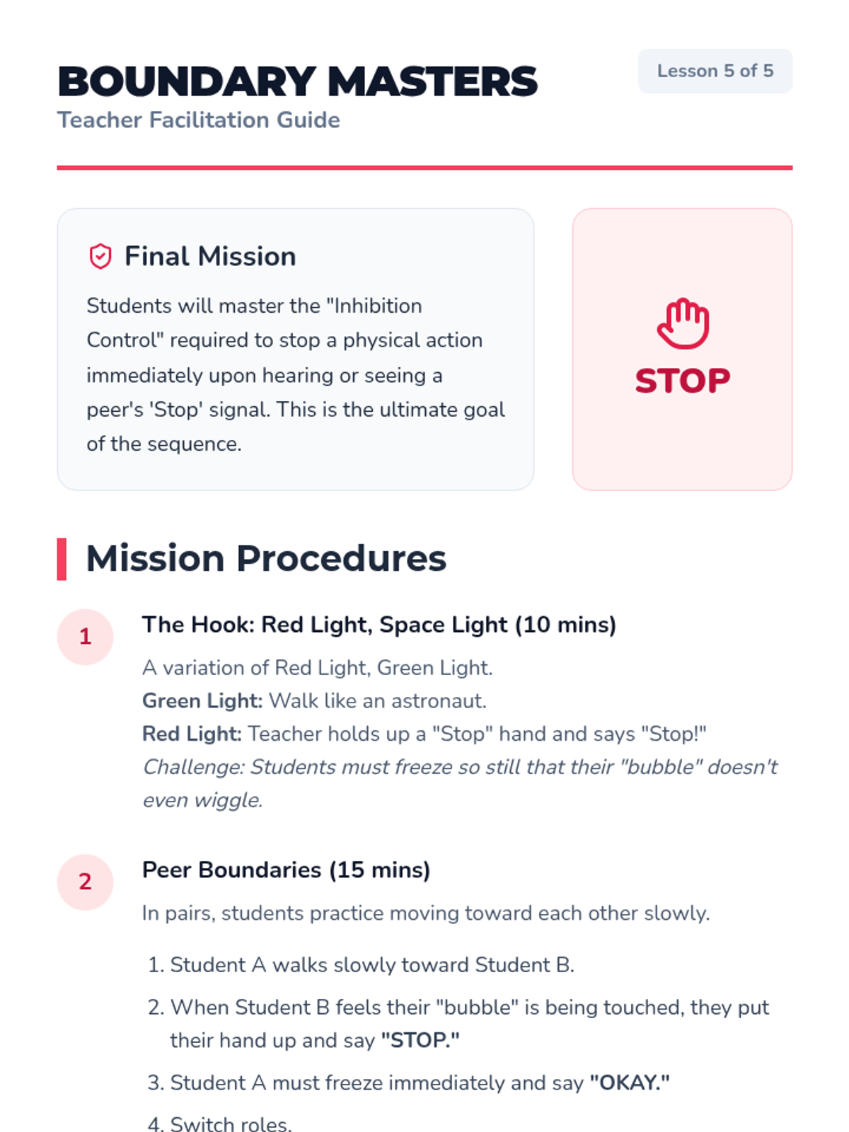 This sequence helps Pre-K students understand and evaluate personal space and physical boundaries. Through a 'Space Explorer' theme, students learn to visualize their personal bubble, ask for permission, read non-verbal cues, and respond appropriately to 'stop' signals.