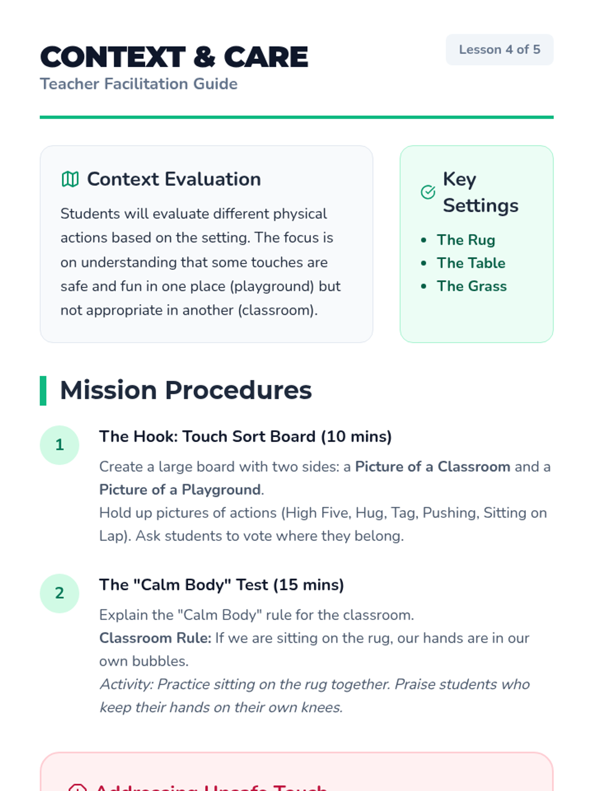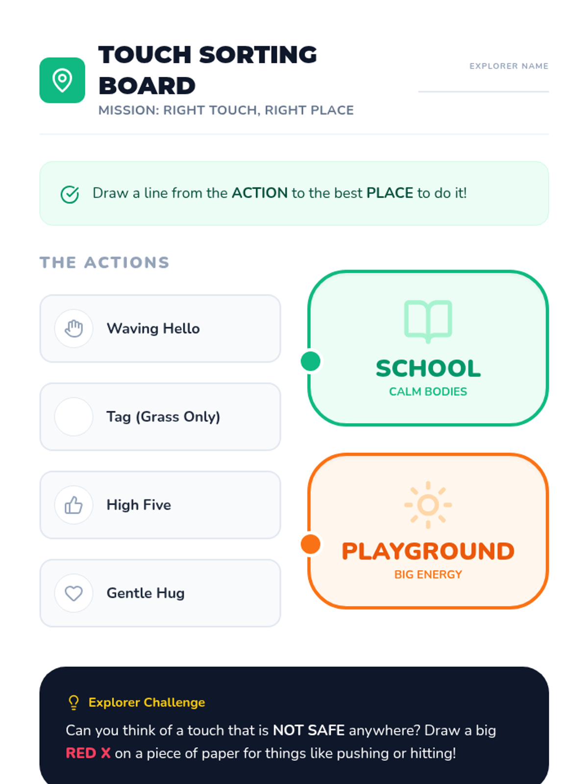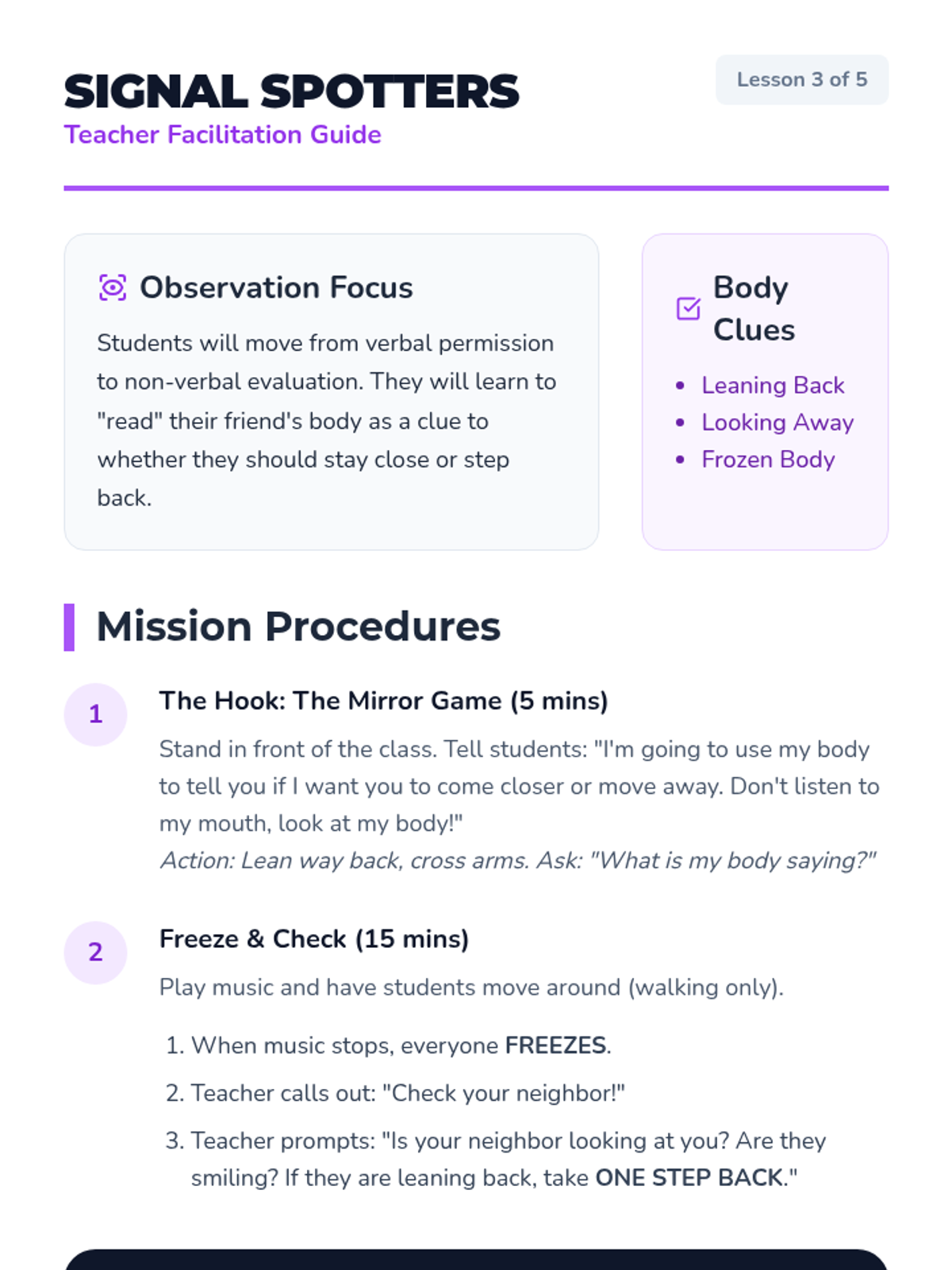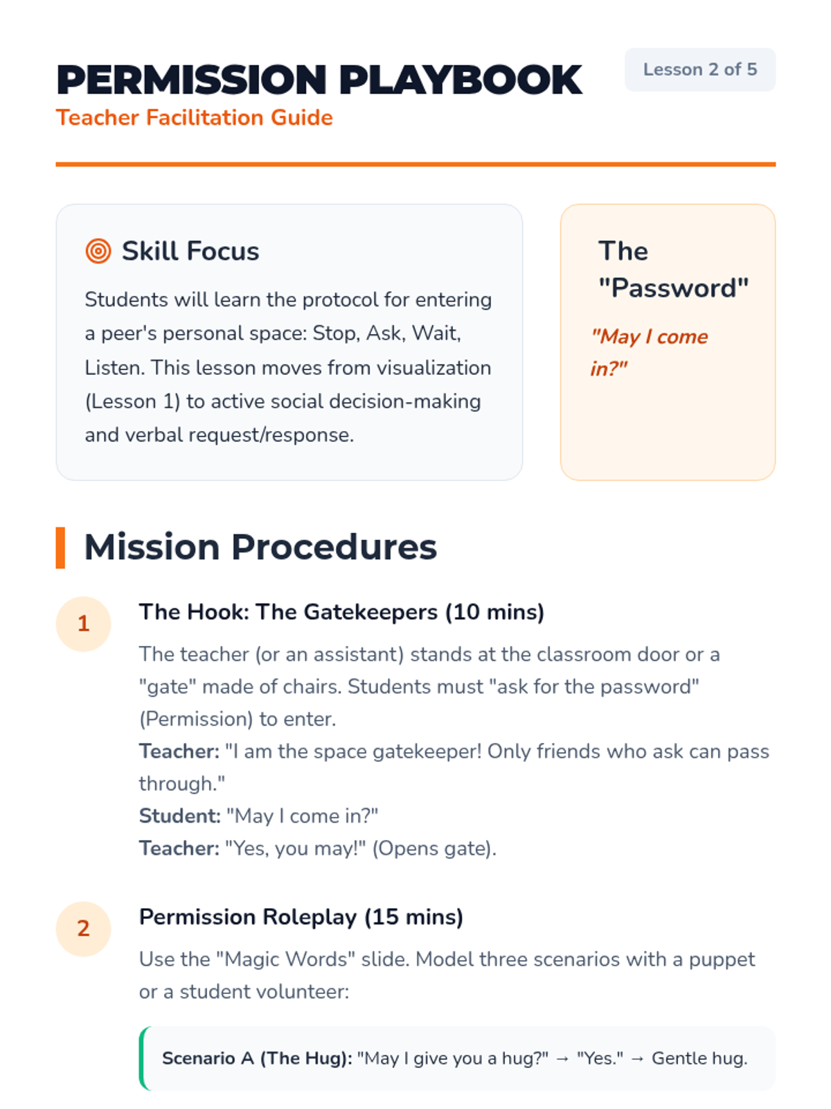 This sequence helps Pre-K students understand and evaluate personal space and physical boundaries. Through a 'Space Explorer' theme, students learn to visualize their personal bubble, ask for permission, read non-verbal cues, and respond appropriately to 'stop' signals.
