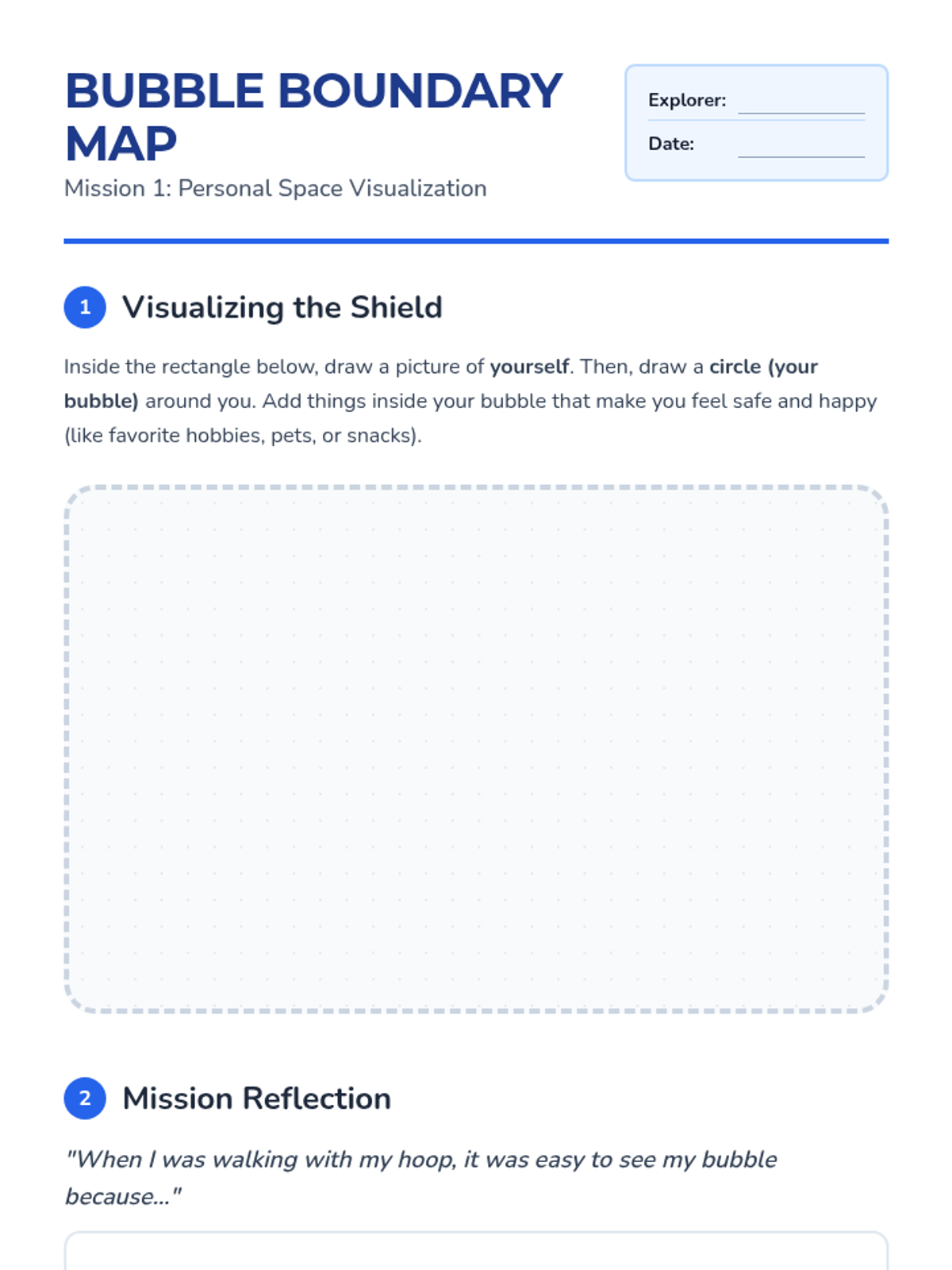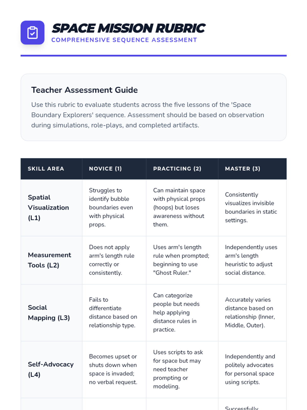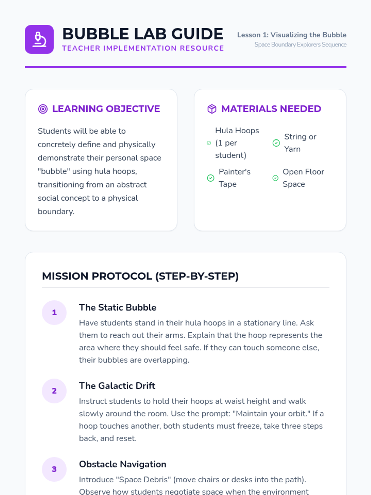This sequence uses a 'Space Explorer' theme to teach 5th-grade students about personal space and social boundaries. Students move from concrete visualizations of their 'space bubble' to understanding the nuances of social distance based on relationships and dynamic movement.