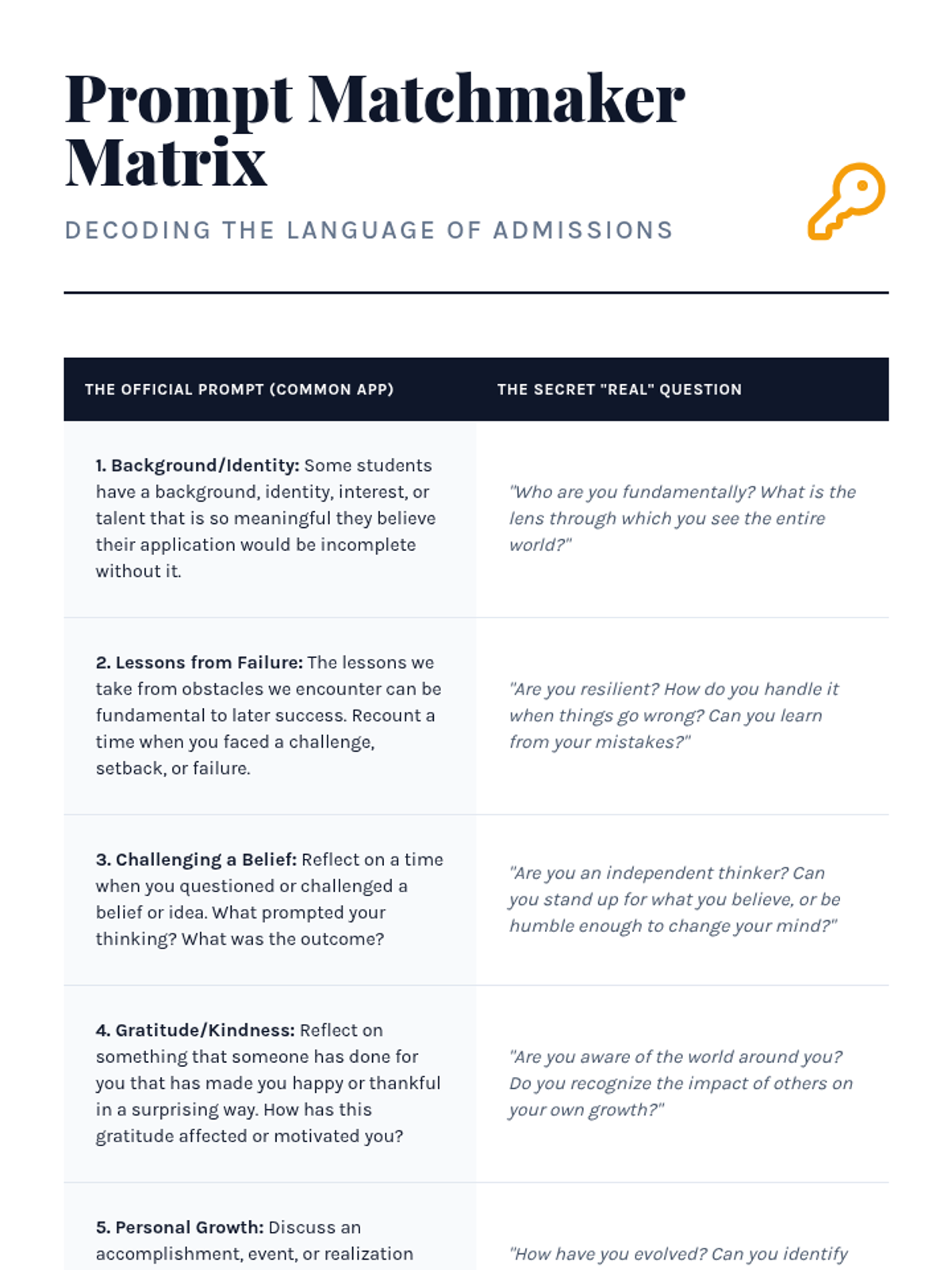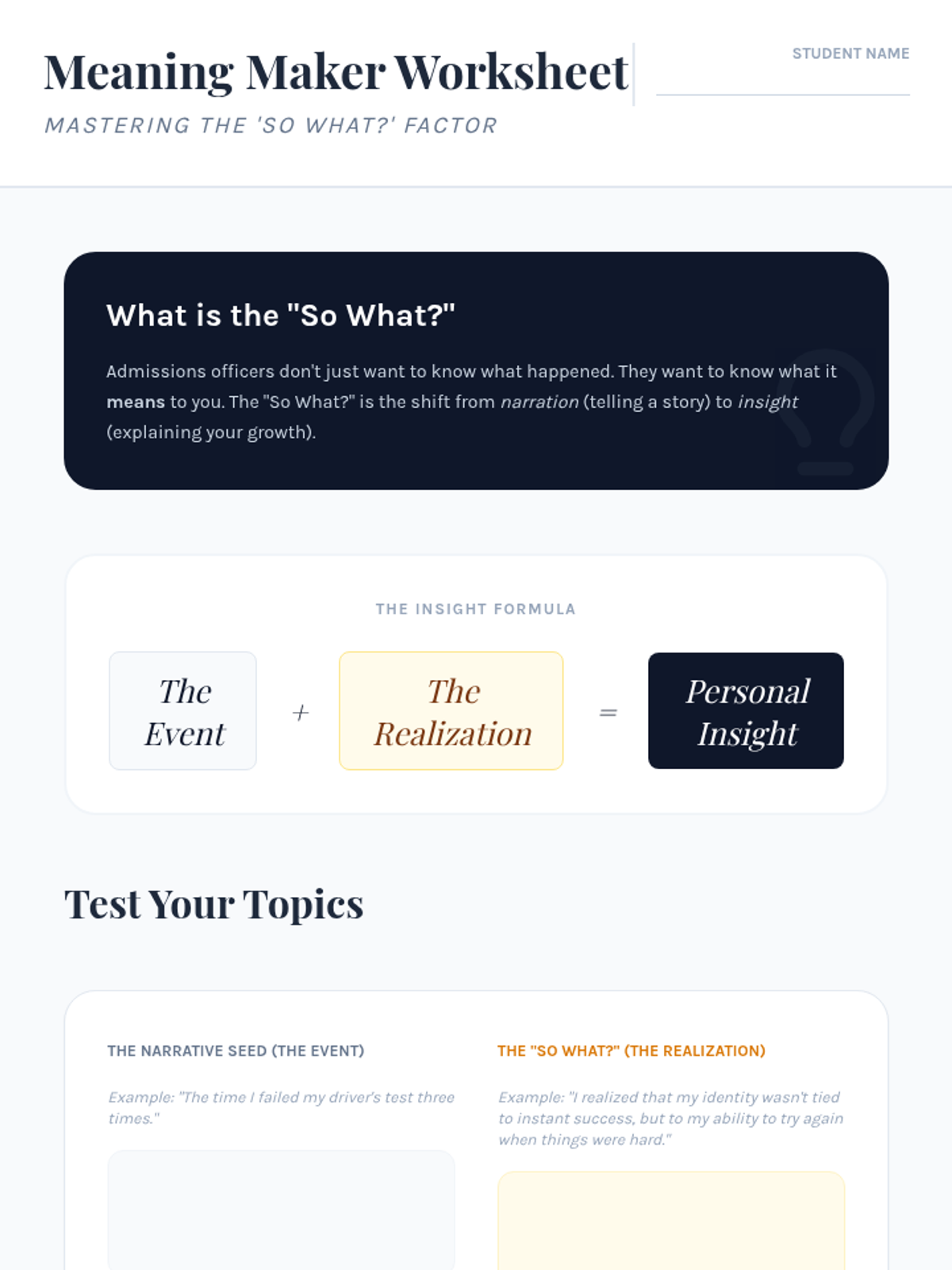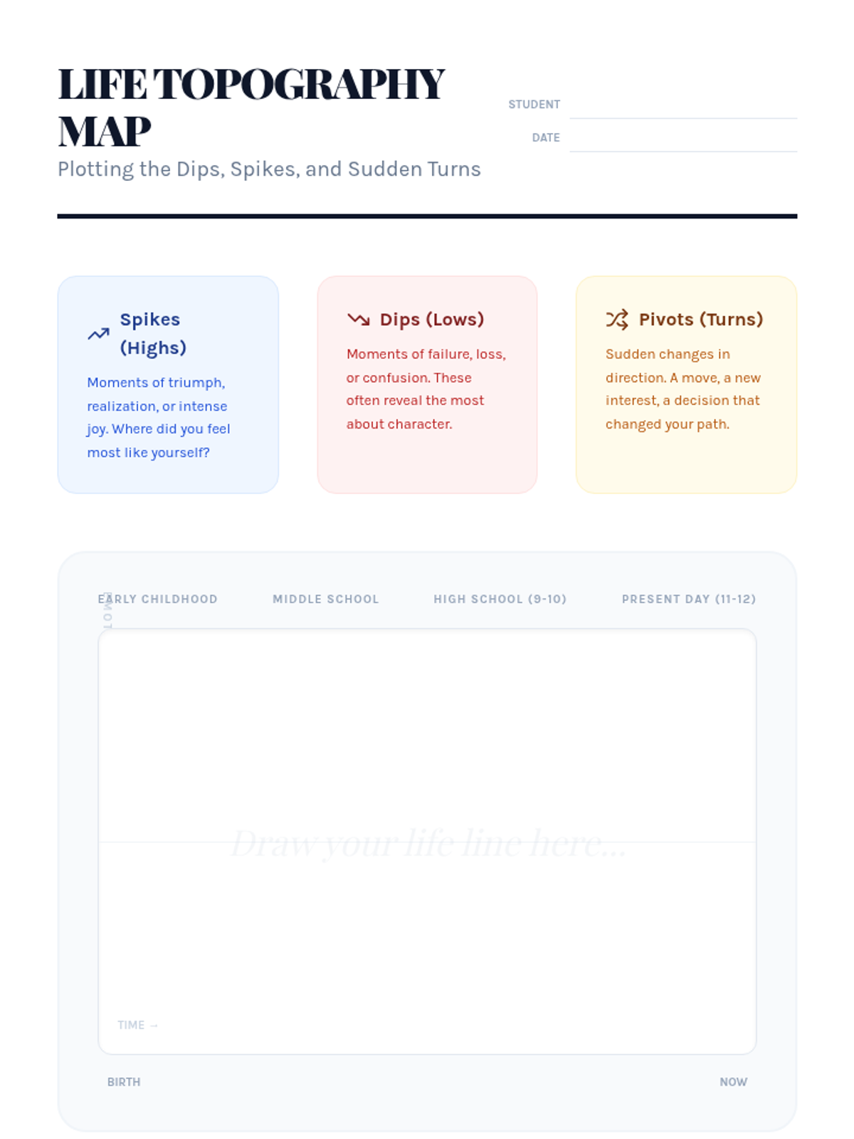 A comprehensive sequence for 12th-grade students to brainstorm and select a compelling topic for their college personal statement. The sequence moves from abstract values to concrete narrative pitches.