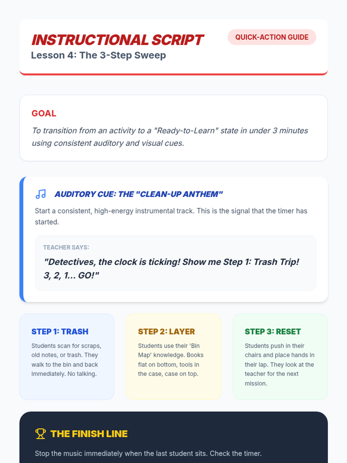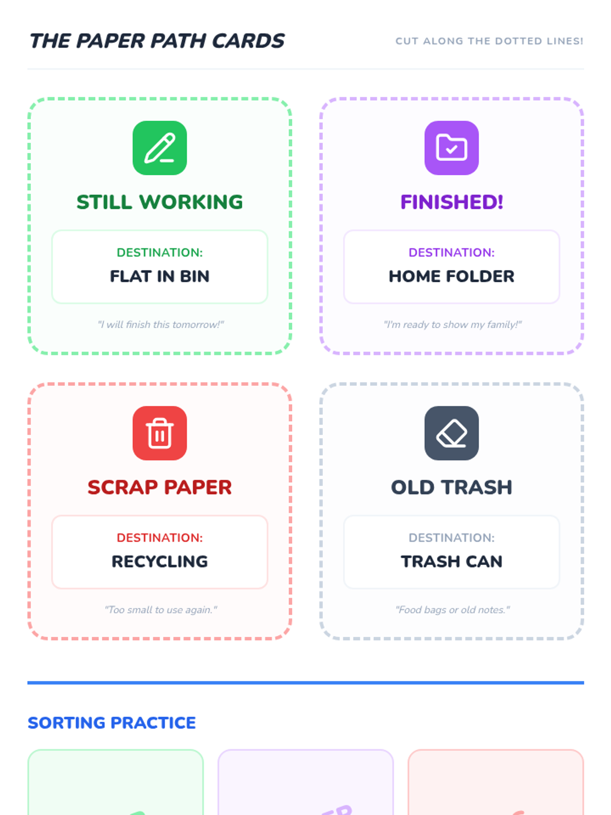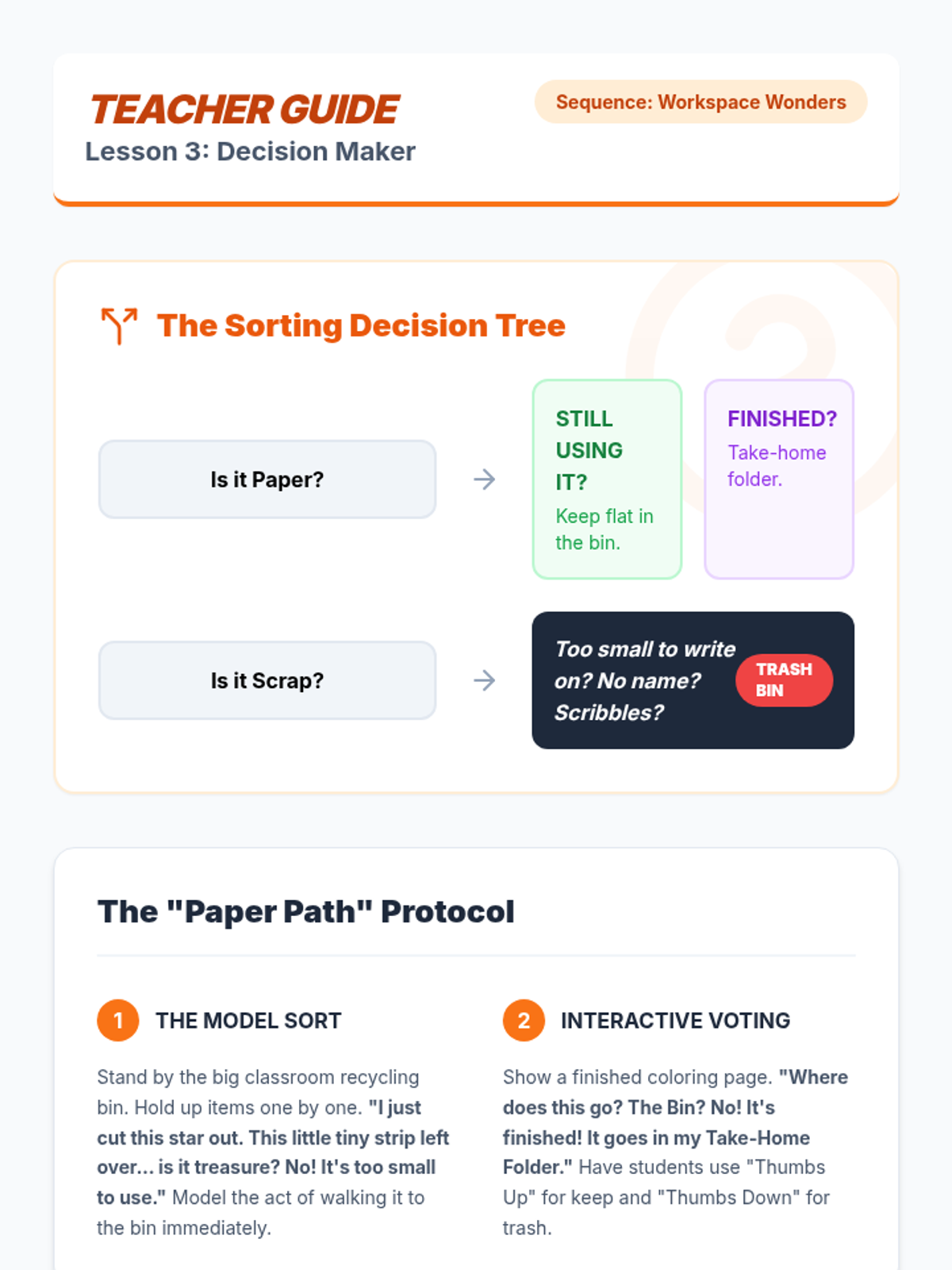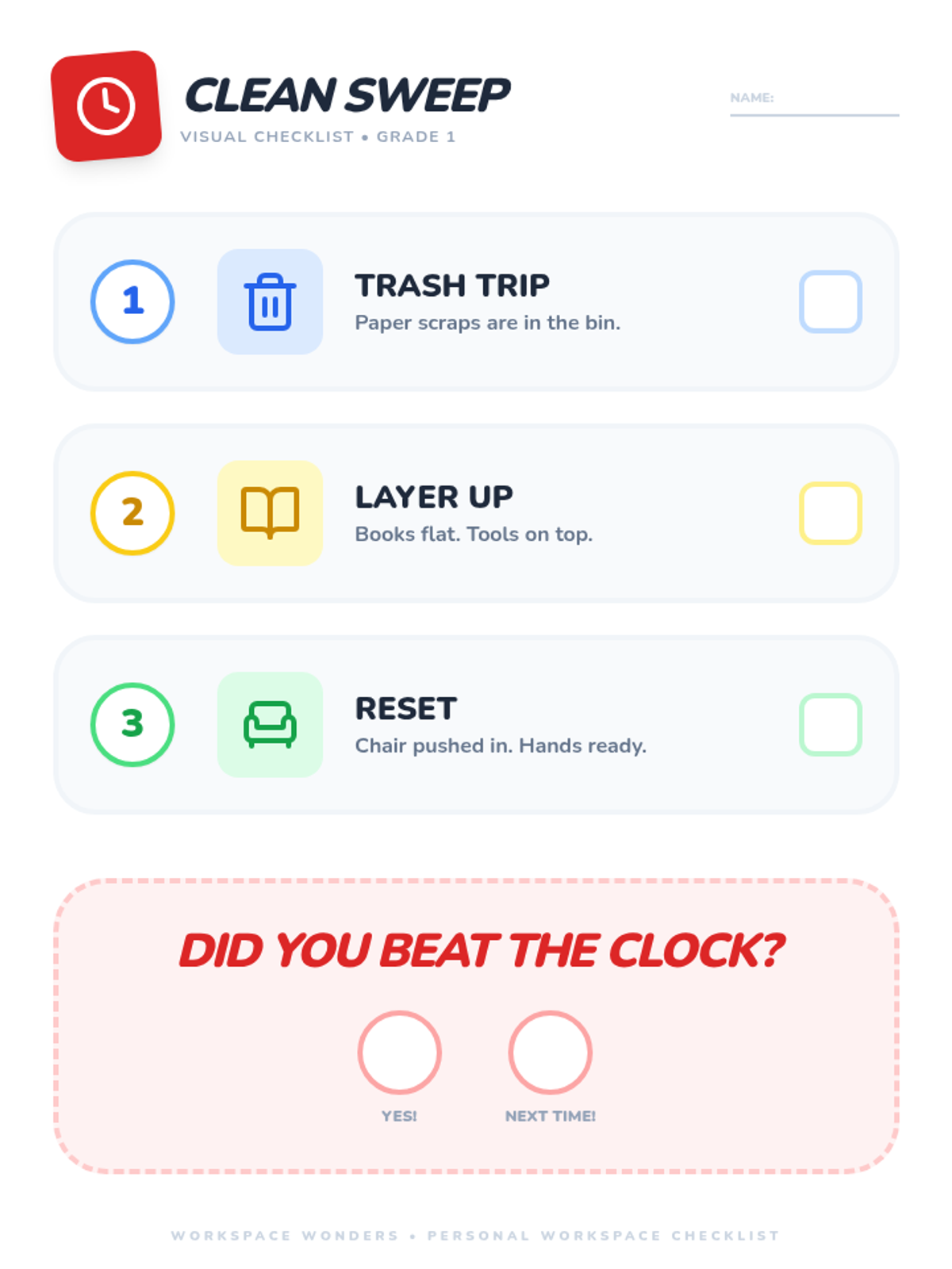 A comprehensive sequence designed for first-grade students in a special education setting to master personal workspace organization. Through the 'Desk Detective' theme, students learn to identify essential tools, map their storage bins, manage paper waste, and follow a consistent reset routine.