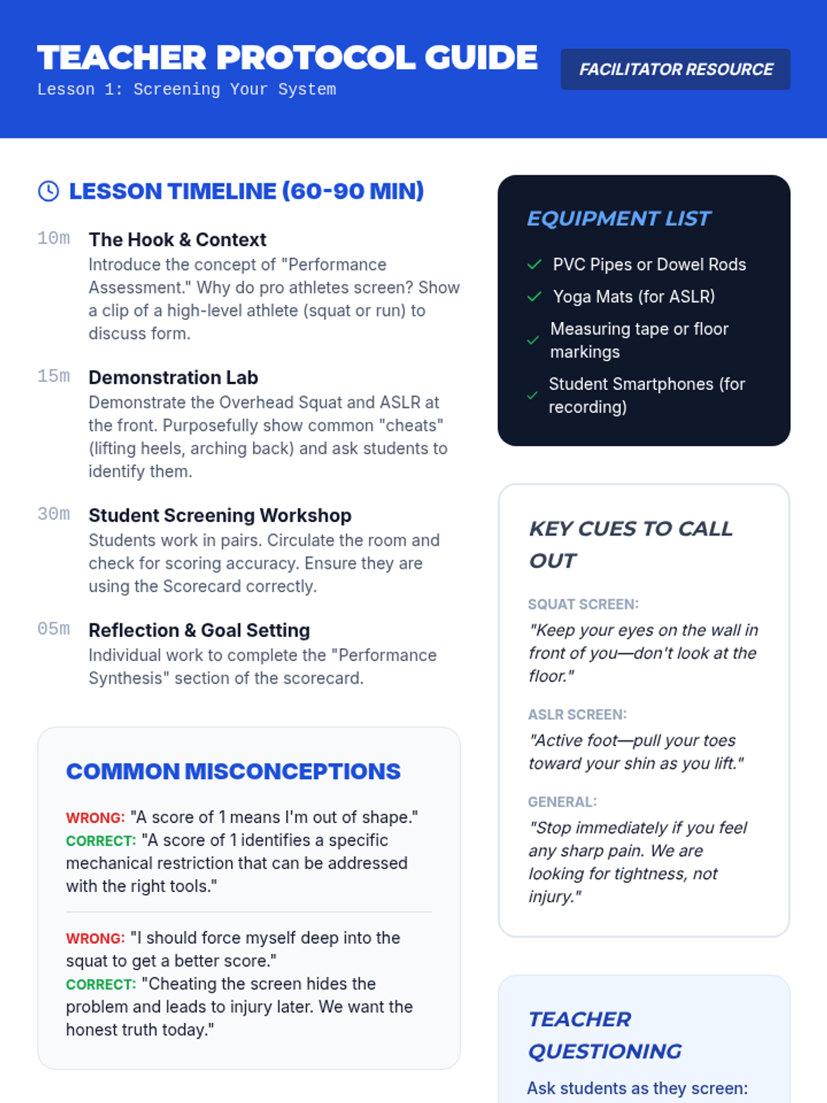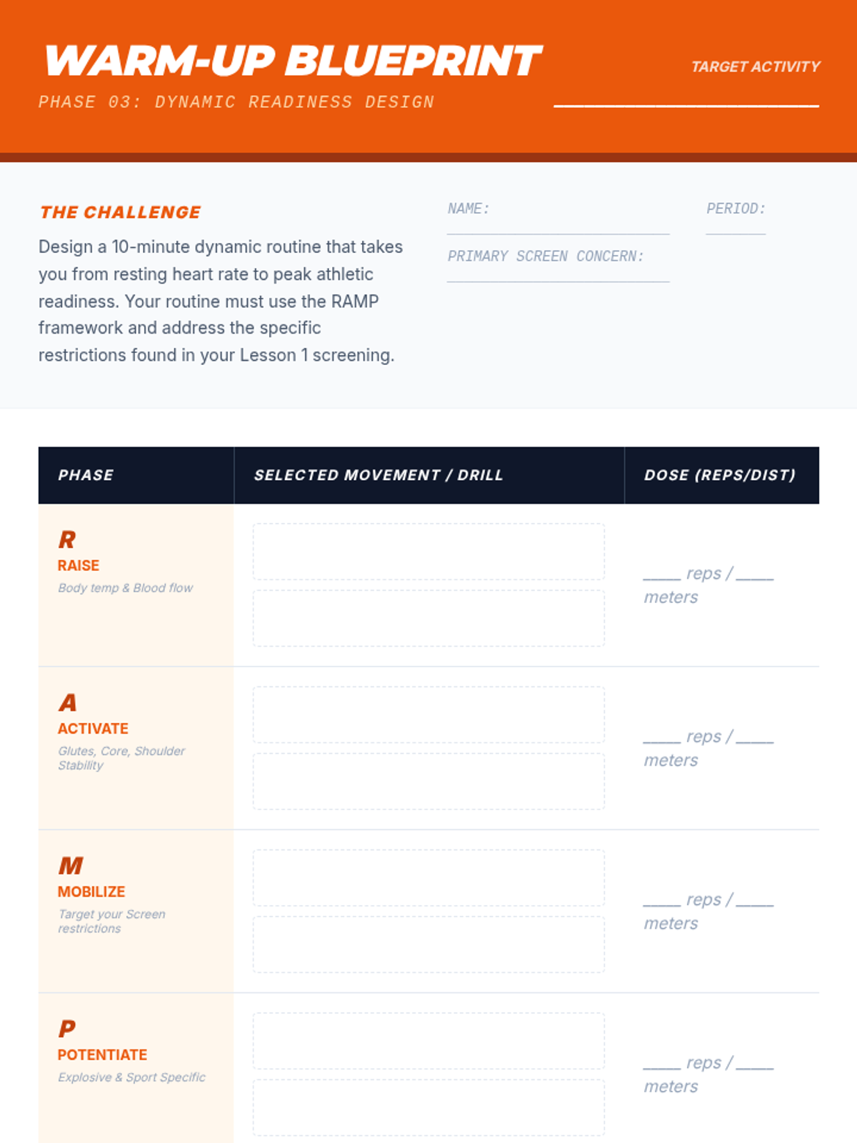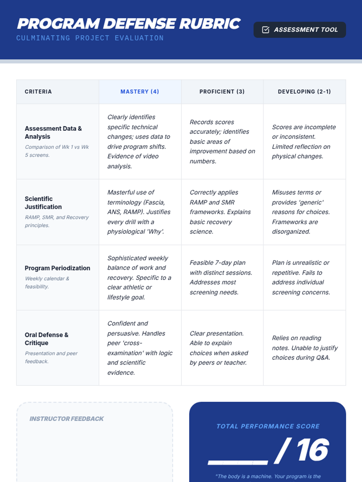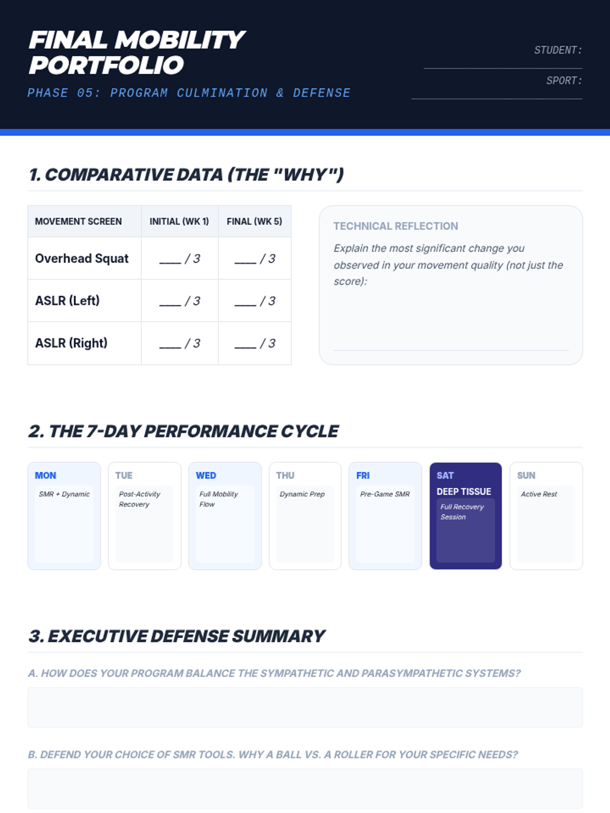 A 12th-grade workshop-style sequence where students move from movement screening and soft tissue work to designing and defending a personalized mobility and recovery program for lifelong athletic health.