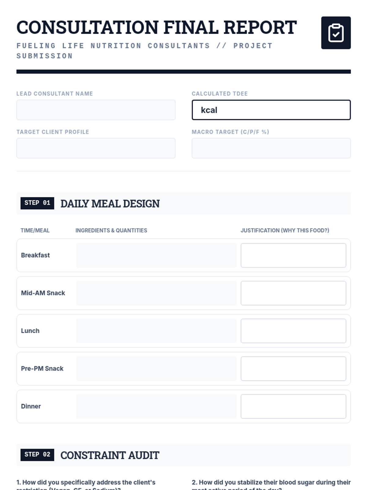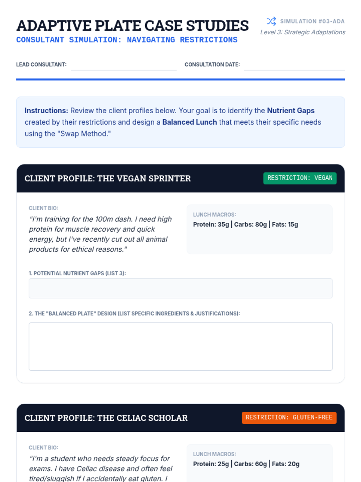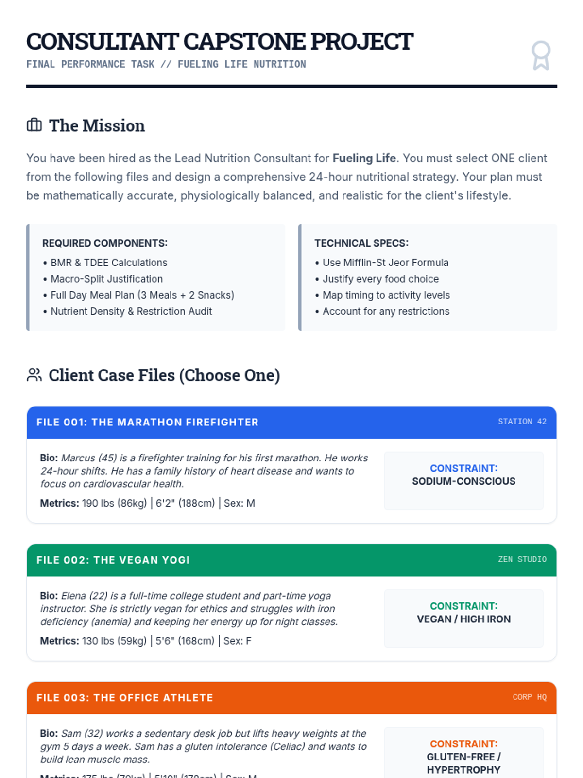A comprehensive 10th-grade nutrition sequence where students act as consultants, moving from metabolic mathematics to personalized meal design for diverse lifestyles and dietary needs.