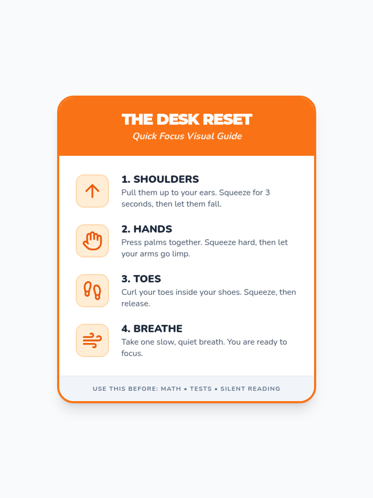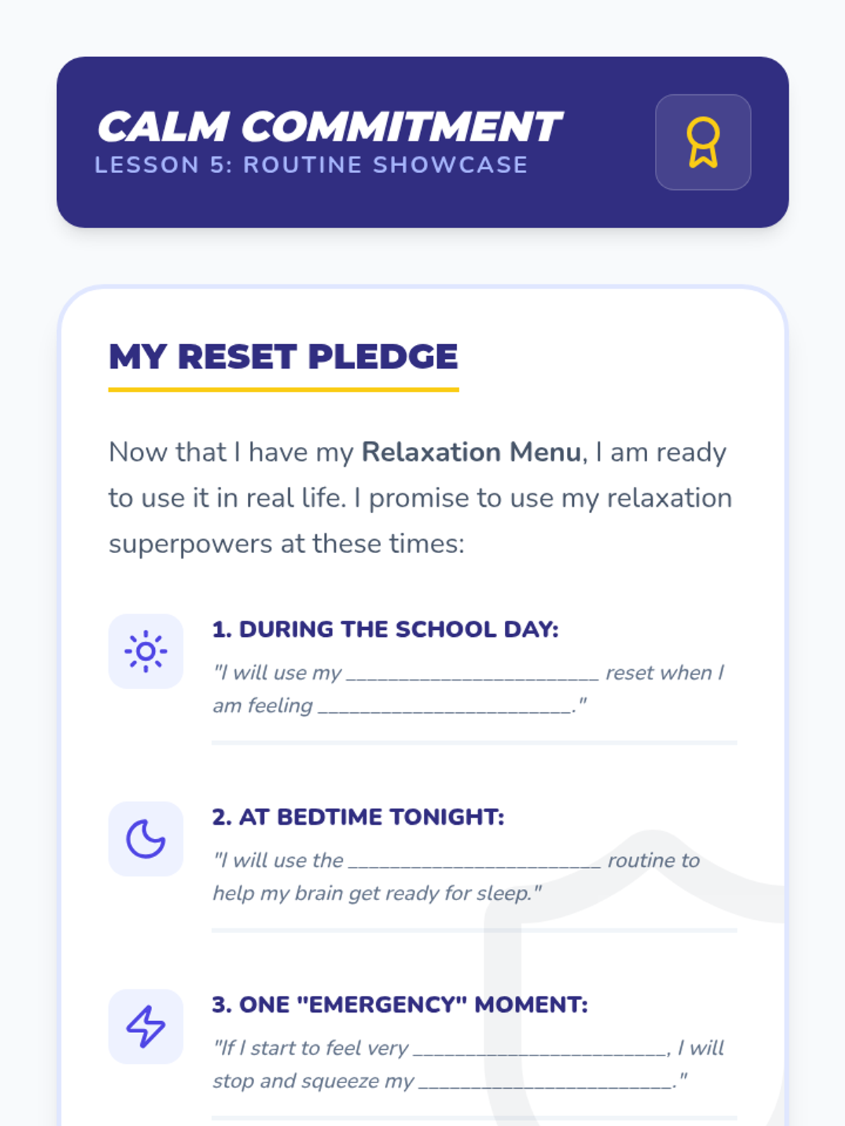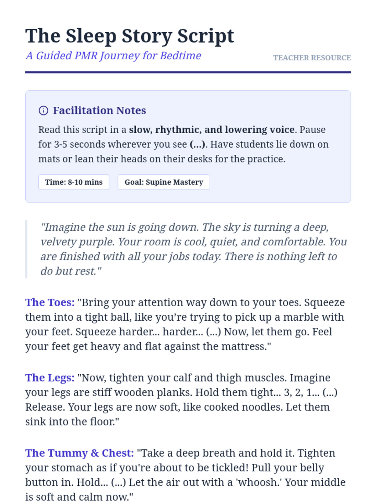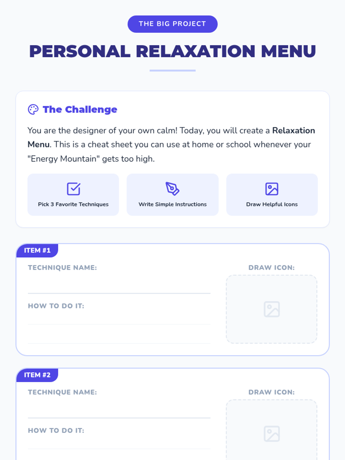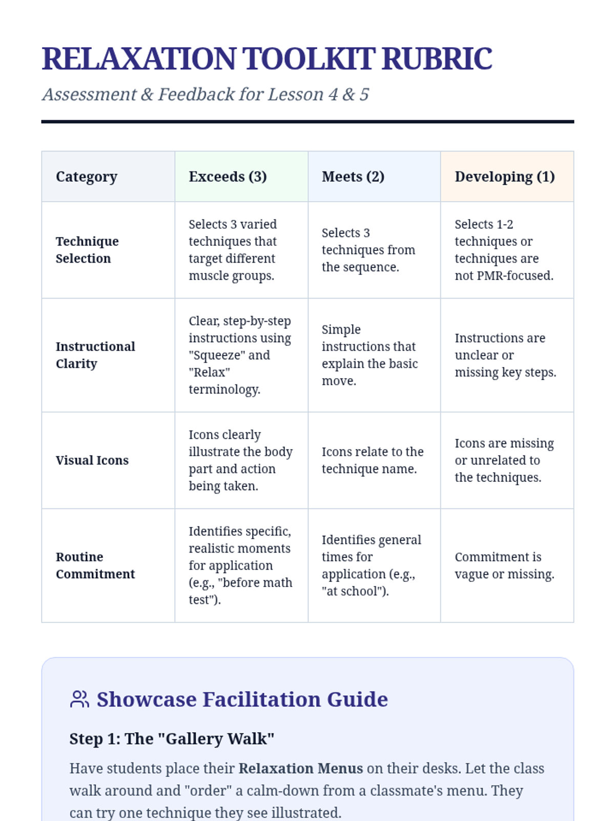 A project-based sequence for 4th graders to master Progressive Muscle Relaxation (PMR). Students analyze their energy cycles, learn specific PMR techniques for sleep and focus, and create a personalized 'Relaxation Menu' to integrate these habits into their daily lives.