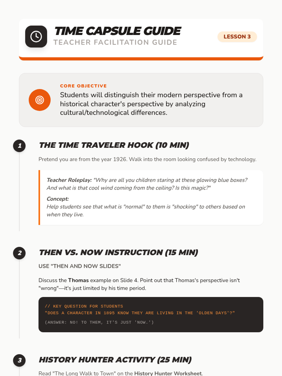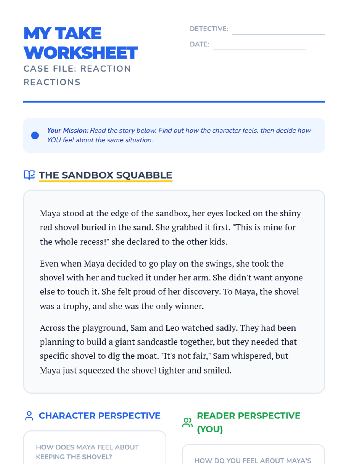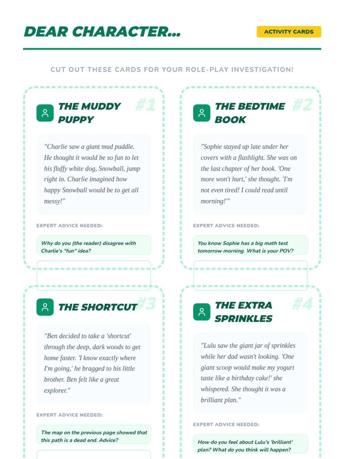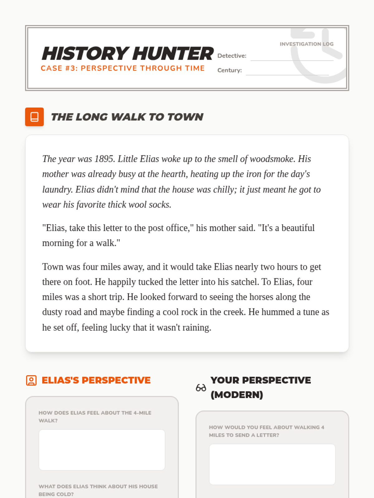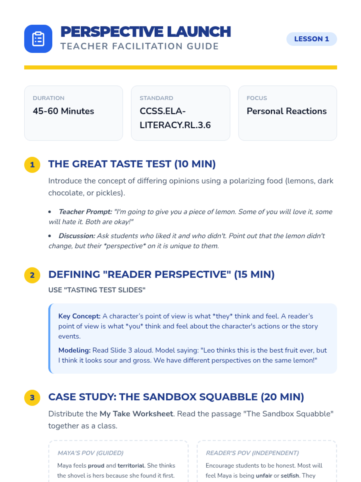 A 3rd-grade ELA sequence focused on distinguishing the reader's perspective from the characters' perspectives. Students explore personal reactions, reader knowledge vs. character knowledge, historical context, and role-playing advice.