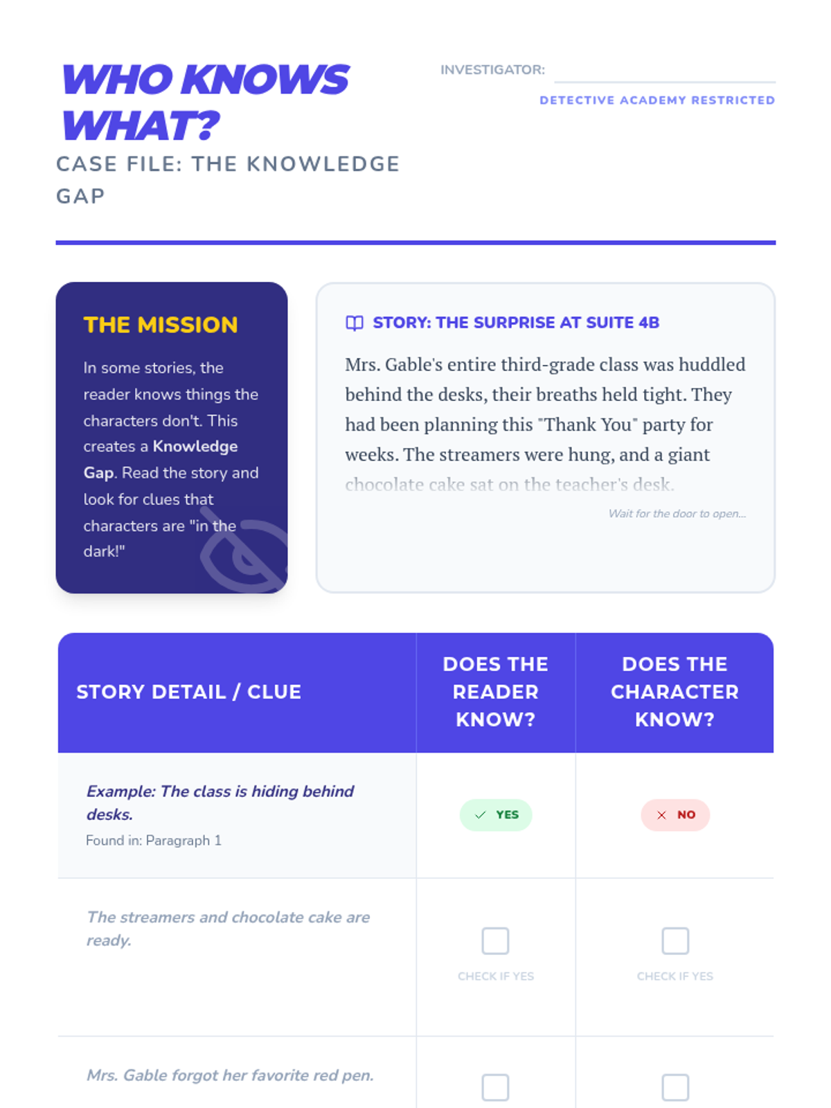 A unit focused on play structure, fluency, and social-emotional problem solving through mystery-themed scripts. Students analyze plot elements while practicing performance skills.