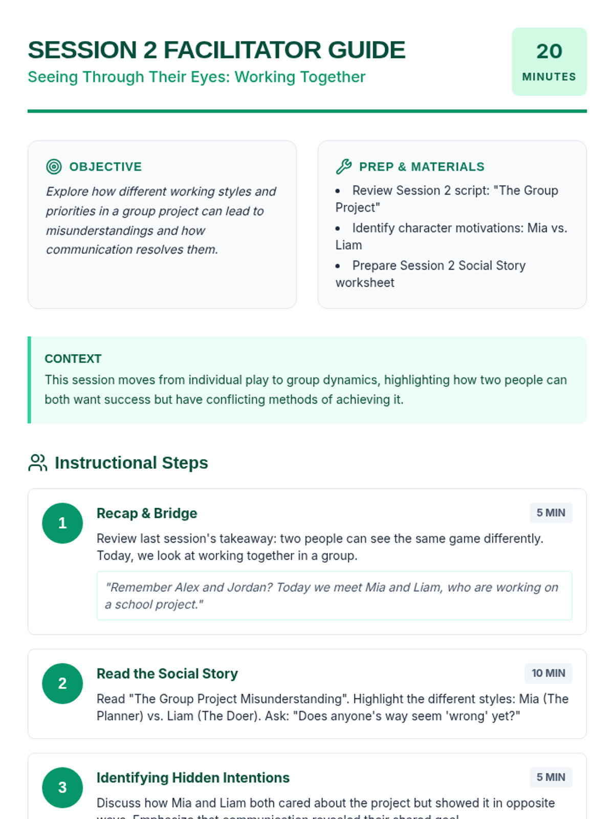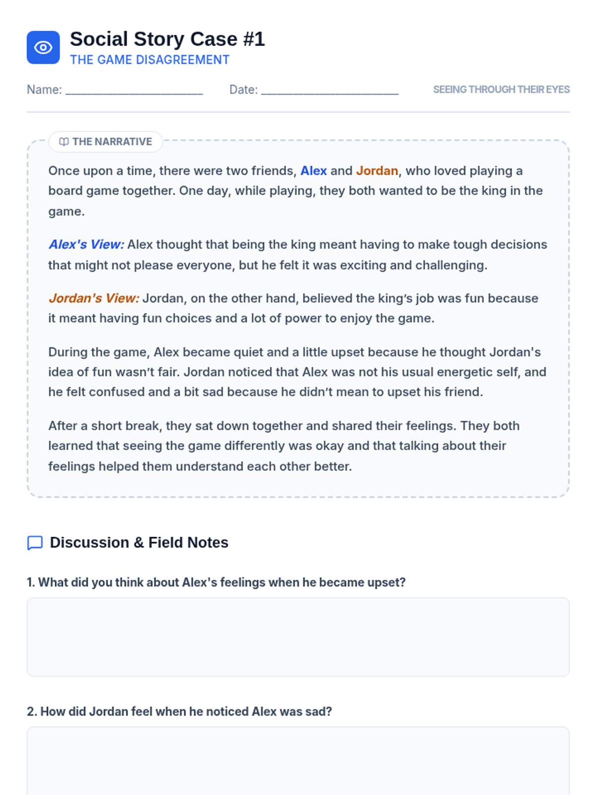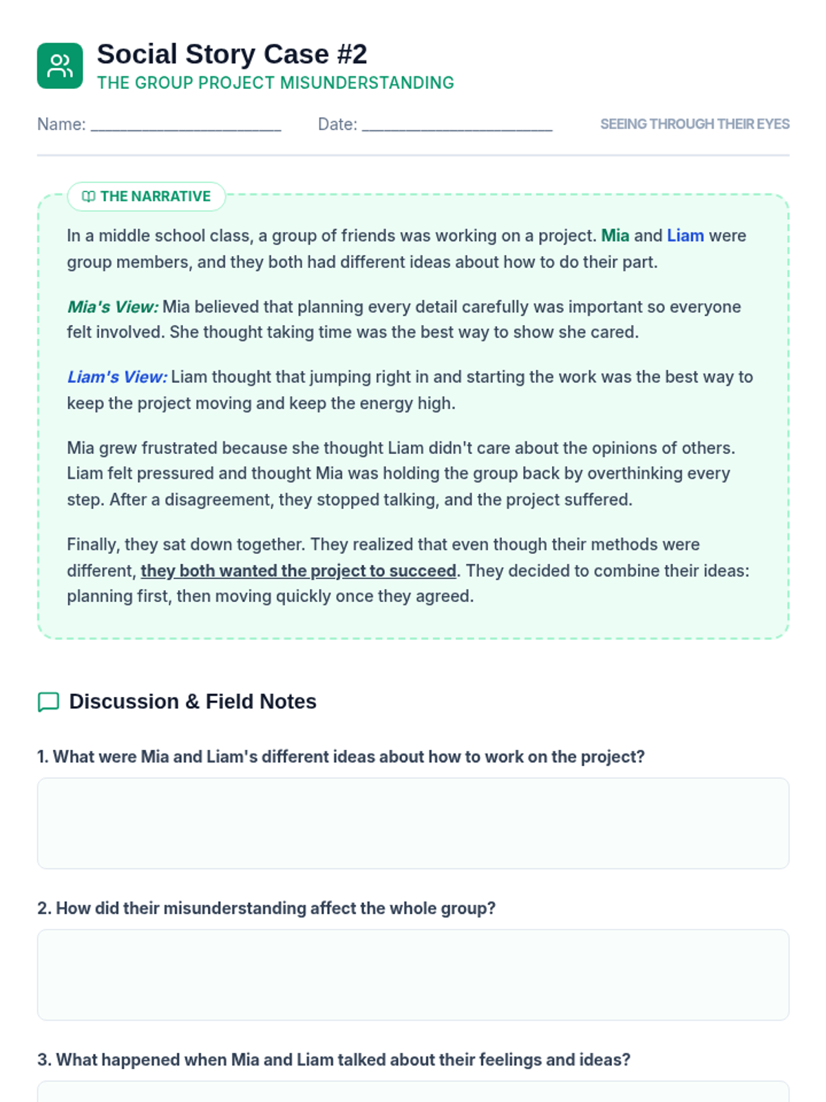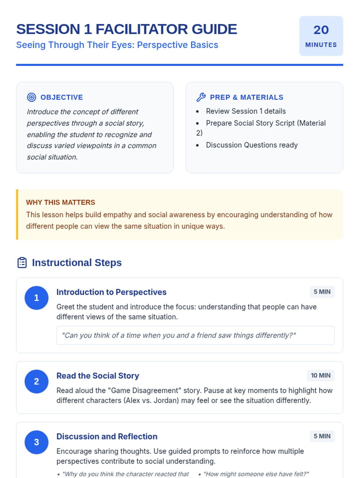A four-session Tier 3 intervention for 6th grade students designed to build empathy and social awareness through the use of tailored social stories. Students explore varied perspectives in common social situations, culminating in creating their own social story to demonstrate mastery of perspective-taking.